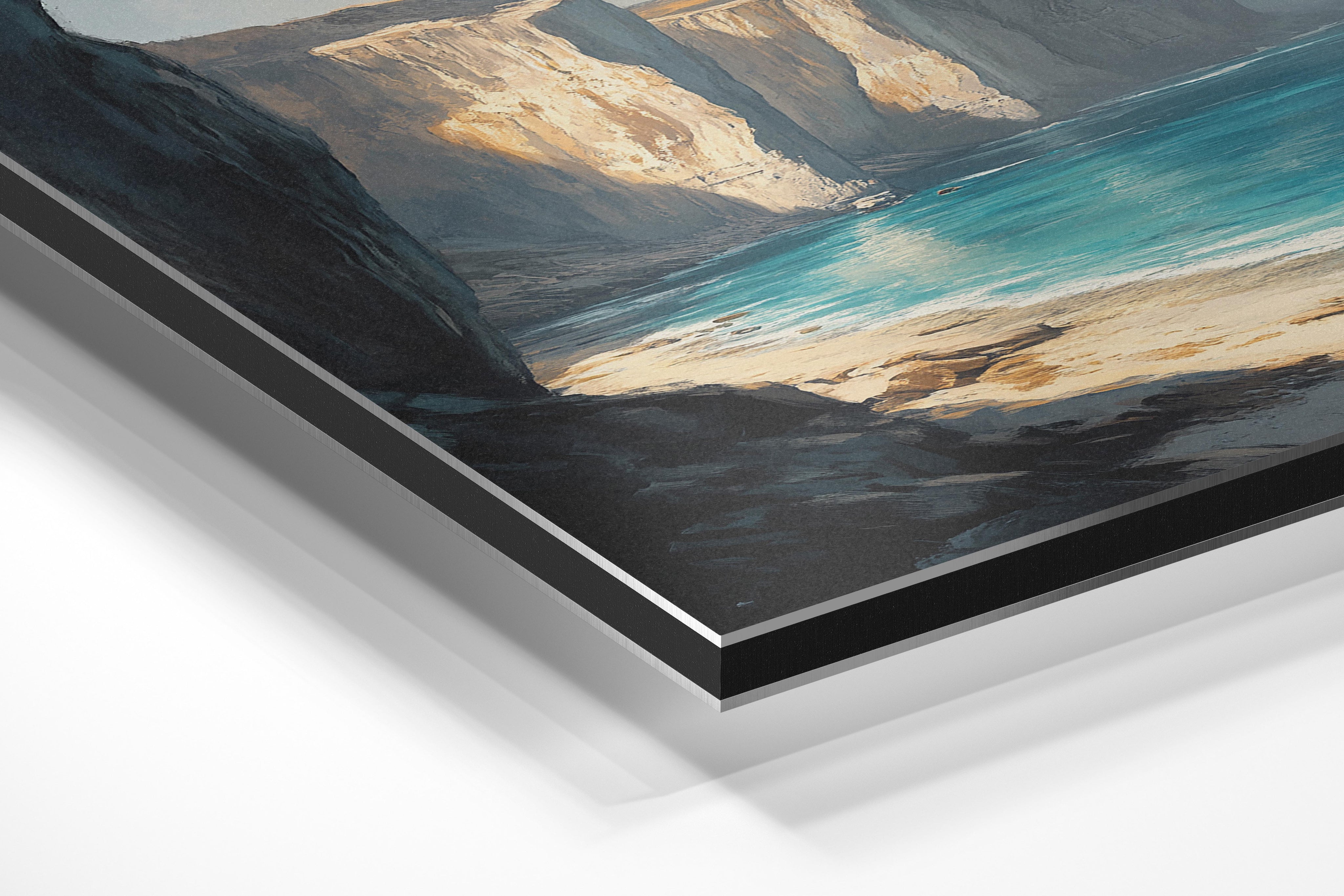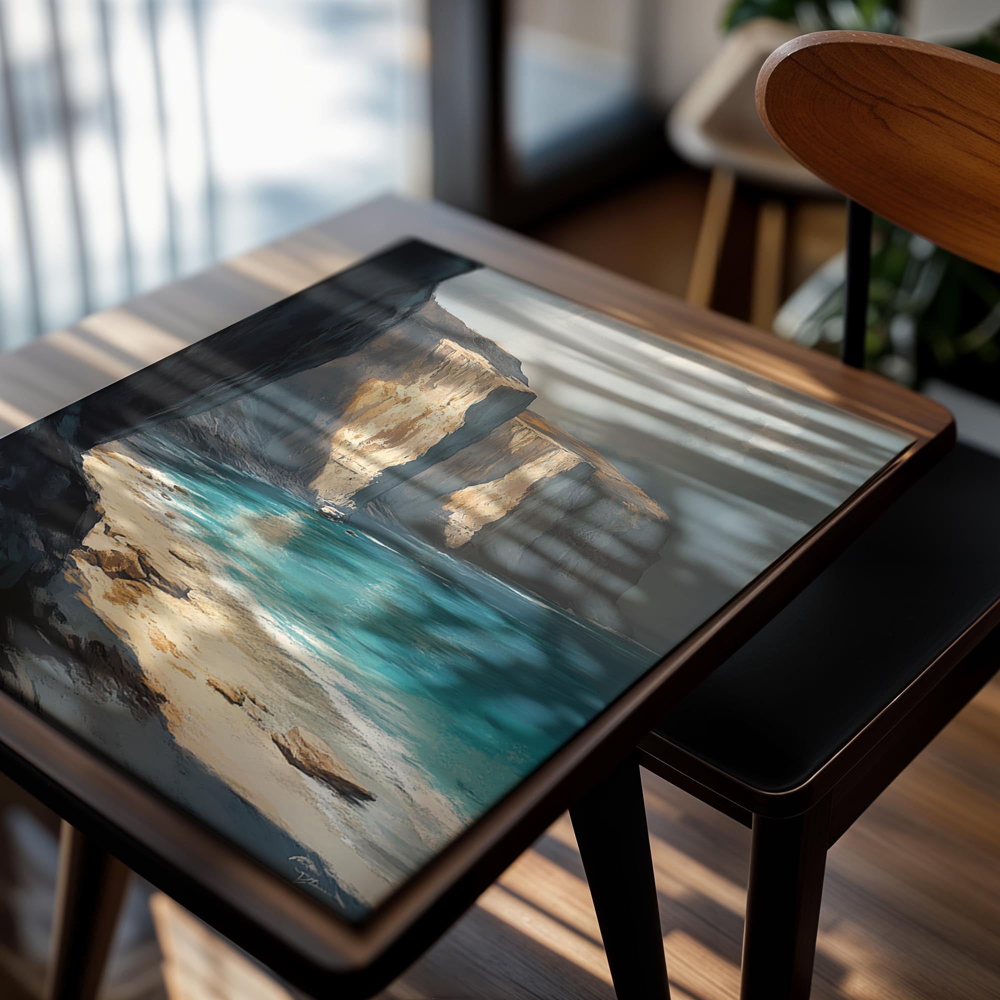 Dramatic coastal cliffs rise majestically above the turquoise waters, with waves crashing at their base, showcasing nature’s power and raw beauty. The towering cliffs are highlighted by soft sunlight that adds a golden glow to their rugged faces. This striking landscape is perfect for themes of adventure, resilience, and the grandeur of the natural world. Ideal for travel promotions or environmental campaigns, it evokes a sense of awe and connection with the wild, untouched coastlines of the world.