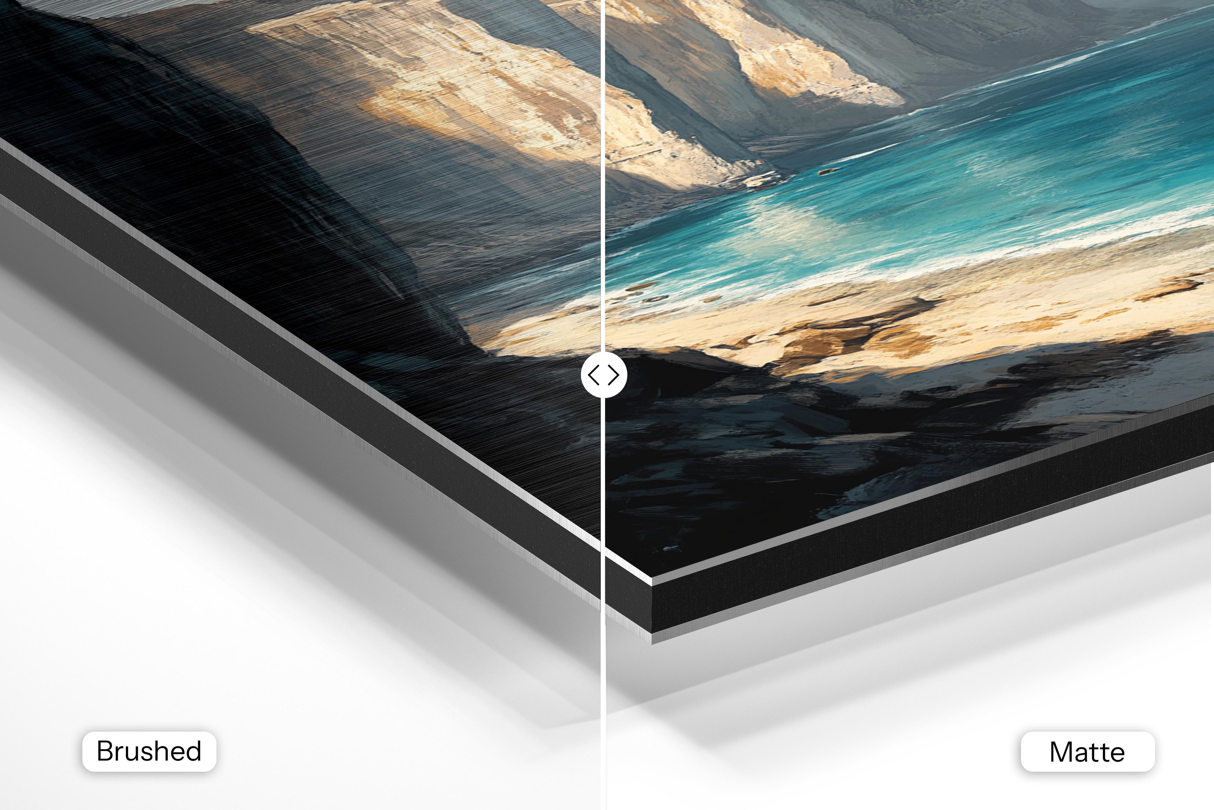 - Brushed Aluminum, on the other hand, features a raw metallic texture with visible brush strokes. Whites and highlights in your image let the silver surface show through, adding a dramatic, shimmering effect. Ideal for black-and-white images, minimalist designs, or abstract art, it creates a bold, industrial vibe with a modern edge.