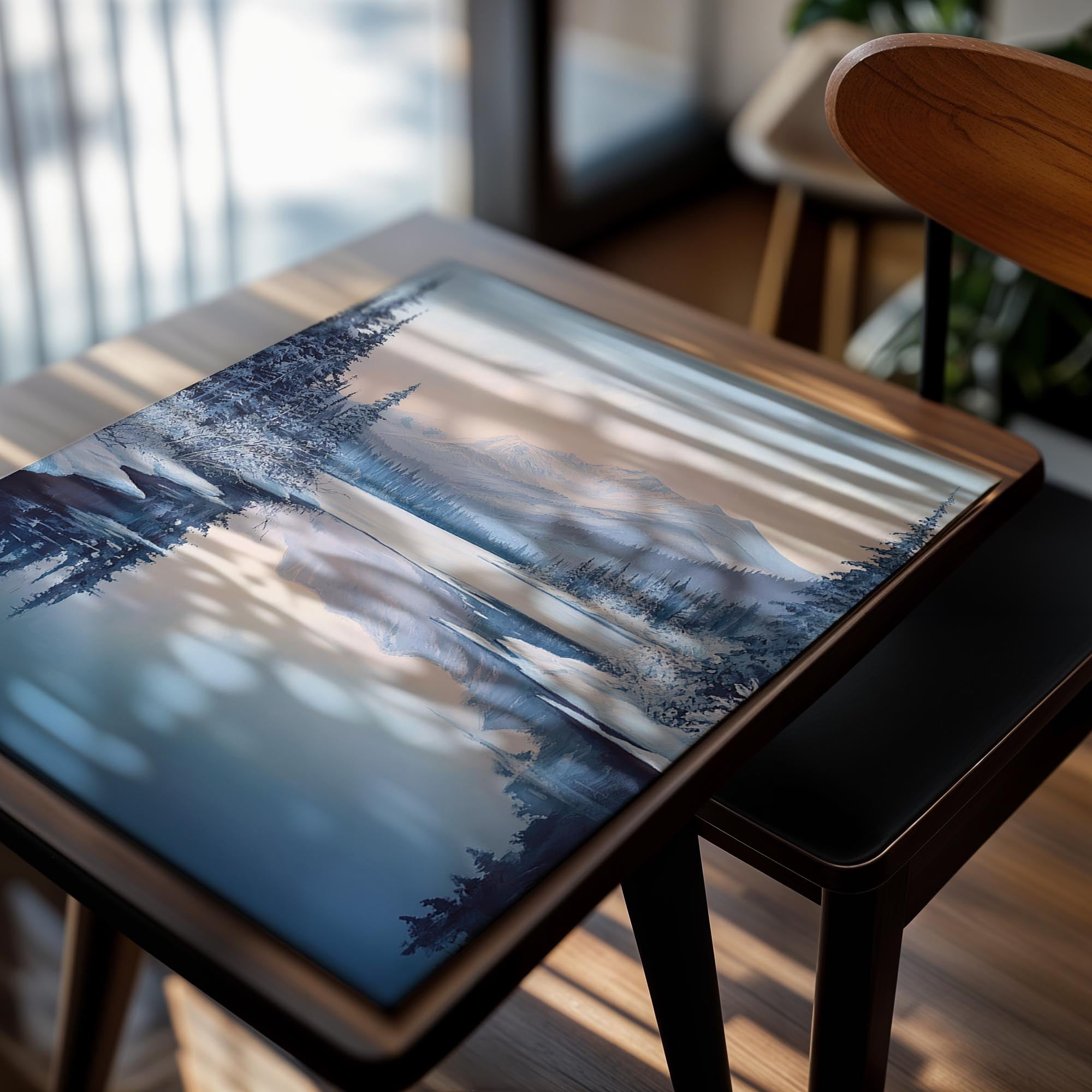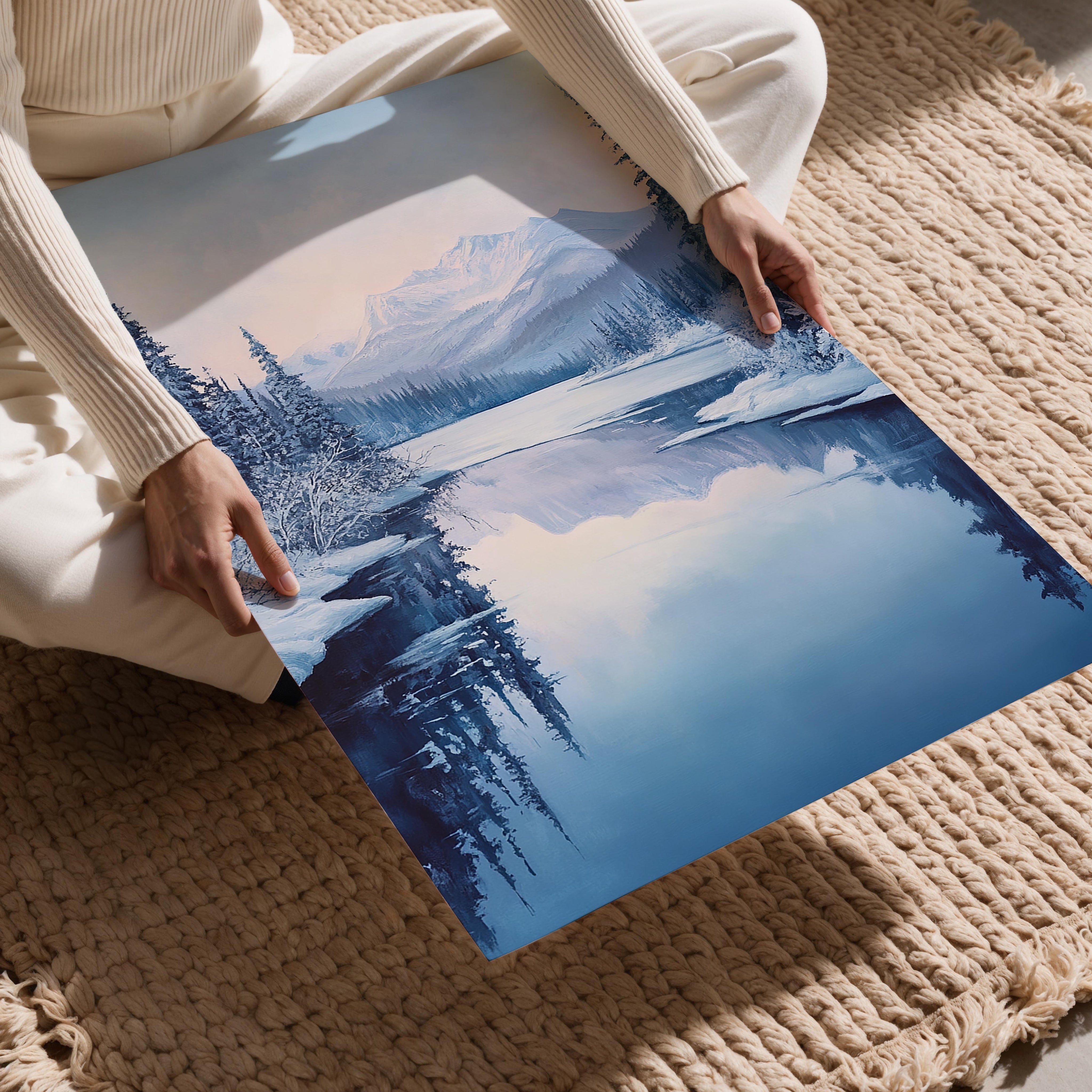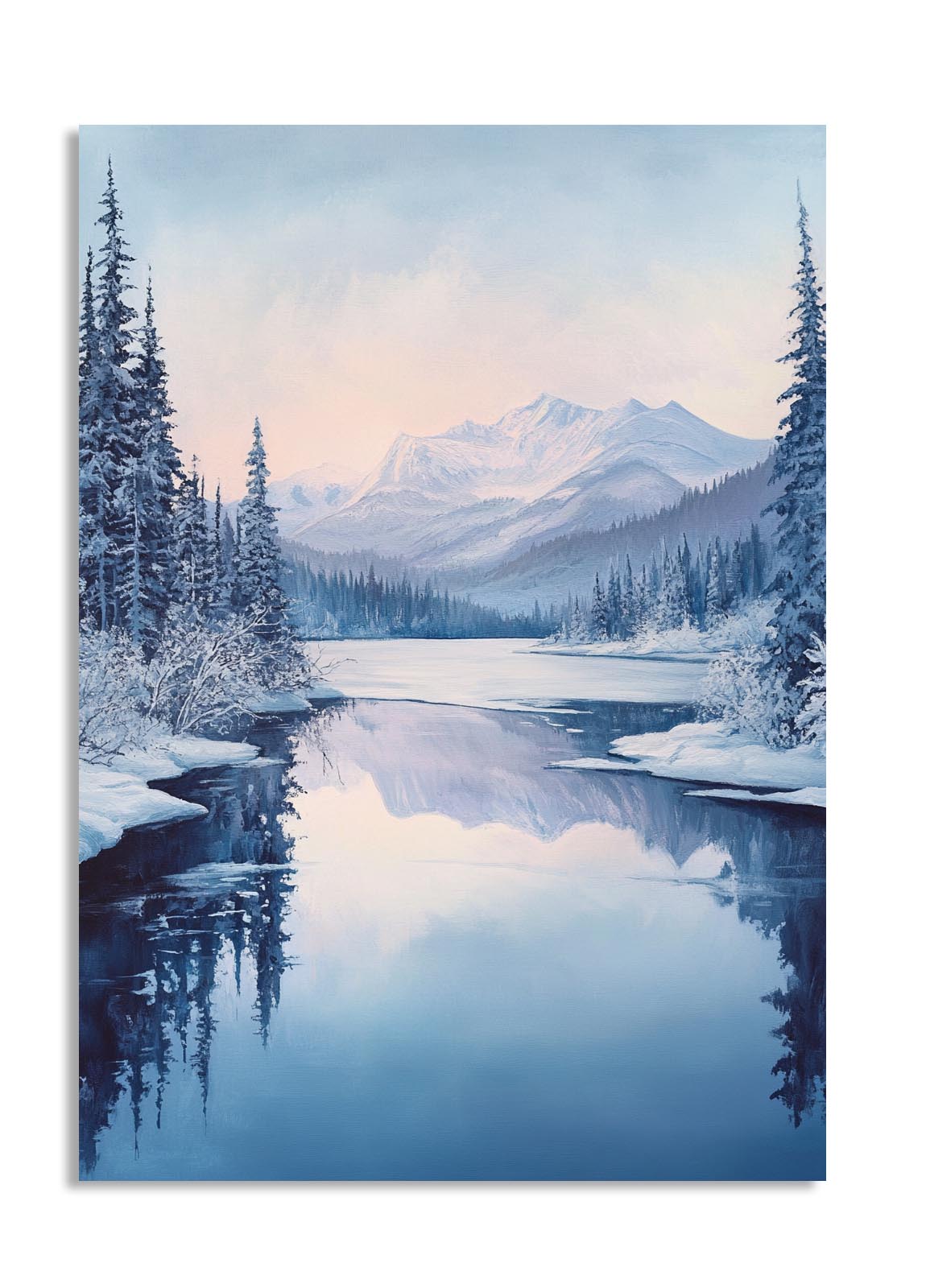 This peaceful alpine scene features a calm lake surrounded by frost-covered trees, creating a serene winter landscape that exudes tranquility. The subtle pastel tones in the sky blend harmoniously with the cool hues of the water, inviting viewers into a moment of pure relaxation. Perfect for nature enthusiasts or anyone seeking a calming aesthetic, this image highlights the pristine stillness of winter in the mountains. Its gentle composition and soothing atmosphere make it a versatile choice for home decor, digital art, or seasonal campaigns.