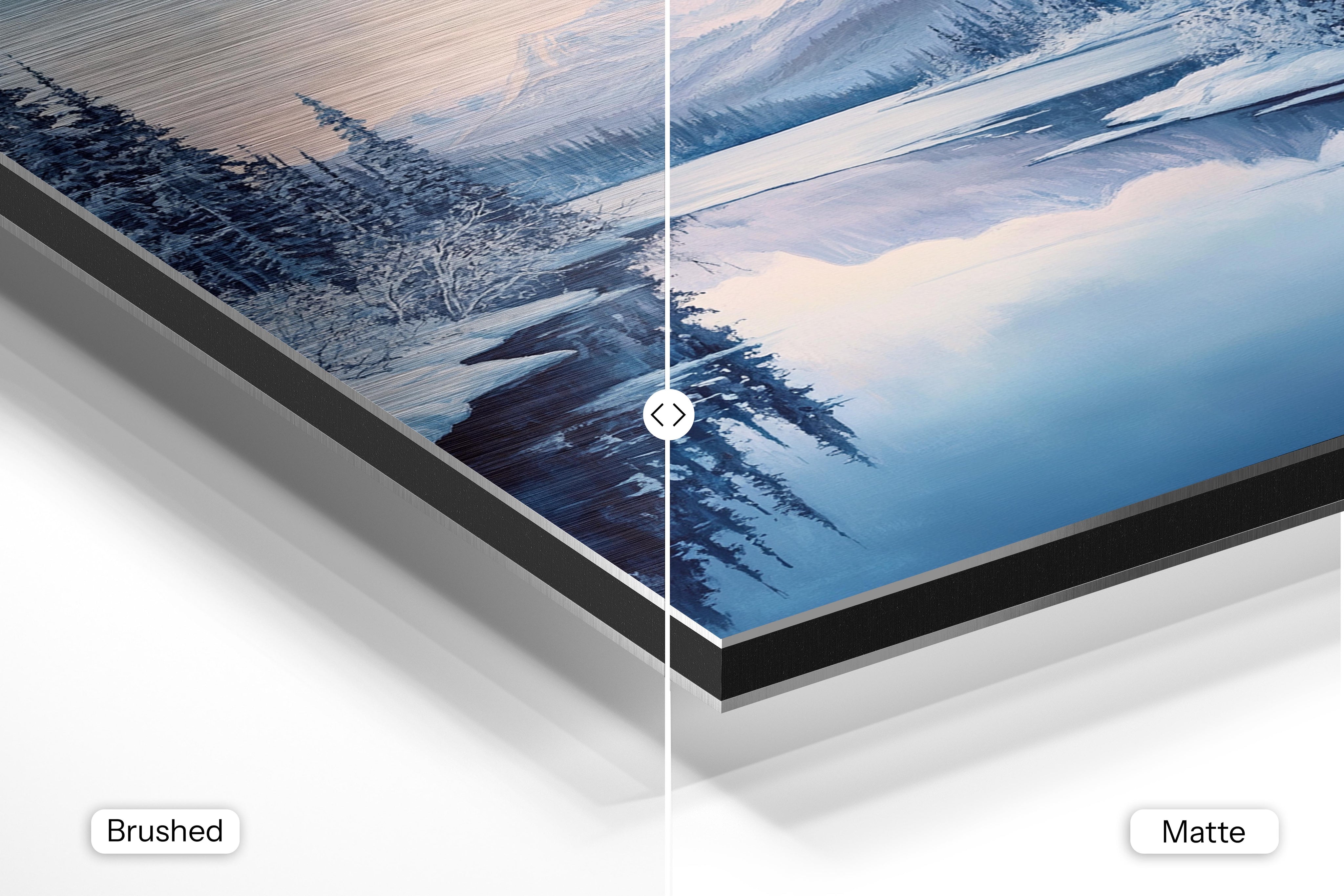 - Brushed Aluminum, on the other hand, features a raw metallic texture with visible brush strokes. Whites and highlights in your image let the silver surface show through, adding a dramatic, shimmering effect. Ideal for black-and-white images, minimalist designs, or abstract art, it creates a bold, industrial vibe with a modern edge.
