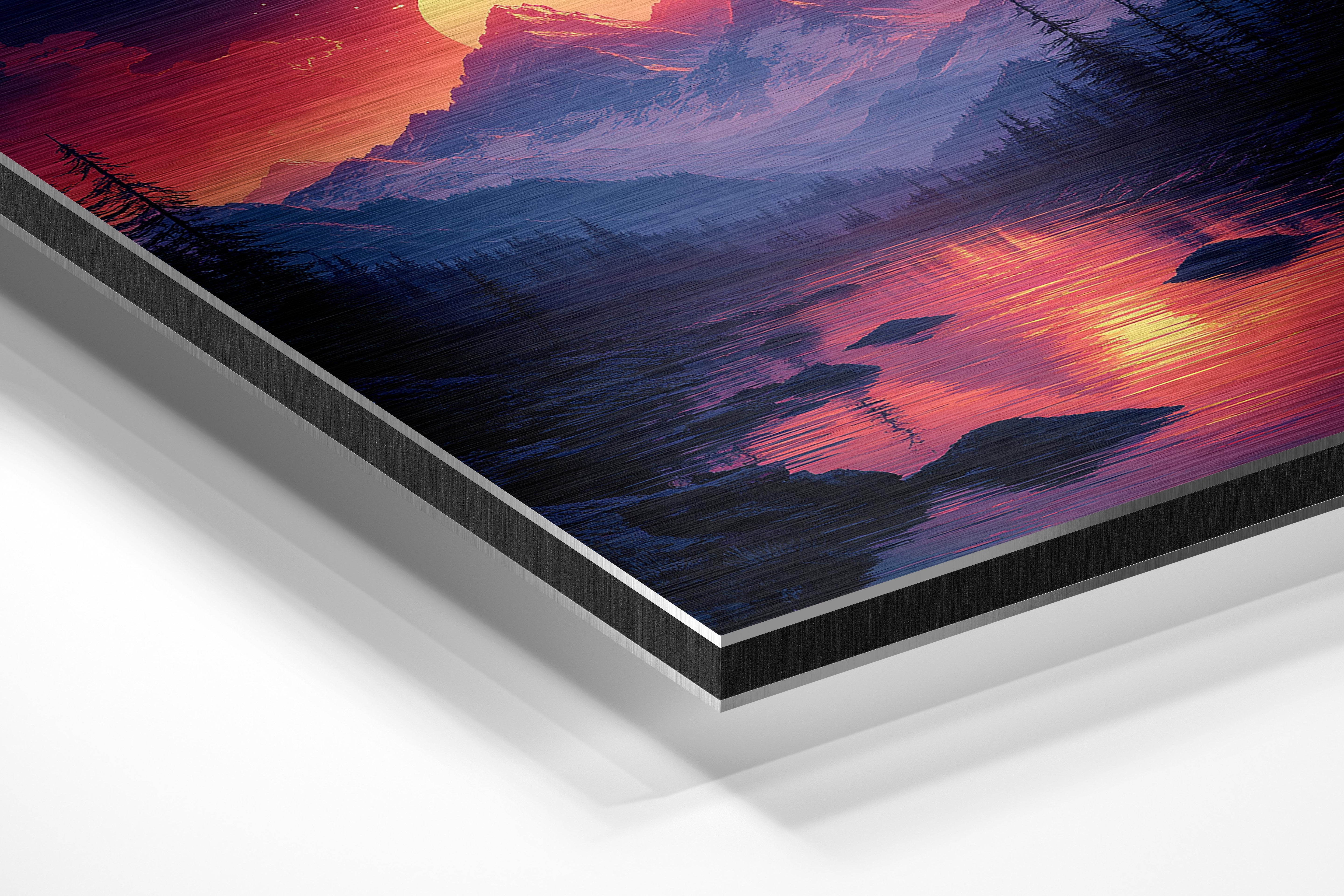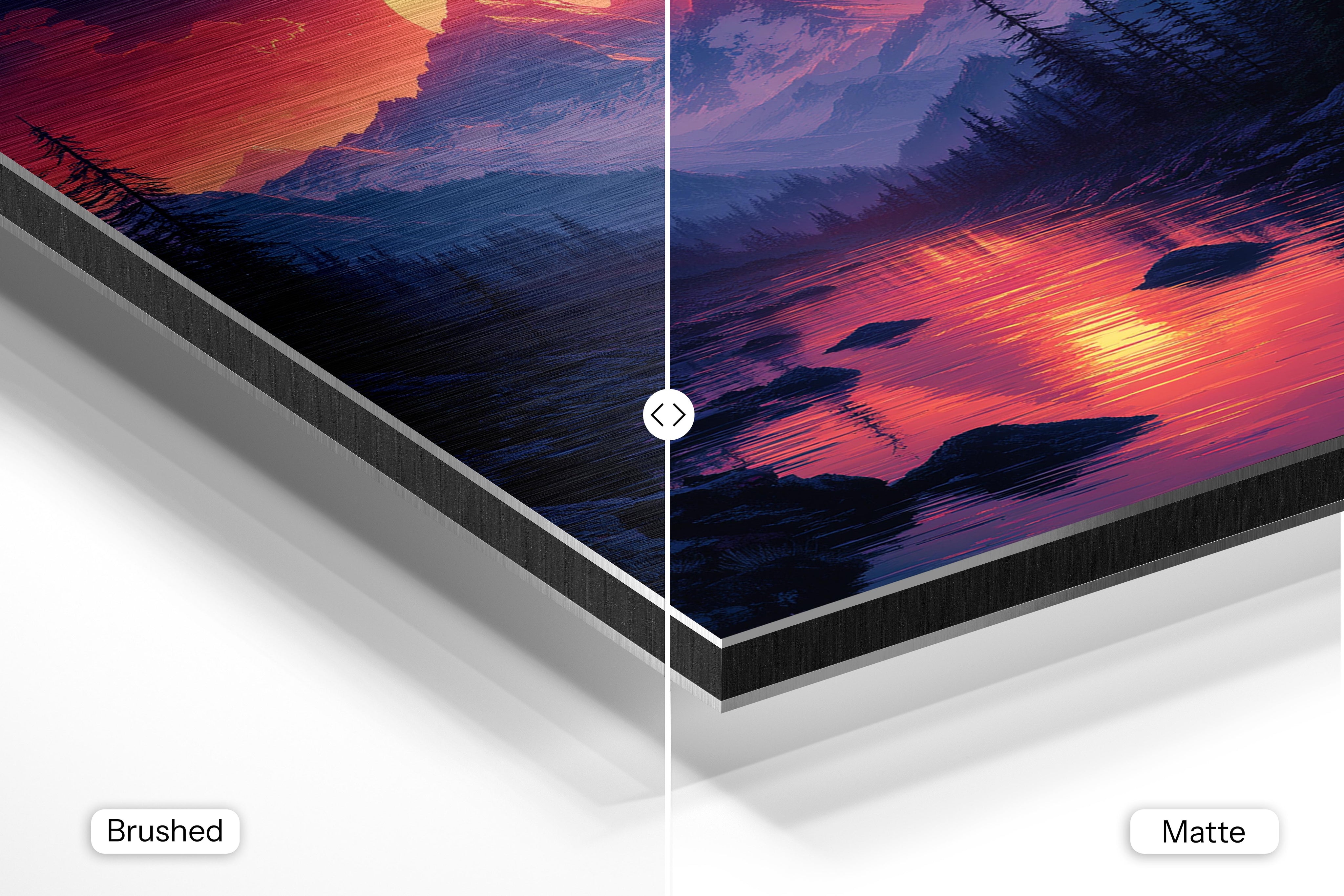 - Brushed Aluminum, on the other hand, features a raw metallic texture with visible brush strokes. Whites and highlights in your image let the silver surface show through, adding a dramatic, shimmering effect. Ideal for black-and-white images, minimalist designs, or abstract art, it creates a bold, industrial vibe with a modern edge.