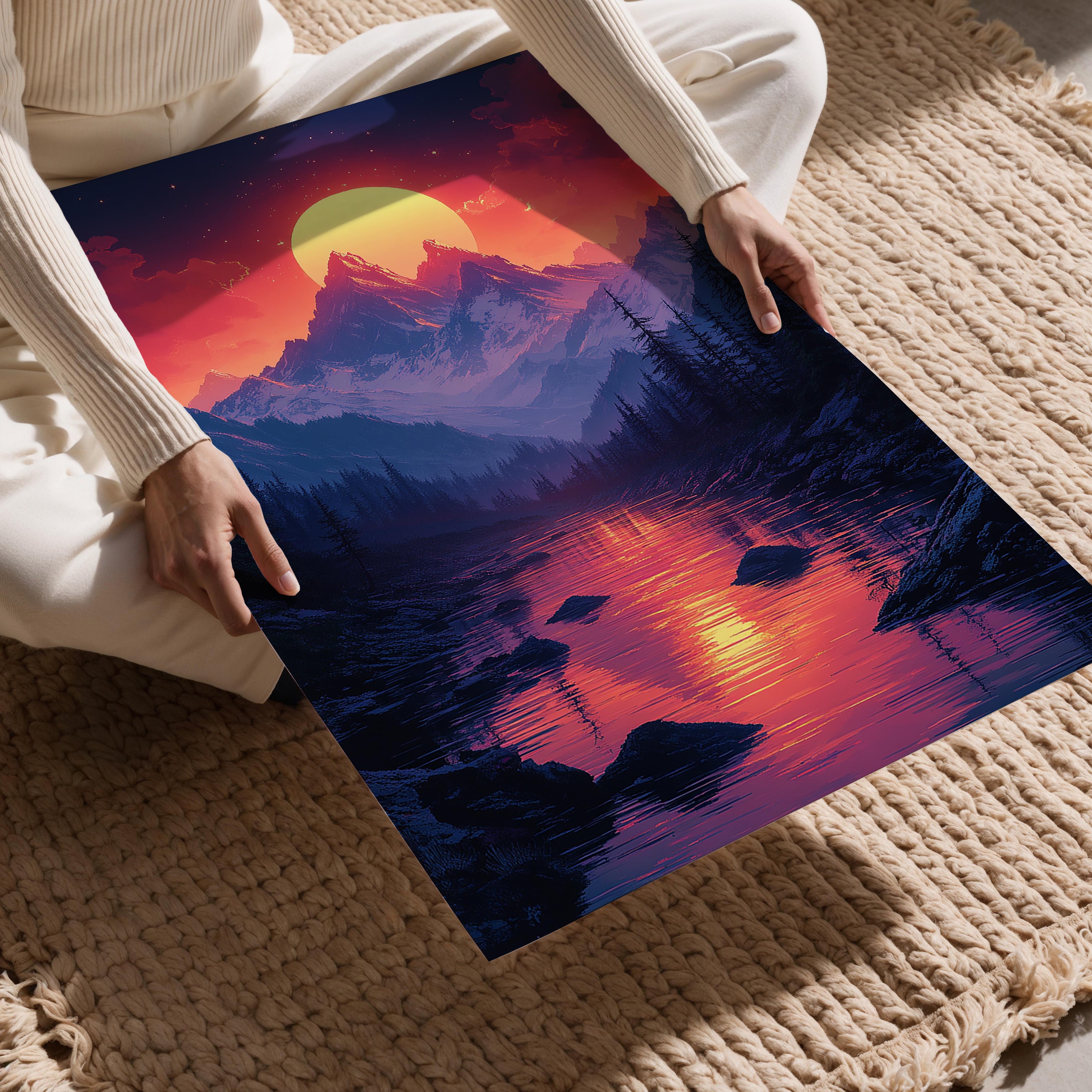 A serene river reflects the fiery hues of a setting sun behind a majestic mountain range. The peaceful atmosphere is enhanced by the glowing sunlight and vibrant colors, making it a captivating choice for calming, nature-themed spaces. Perfect for those seeking art that soothes the soul.