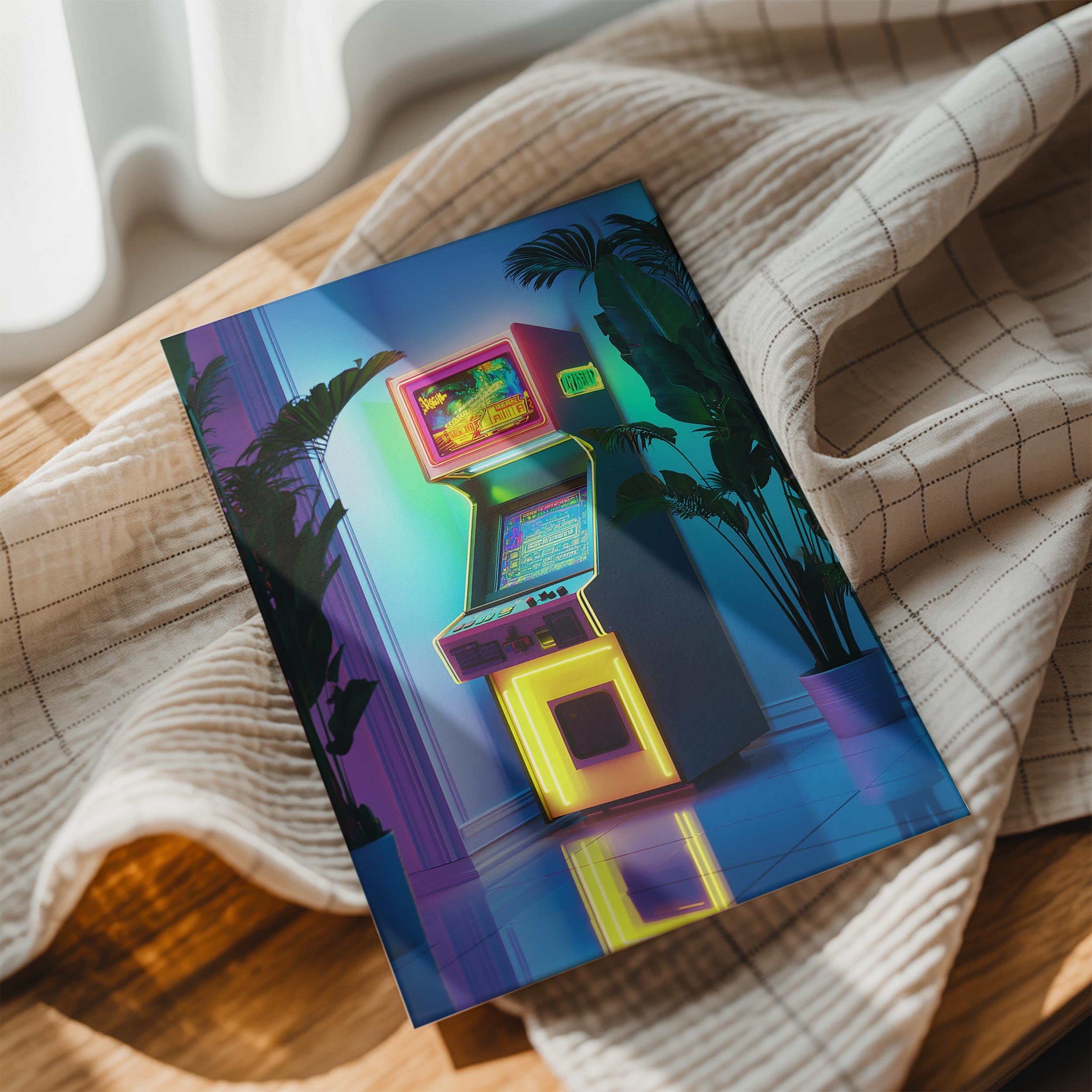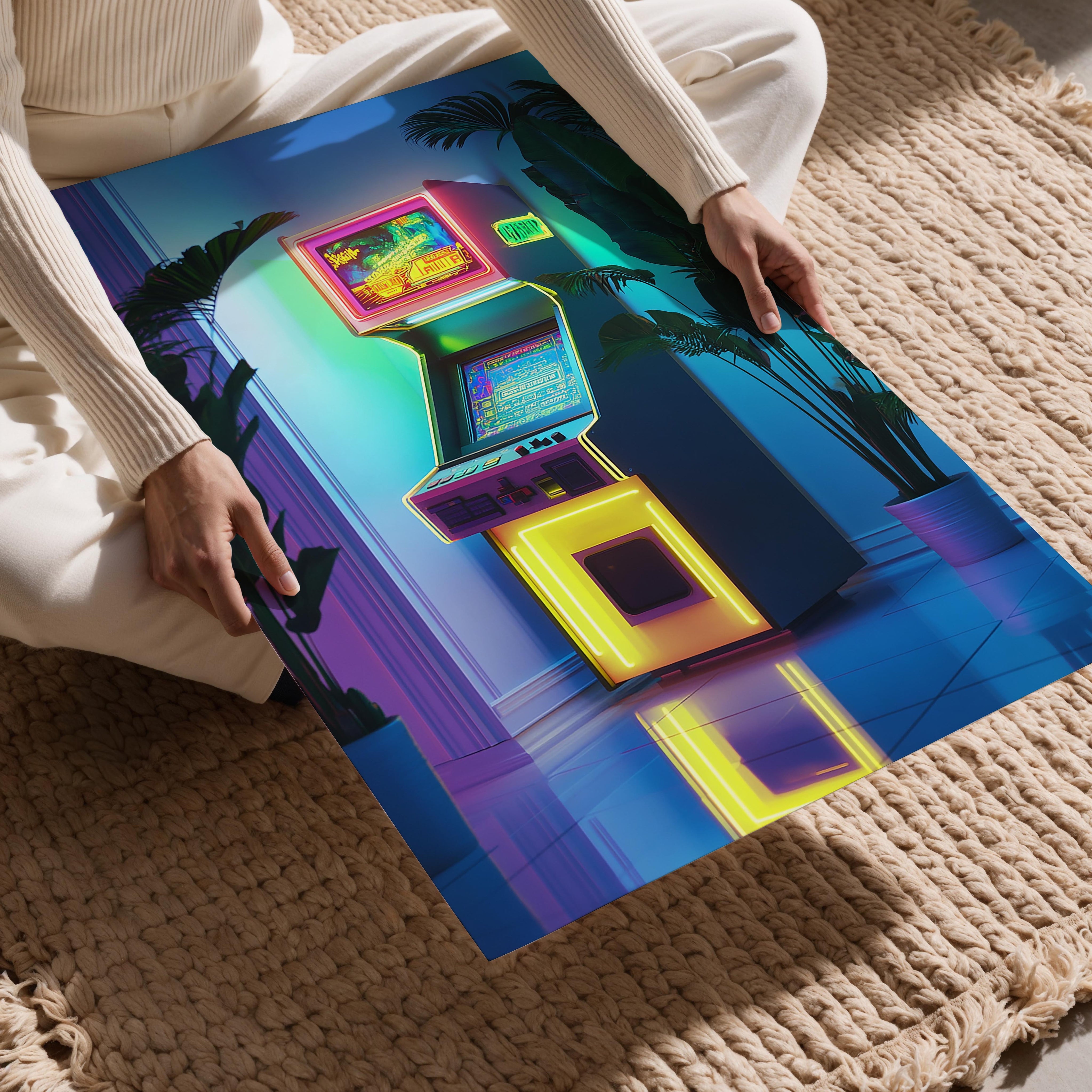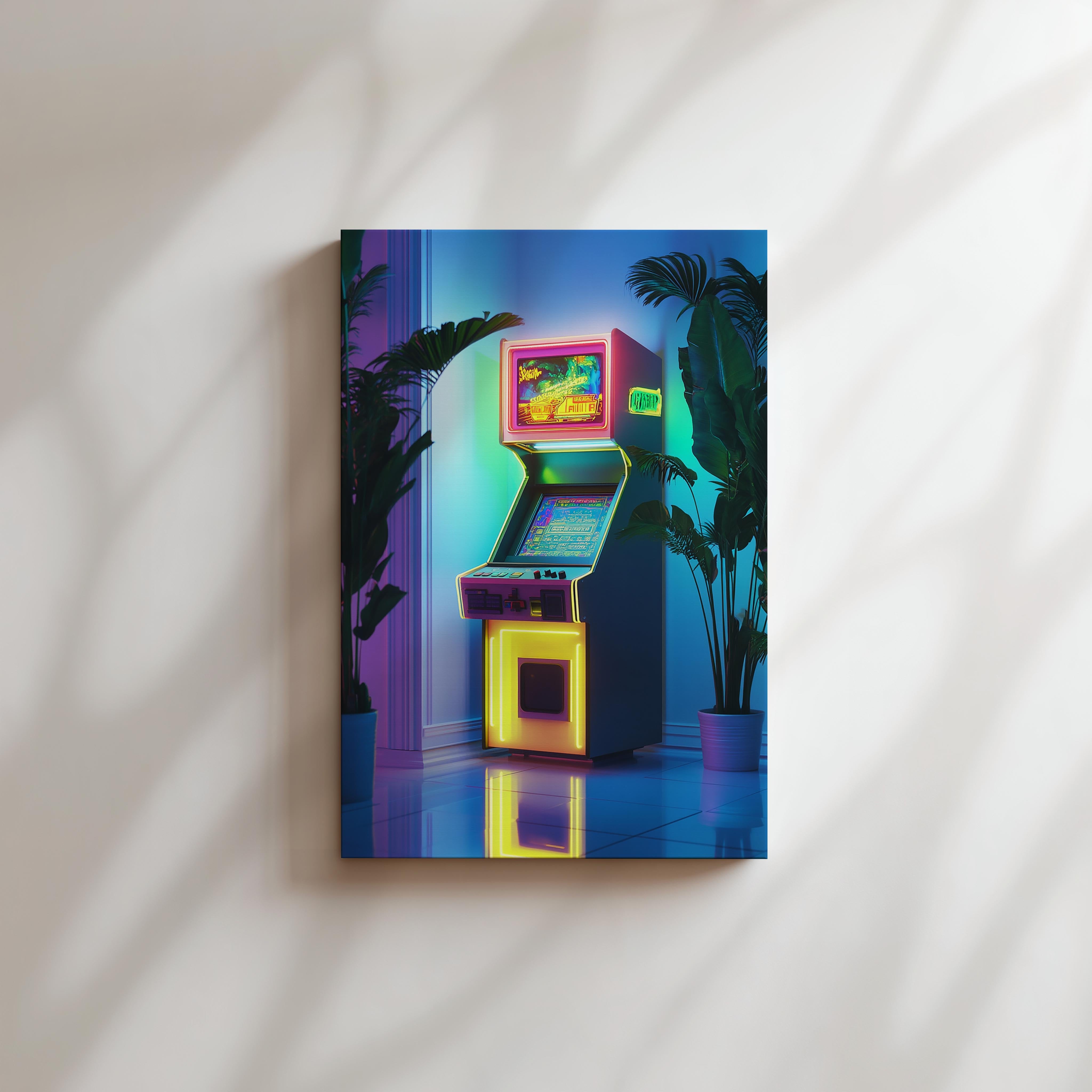 This vibrant piece showcases a brightly lit arcade machine surrounded by lush tropical plants. The neon accents and soft reflections on the tiled floor create a harmonious blend of retro and modern aesthetics. Perfect for a gaming room or recreational space, this artwork exudes an energetic and playful vibe while maintaining a relaxed tropical charm.