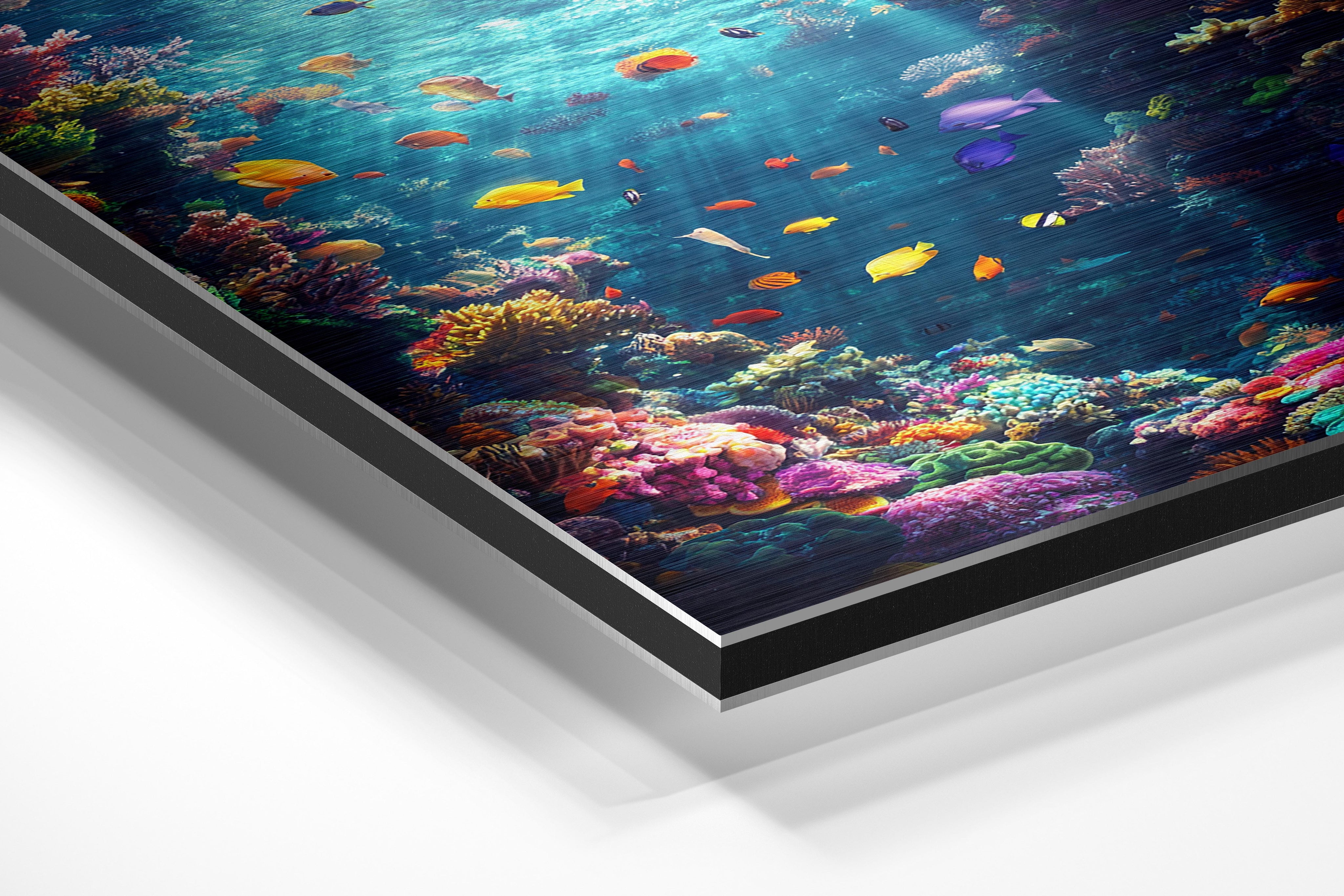A dazzling tropical reef teeming with fish and corals in vivid colors. This vibrant image captures the essence of marine beauty, with its rich palette and lively underwater activity. The intricate patterns of the corals and the graceful movement of the fish create a sense of wonder and excitement. This scene is perfect for those who appreciate the complexity and diversity of marine life. It serves as a visual reminder of the importance of preserving these precious underwater habitats for future generations.