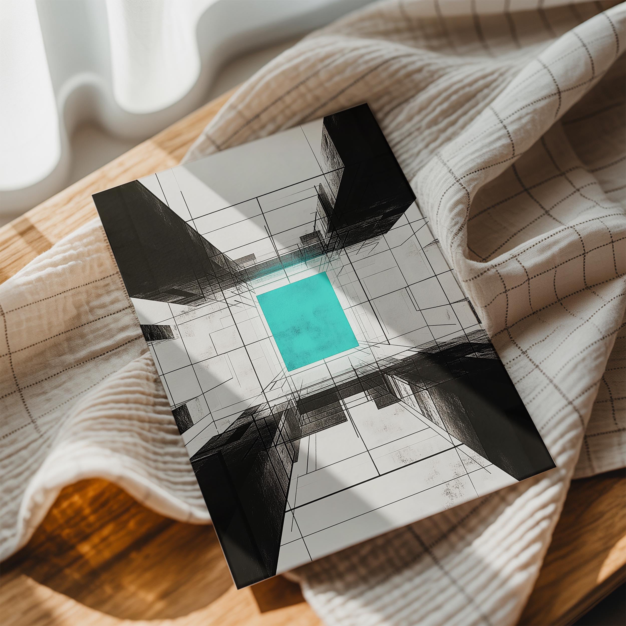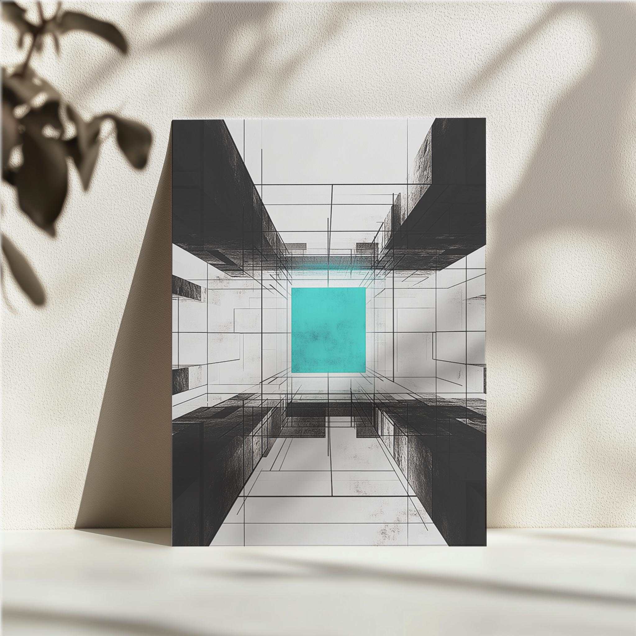 A turquoise glowing center surrounded by abstract, grid-like structures creates a captivating focal point in this piece. The vivid color and geometric precision make it ideal for modern interiors, adding a sense of innovation and tranquility.