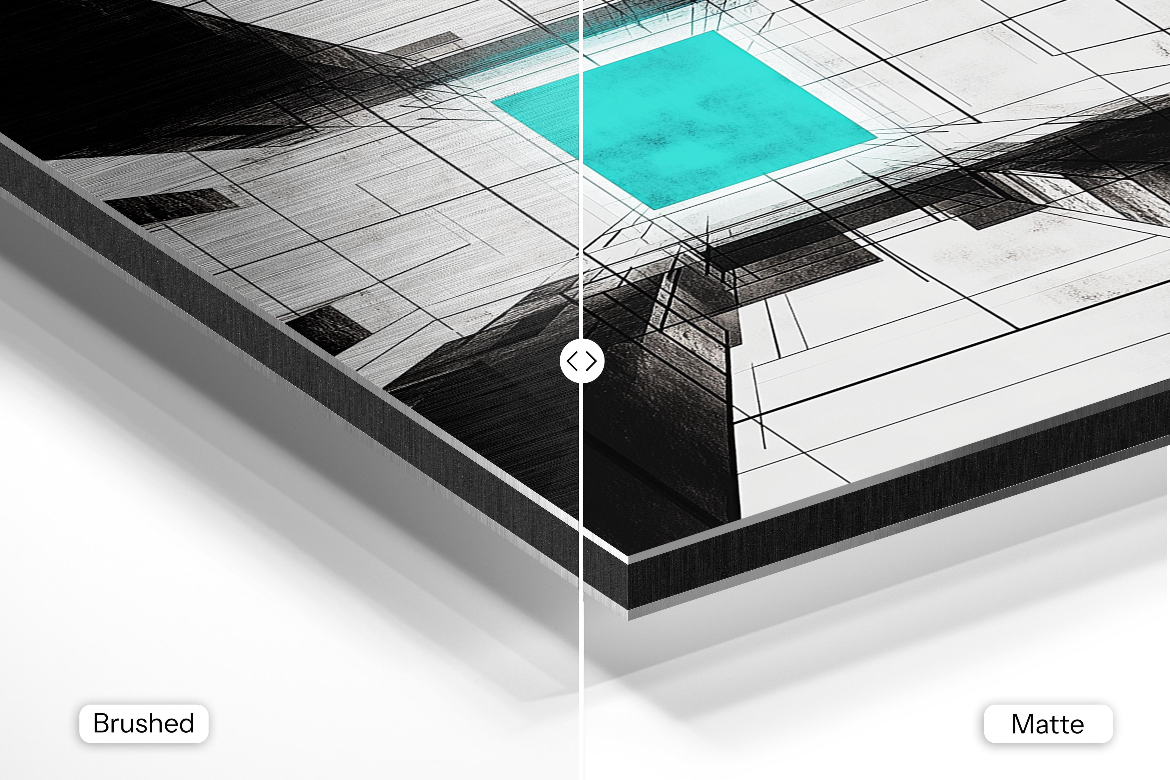 - Brushed Aluminum, on the other hand, features a raw metallic texture with visible brush strokes. Whites and highlights in your image let the silver surface show through, adding a dramatic, shimmering effect. Ideal for black-and-white images, minimalist designs, or abstract art, it creates a bold, industrial vibe with a modern edge.