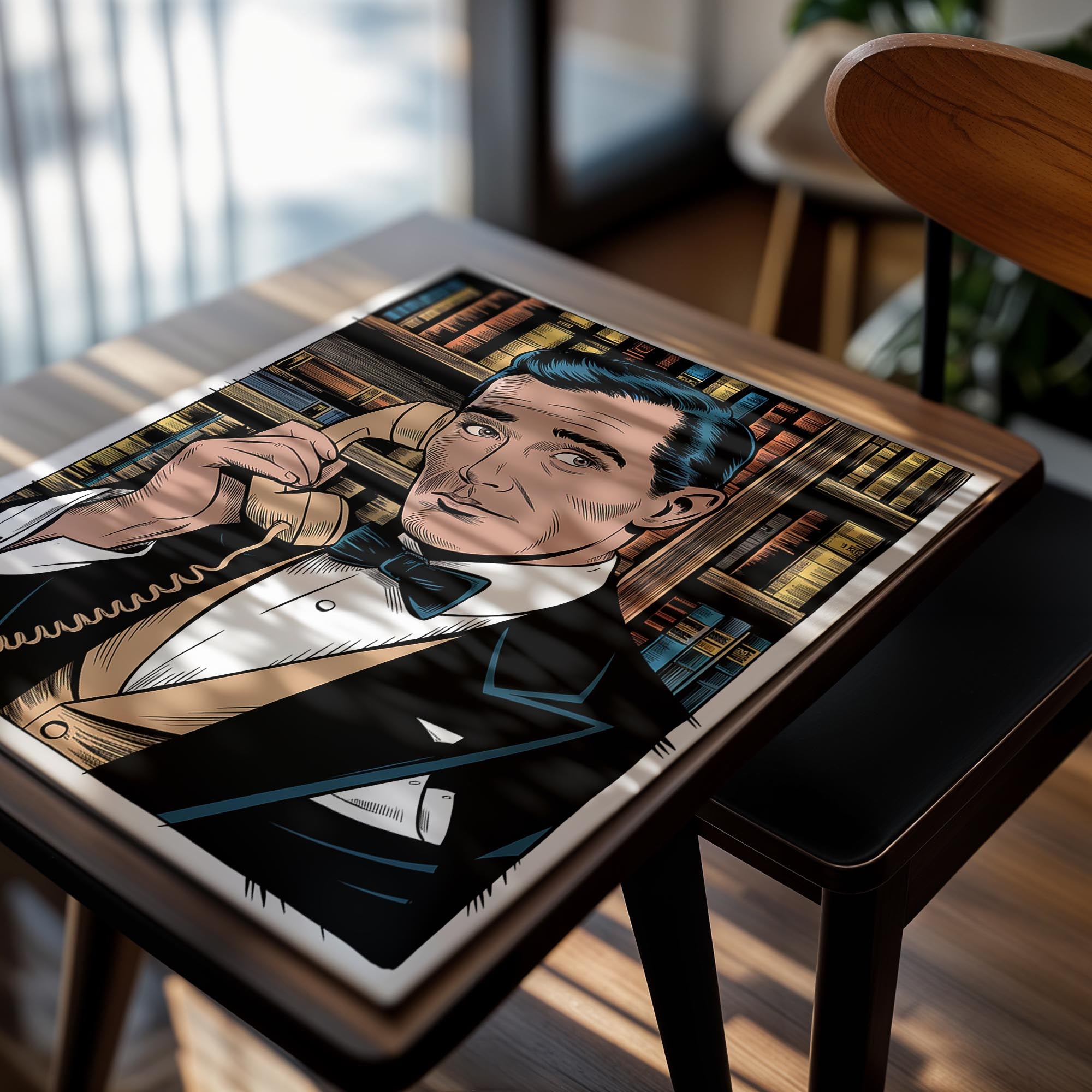 A suave man in a tux on the phone suggests intrigue. Ideal for offices or masculine décor themes.