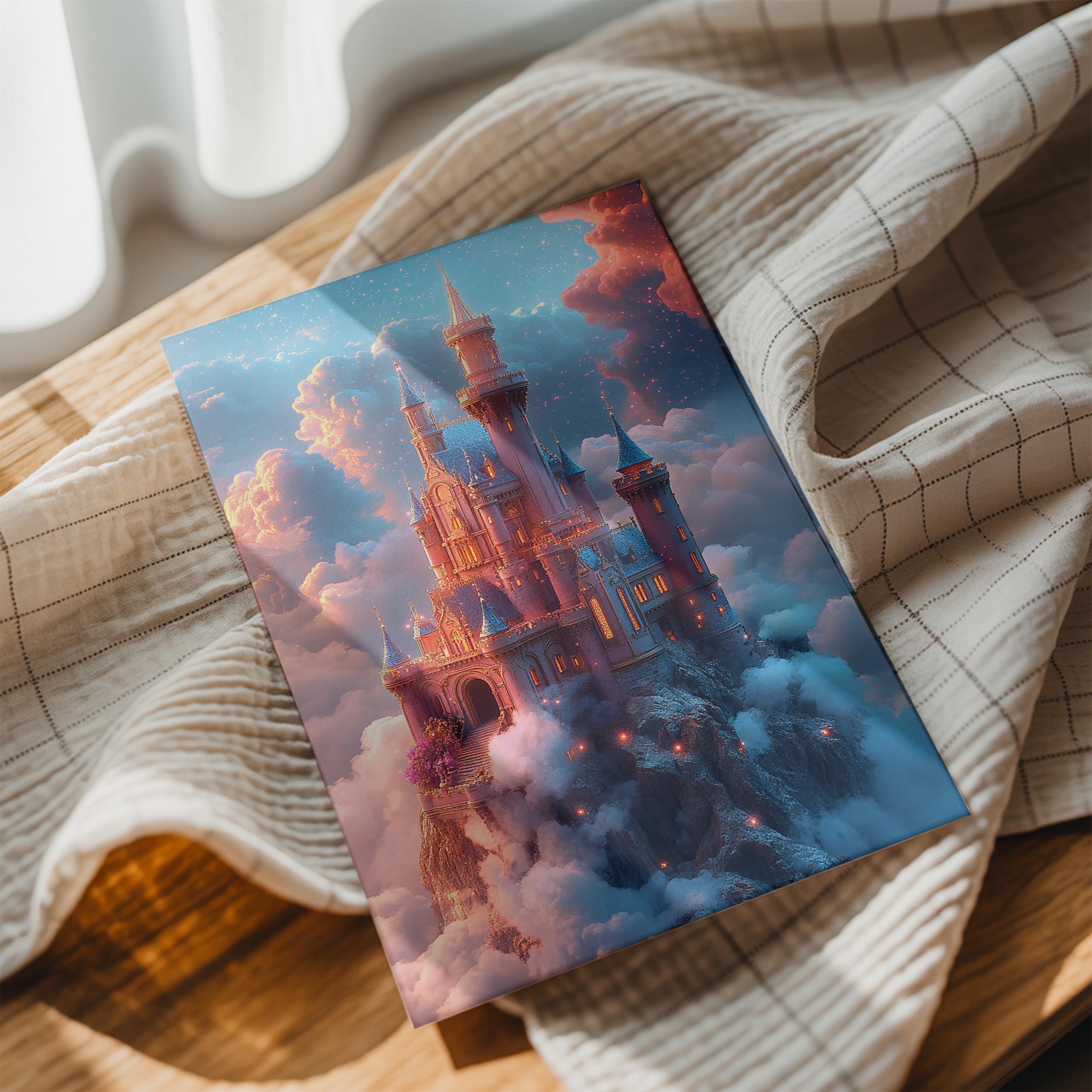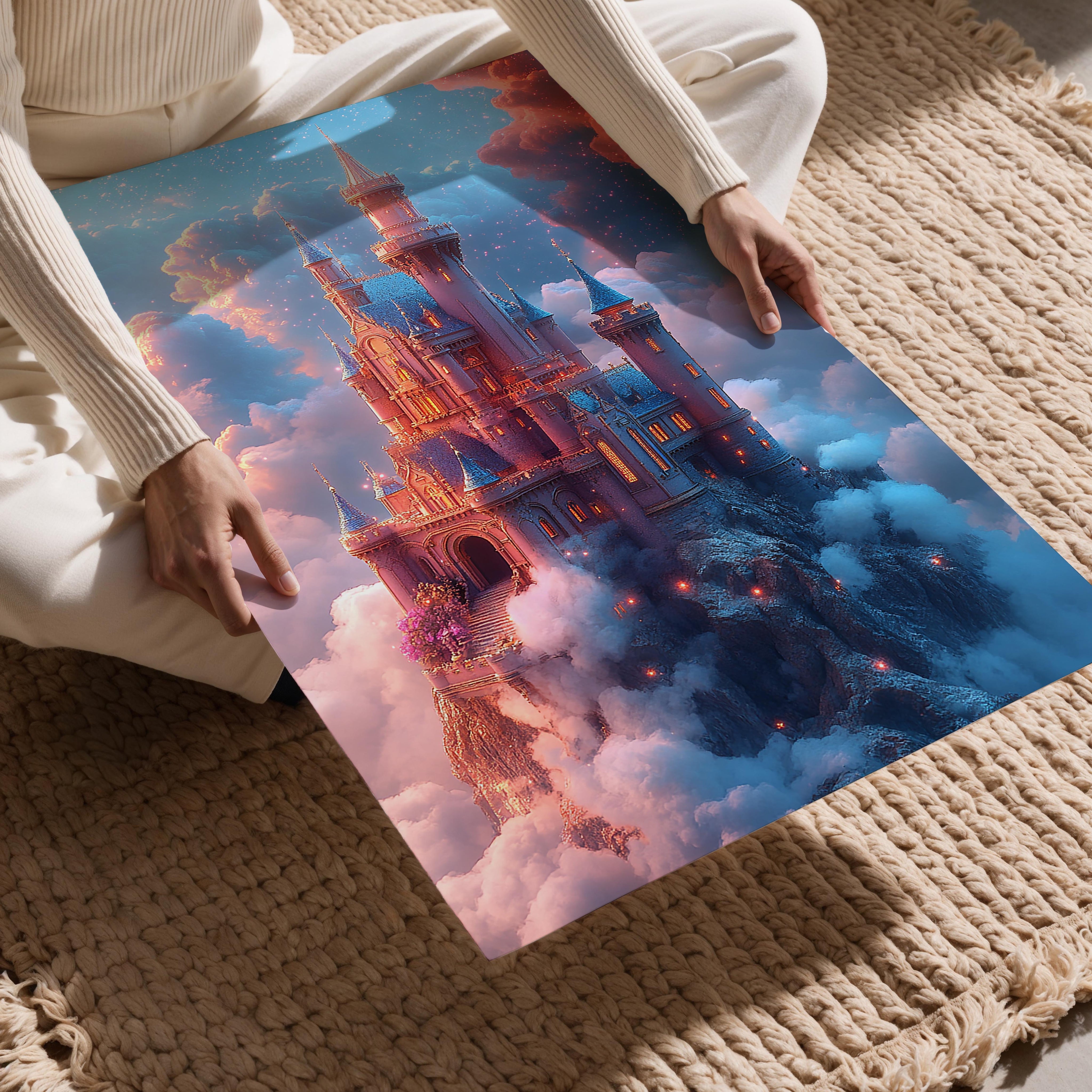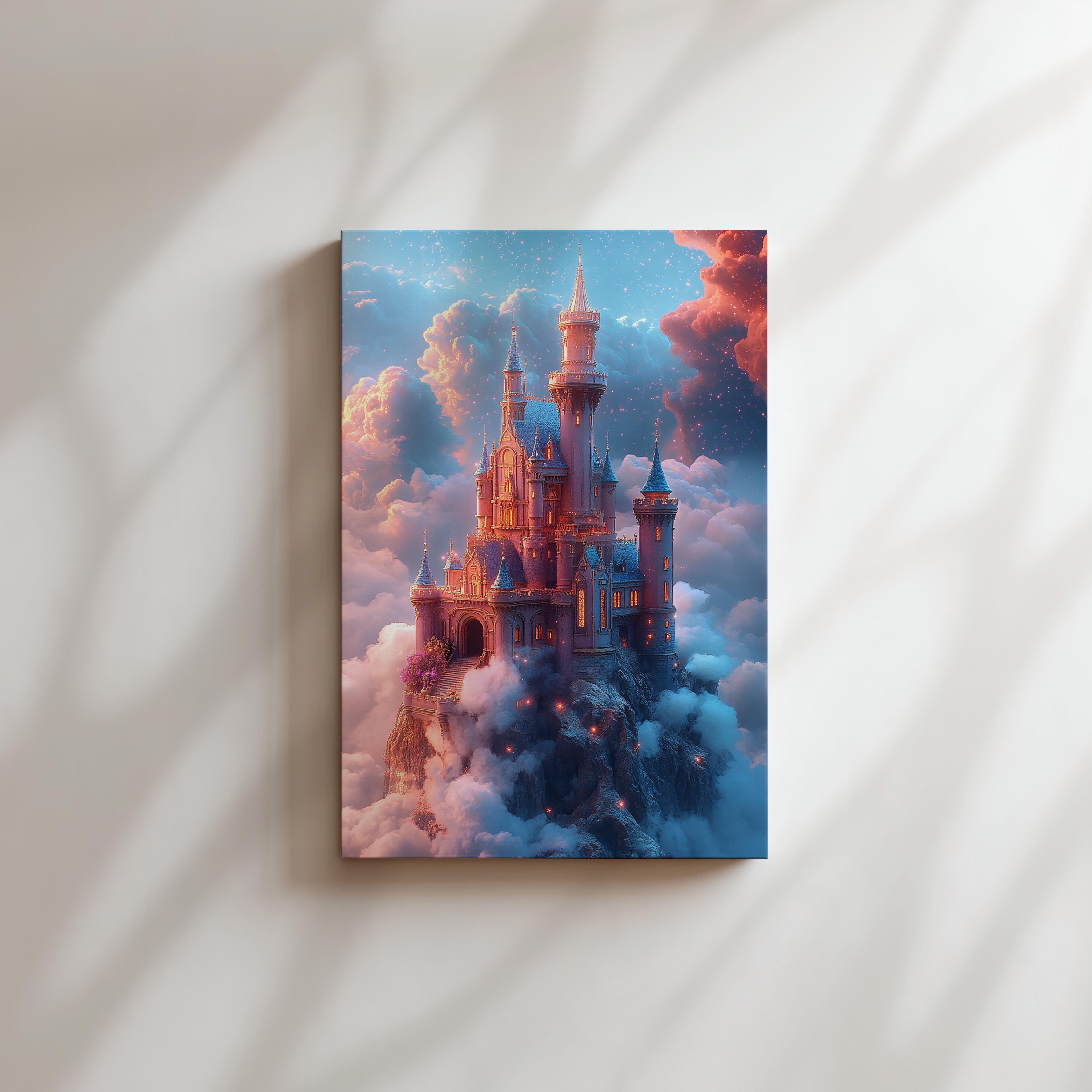 This stunning castle perched high above the clouds glows with a mix of blues and oranges, capturing the magic of a serene twilight. The surrounding sky is filled with soft, cotton-like clouds, making the scene feel peaceful and enchanting. The attention to architectural detail, combined with the harmonious color palette, gives this artwork a timeless appeal. It’s perfect for decorating a fantasy-themed space or as a statement piece in a living room or bedroom.