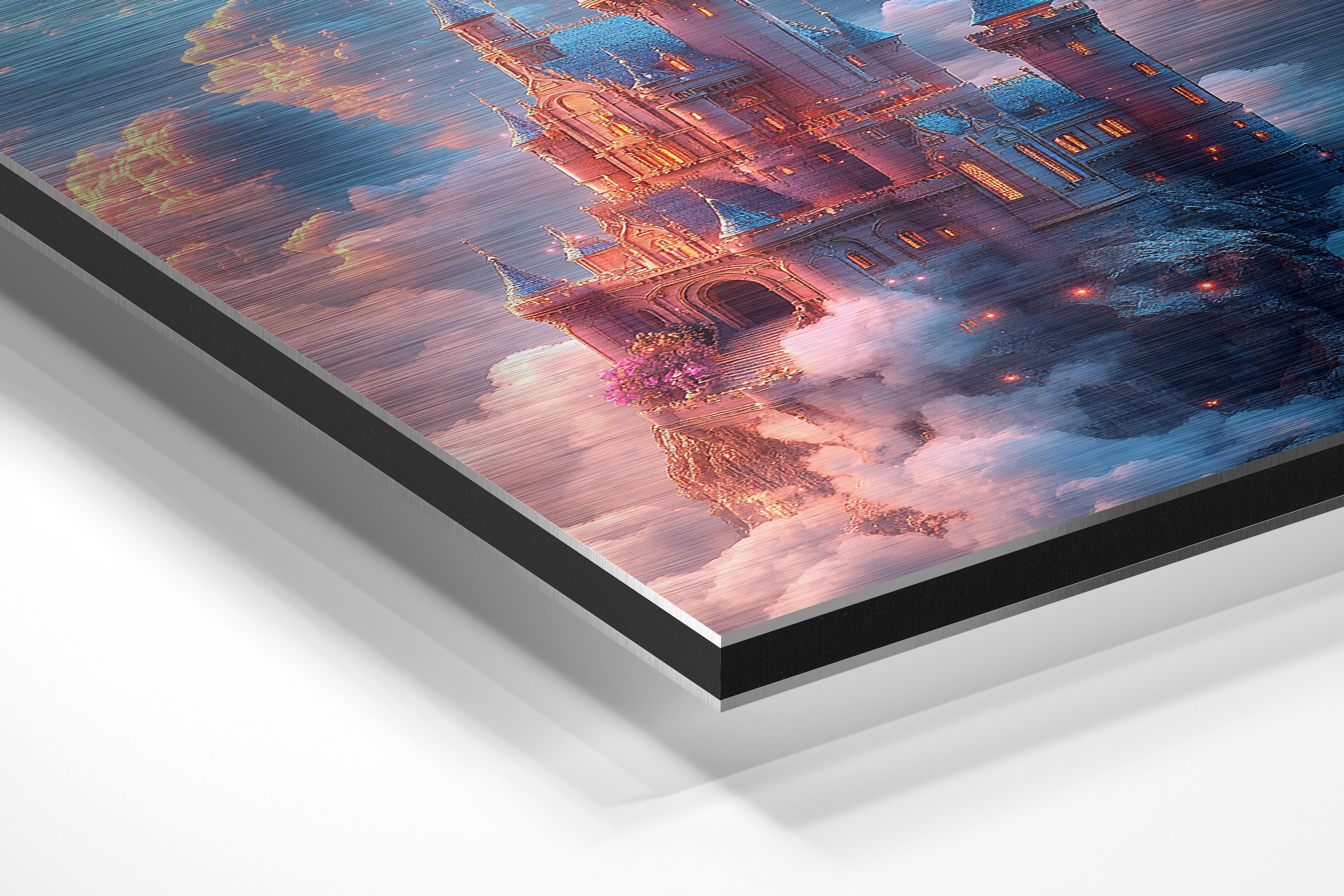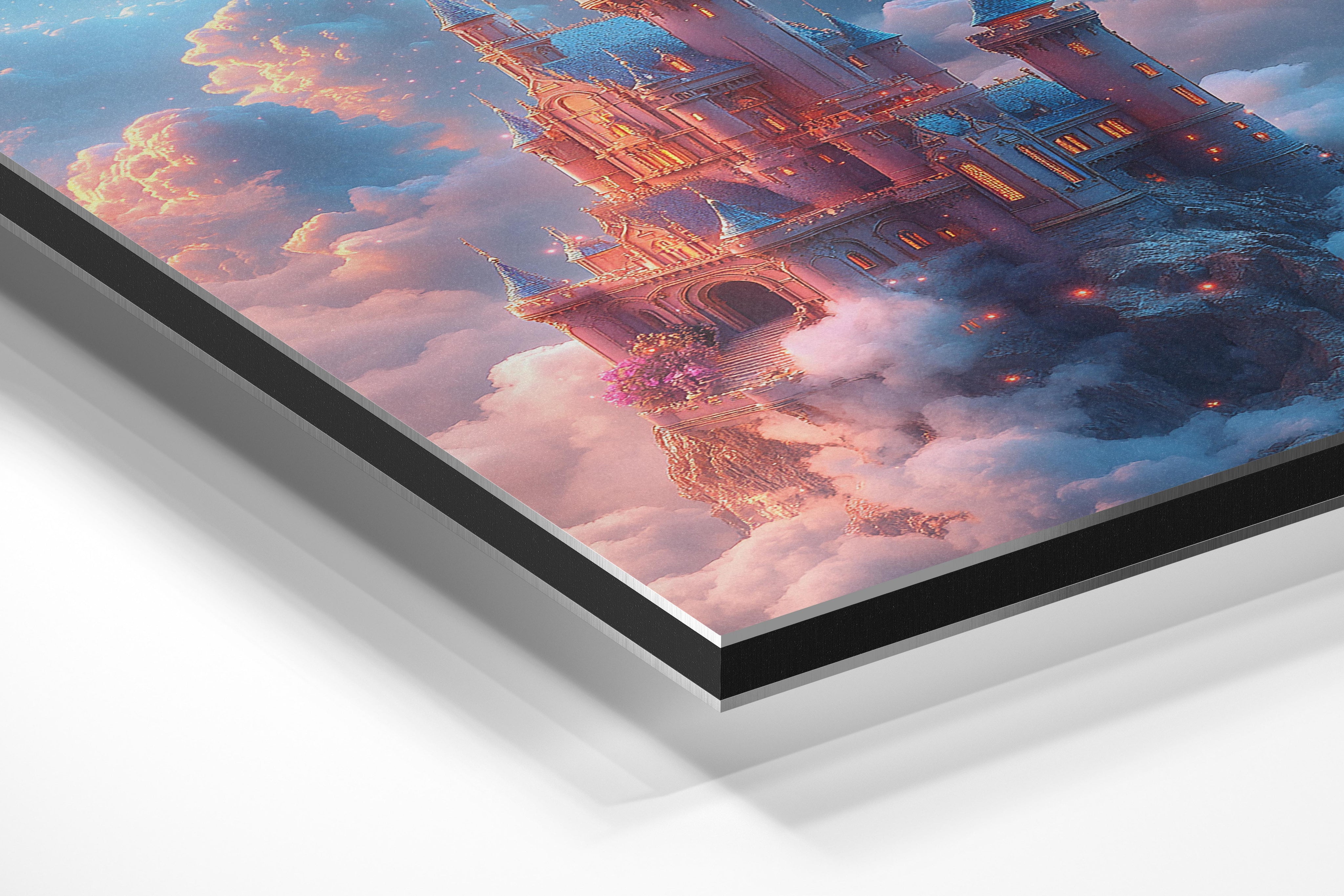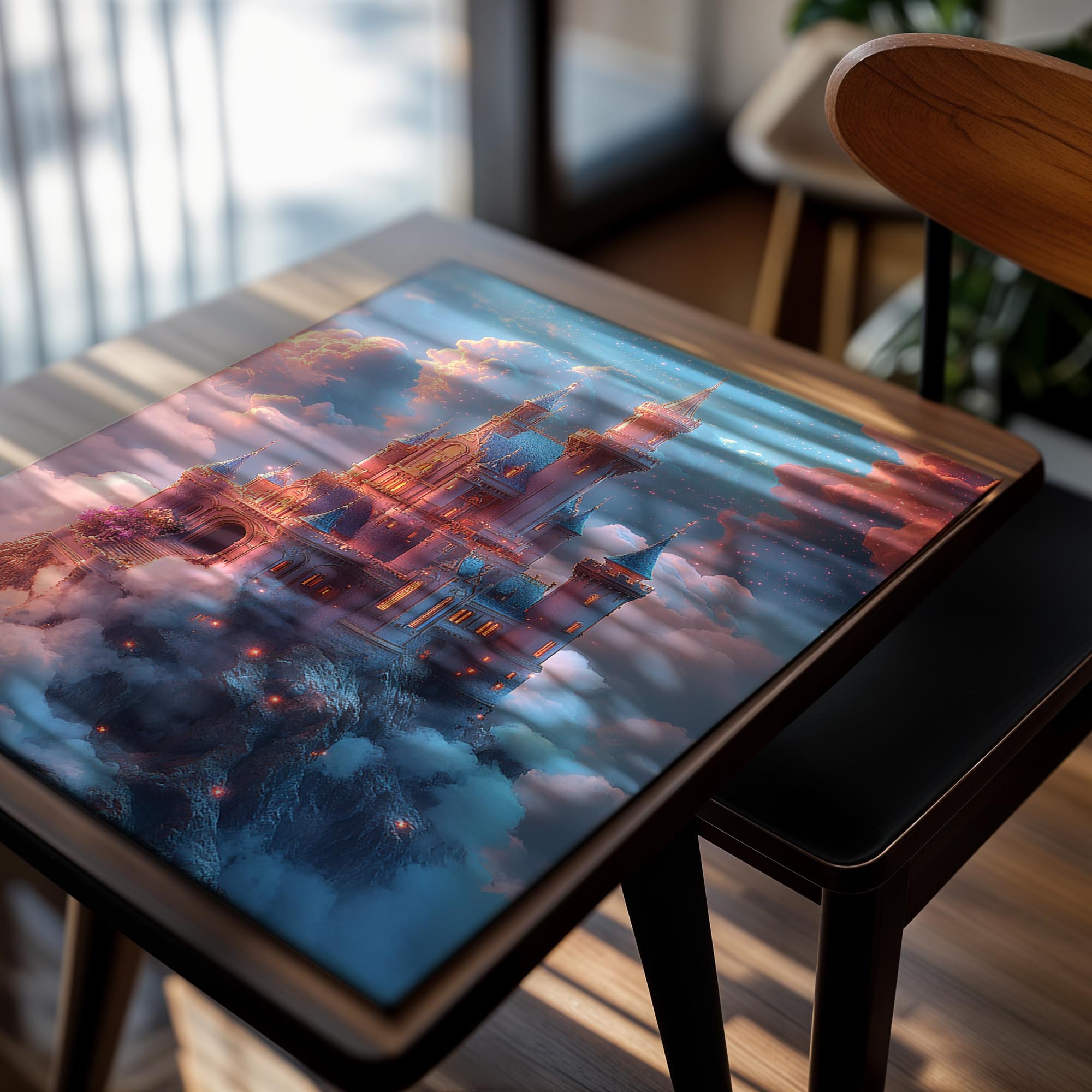 This stunning castle perched high above the clouds glows with a mix of blues and oranges, capturing the magic of a serene twilight. The surrounding sky is filled with soft, cotton-like clouds, making the scene feel peaceful and enchanting. The attention to architectural detail, combined with the harmonious color palette, gives this artwork a timeless appeal. It’s perfect for decorating a fantasy-themed space or as a statement piece in a living room or bedroom.