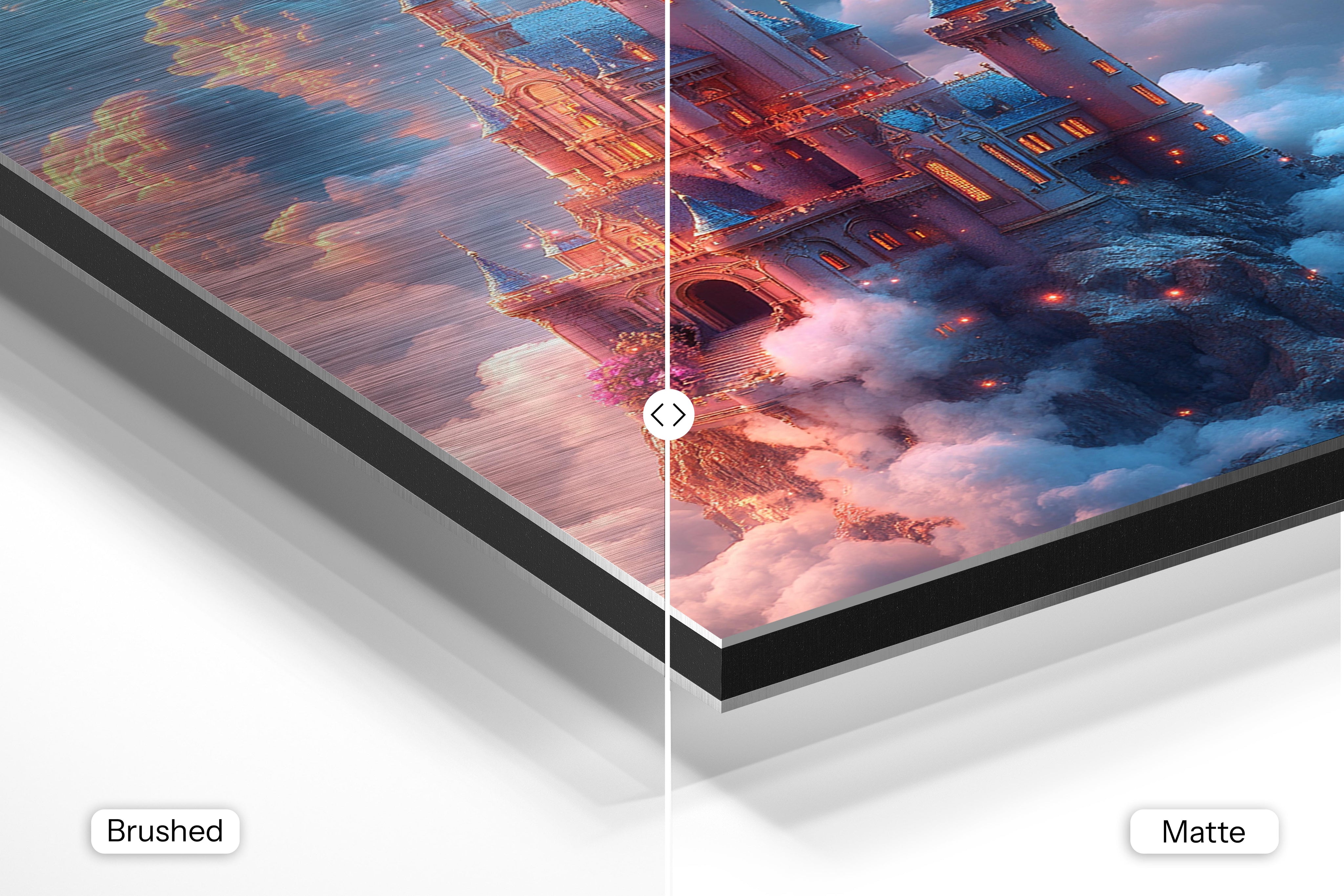 - Brushed Aluminum, on the other hand, features a raw metallic texture with visible brush strokes. Whites and highlights in your image let the silver surface show through, adding a dramatic, shimmering effect. Ideal for black-and-white images, minimalist designs, or abstract art, it creates a bold, industrial vibe with a modern edge.