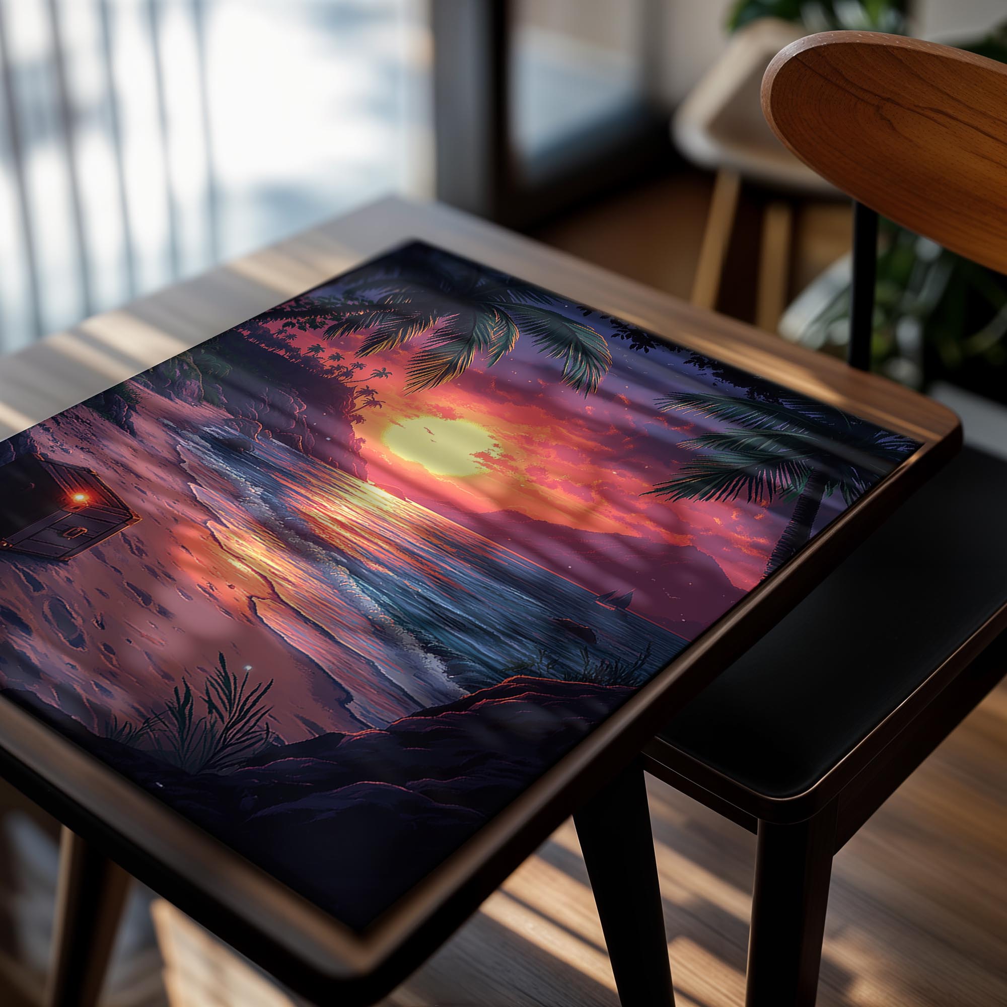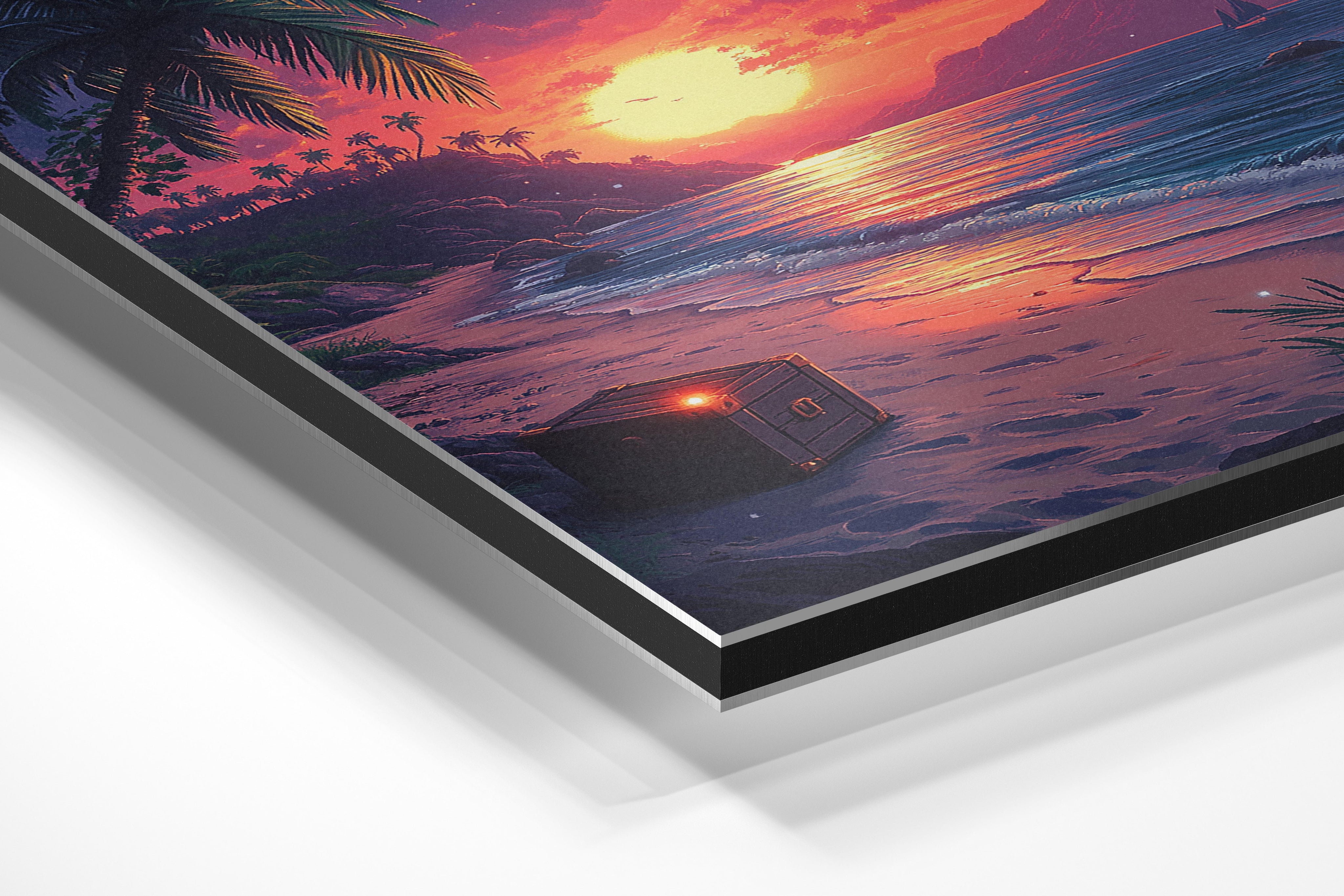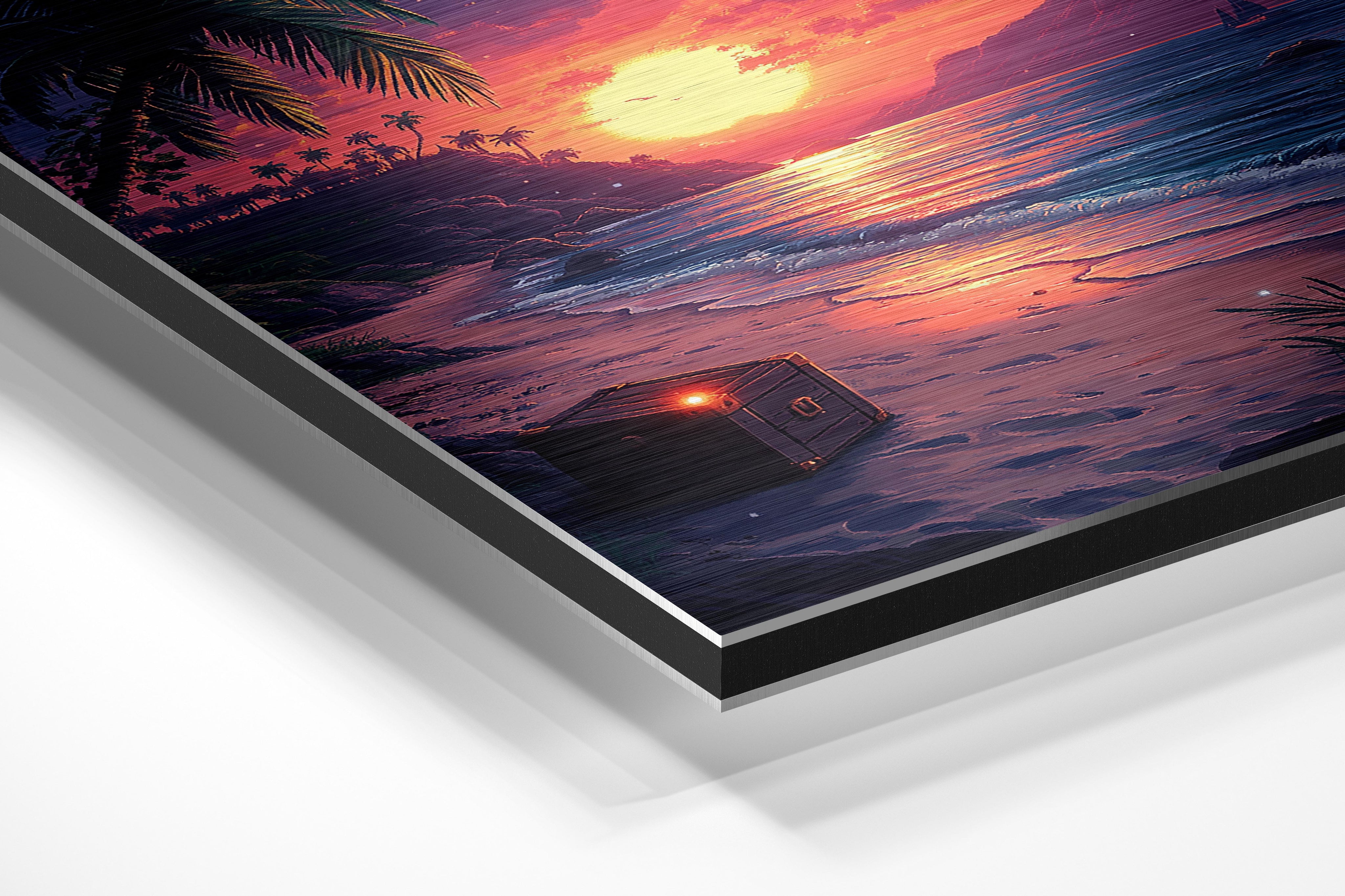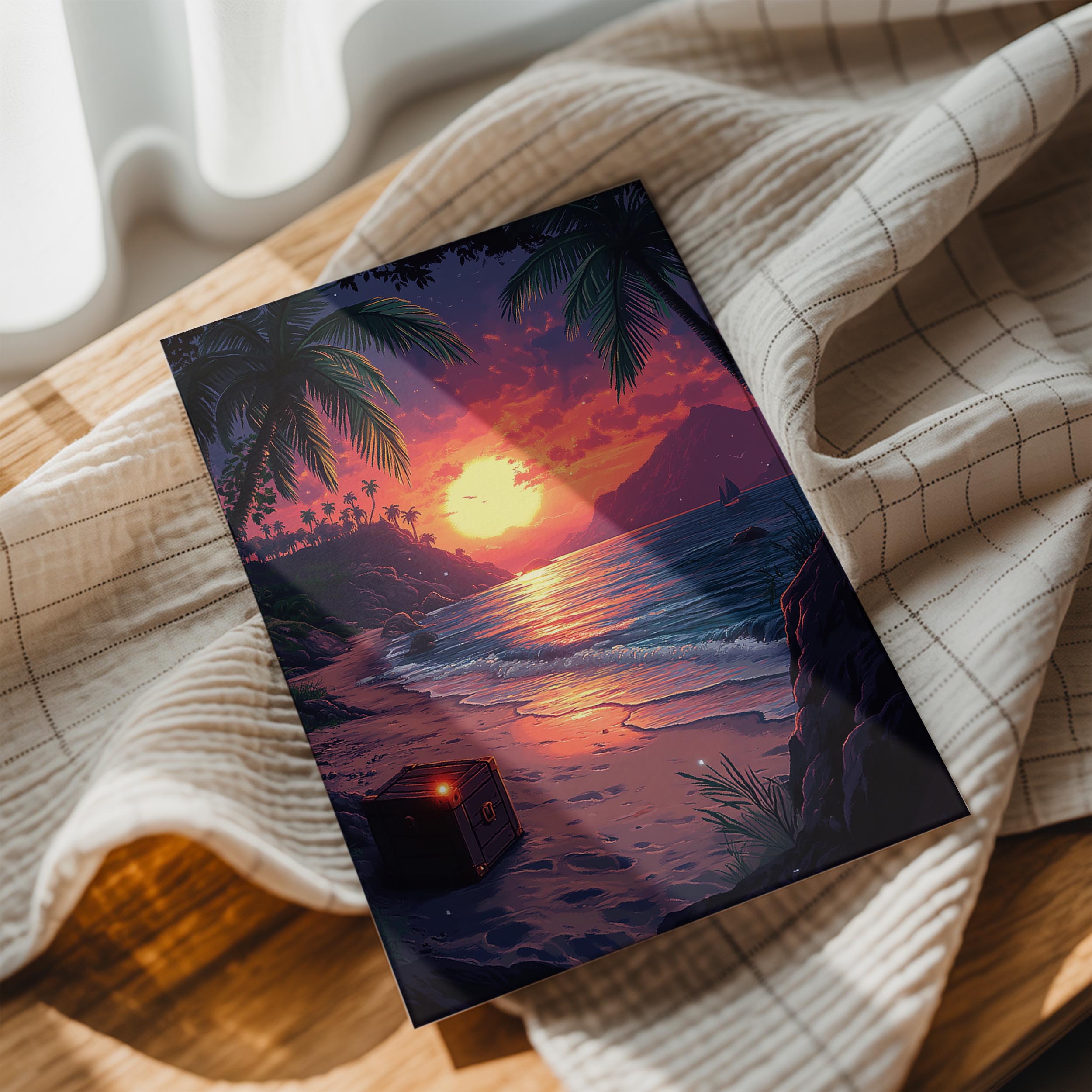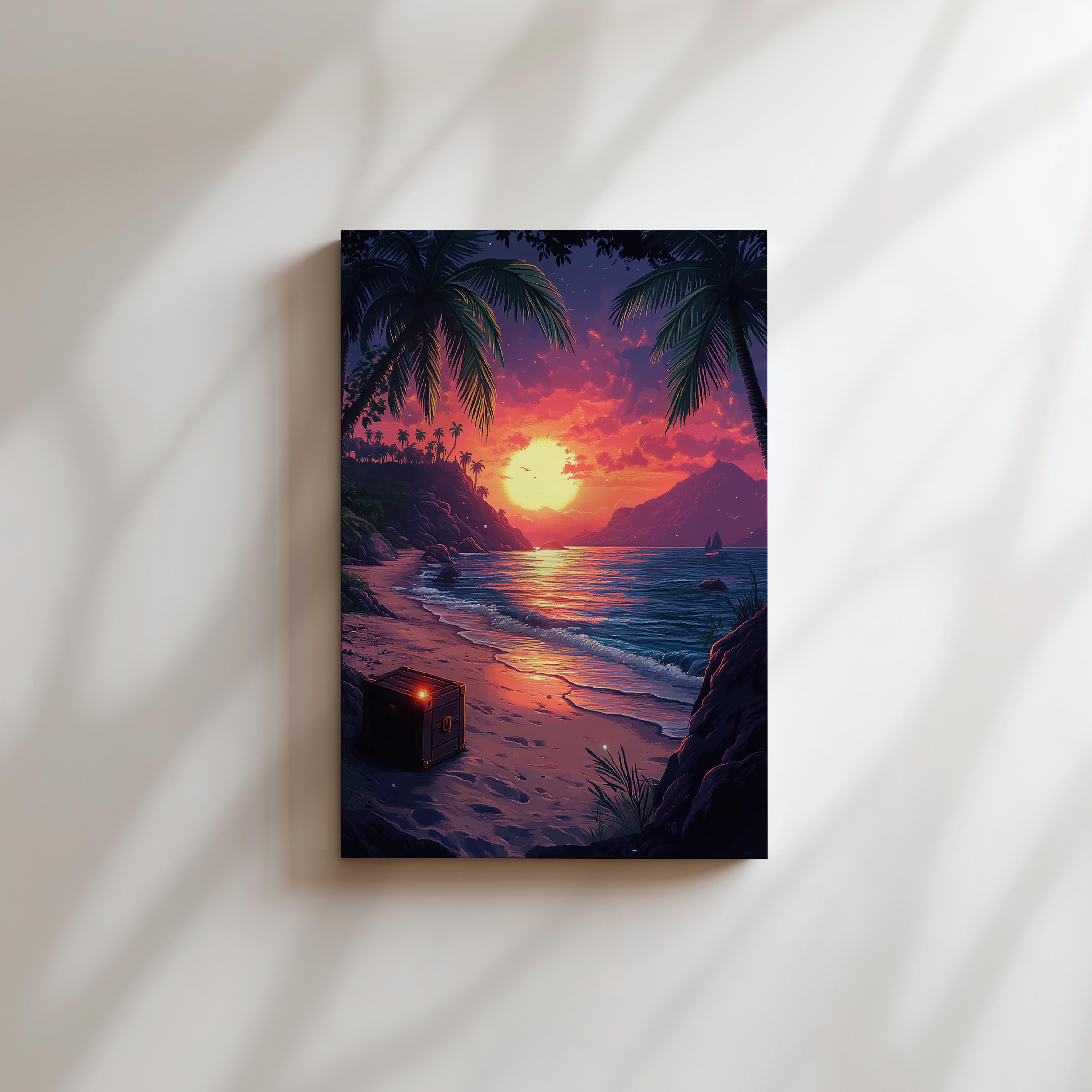 Set against a dramatic sunset, this image includes a mysterious treasure chest nestled on the beach. The radiant colors of the sky and ocean blend seamlessly, creating a captivating atmosphere. This piece combines elements of adventure, mystery, and natural beauty, making it an excellent choice for creative or eclectic interiors. It sparks the imagination and brings a sense of storytelling to any room. Perfect for game rooms, living spaces, or areas designed to inspire creativity, it adds both intrigue and visual appeal.