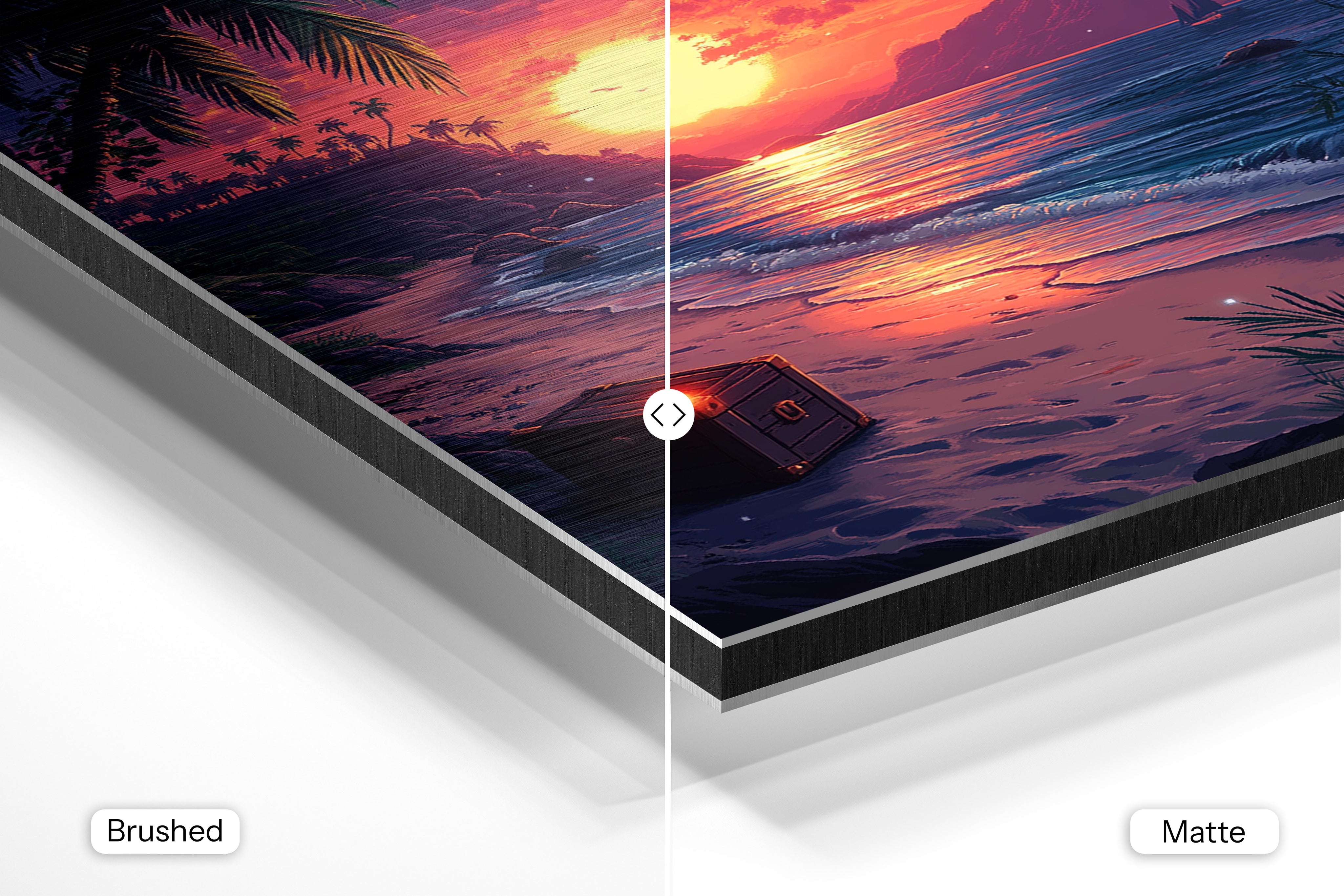 - Brushed Aluminum, on the other hand, features a raw metallic texture with visible brush strokes. Whites and highlights in your image let the silver surface show through, adding a dramatic, shimmering effect. Ideal for black-and-white images, minimalist designs, or abstract art, it creates a bold, industrial vibe with a modern edge.
