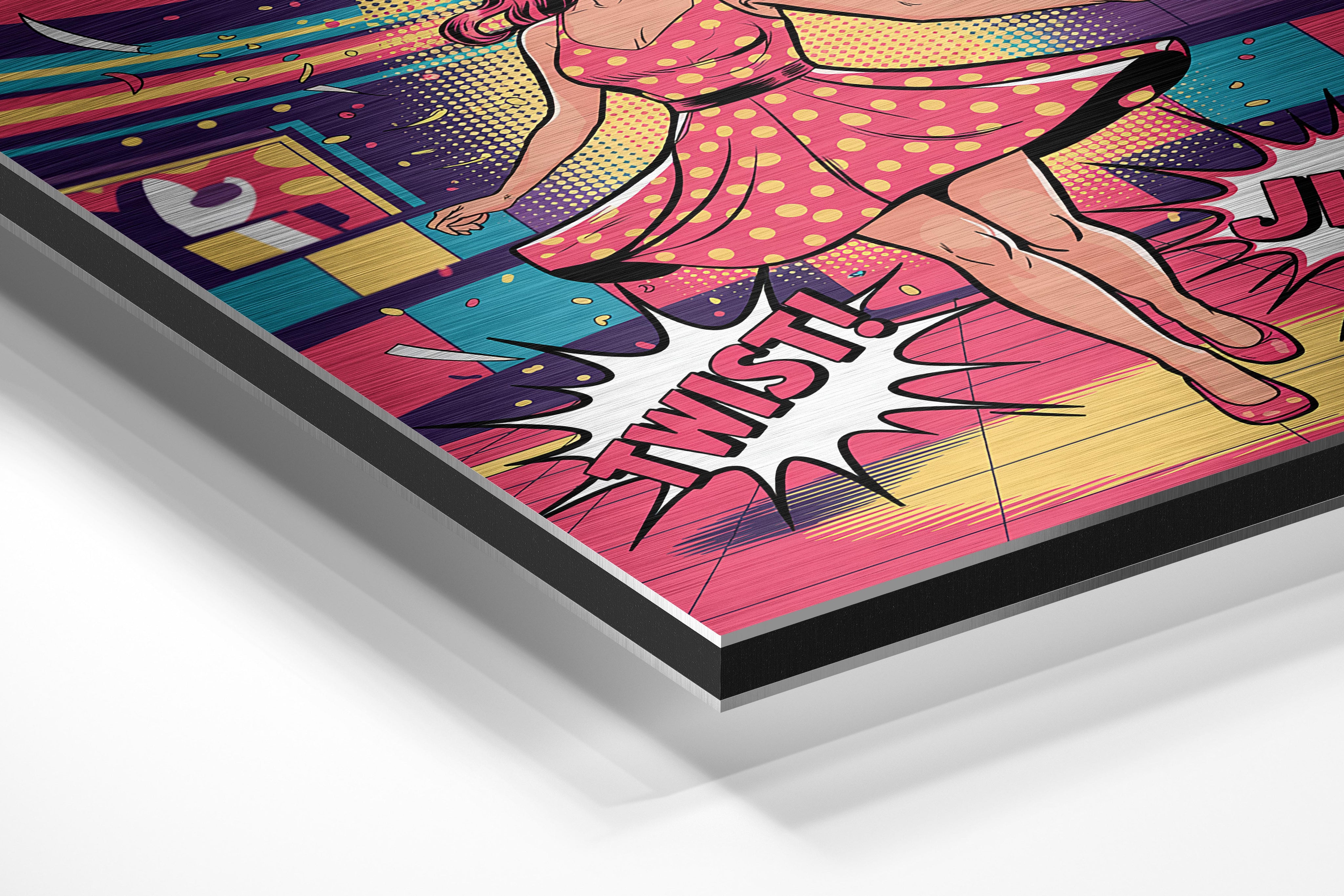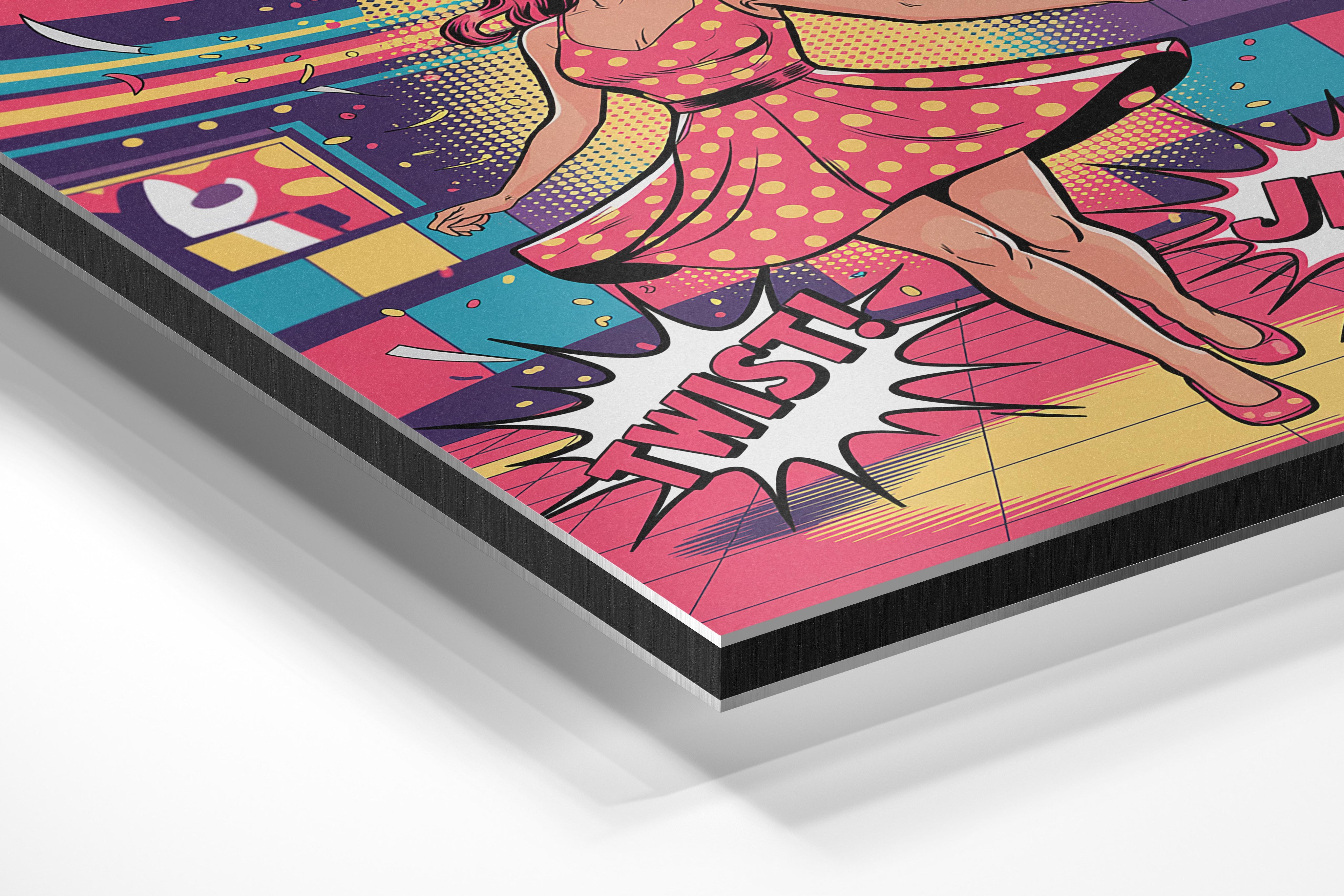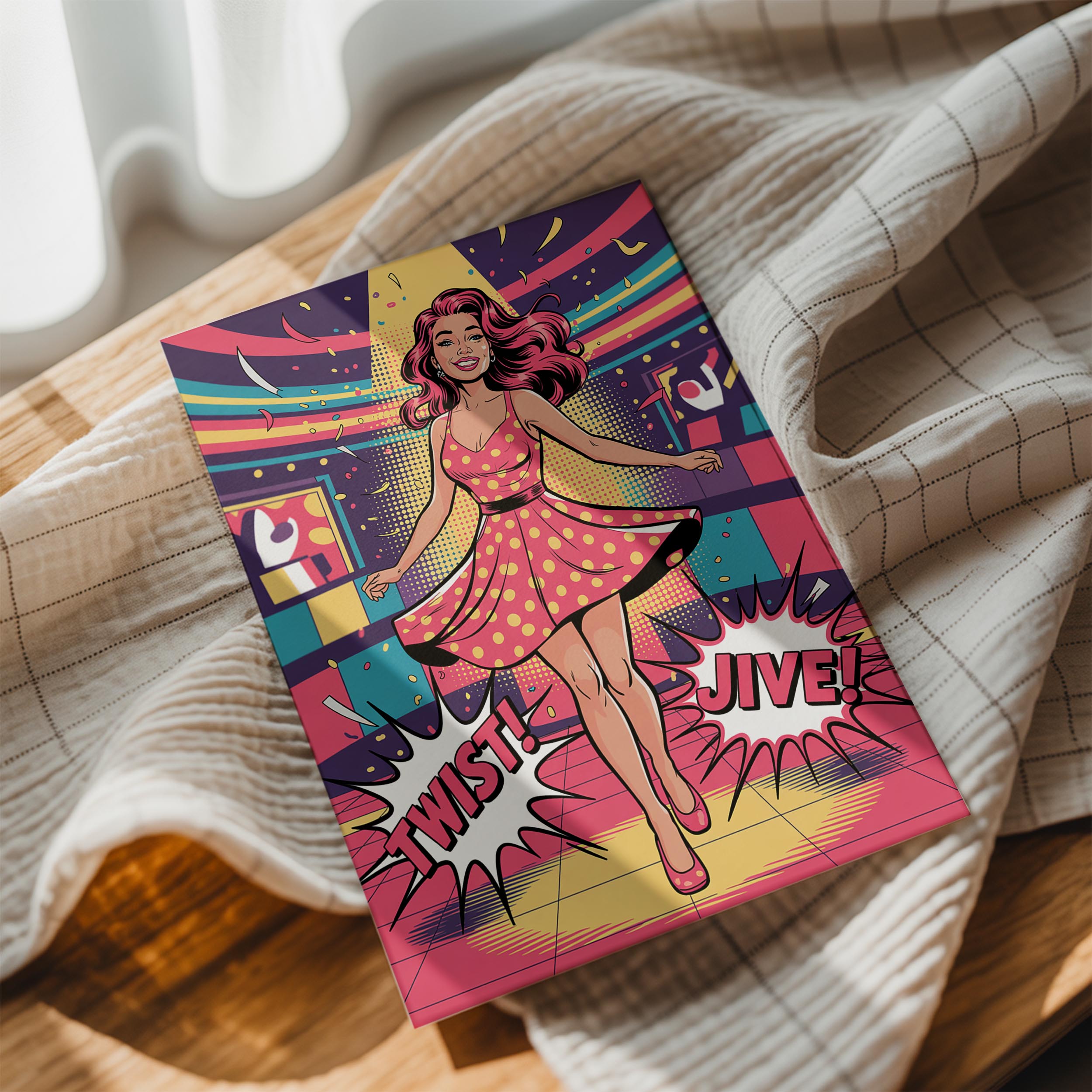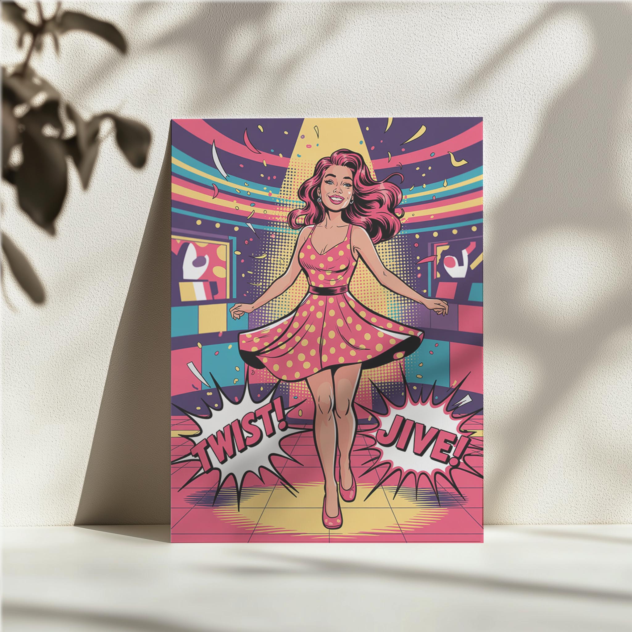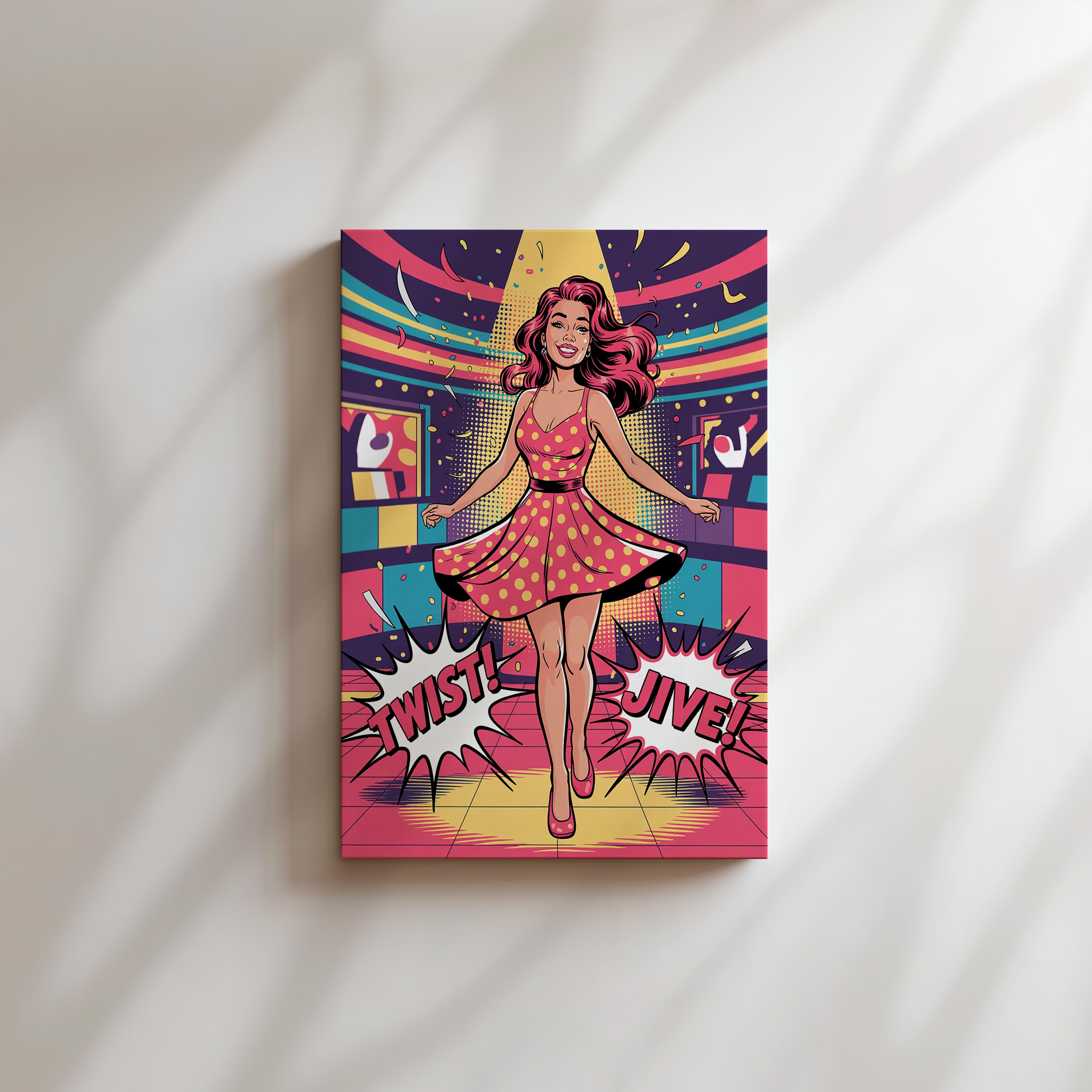 This retro dancefloor scene spotlights a joyful woman mid-spin in a polka-dot dress, surrounded by the energetic words “TWIST!” and “JIVE!” The vibrant disco setting, complete with confetti, spotlights, and a colorful backdrop, channels 1960s dance parties and unfiltered joy. Ideal for music-themed rooms, dance studios, or retro-inspired spaces, this image radiates movement and nostalgia. It’s a celebration of rhythm, style, and fun with irresistible pop energy.
