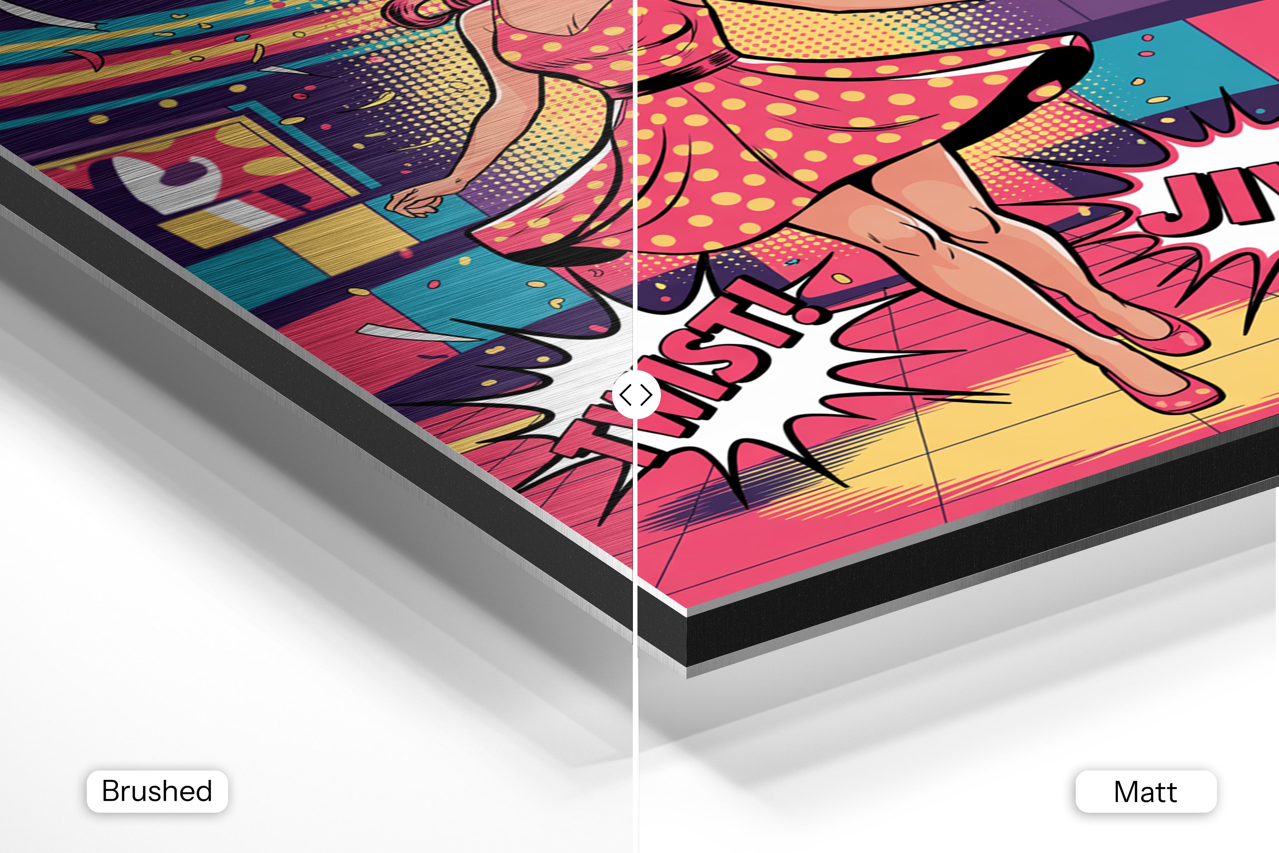 - Brushed Aluminum, on the other hand, features a raw metallic texture with visible brush strokes. Whites and highlights in your image let the silver surface show through, adding a dramatic, shimmering effect. Ideal for black-and-white images, minimalist designs, or abstract art, it creates a bold, industrial vibe with a modern edge.