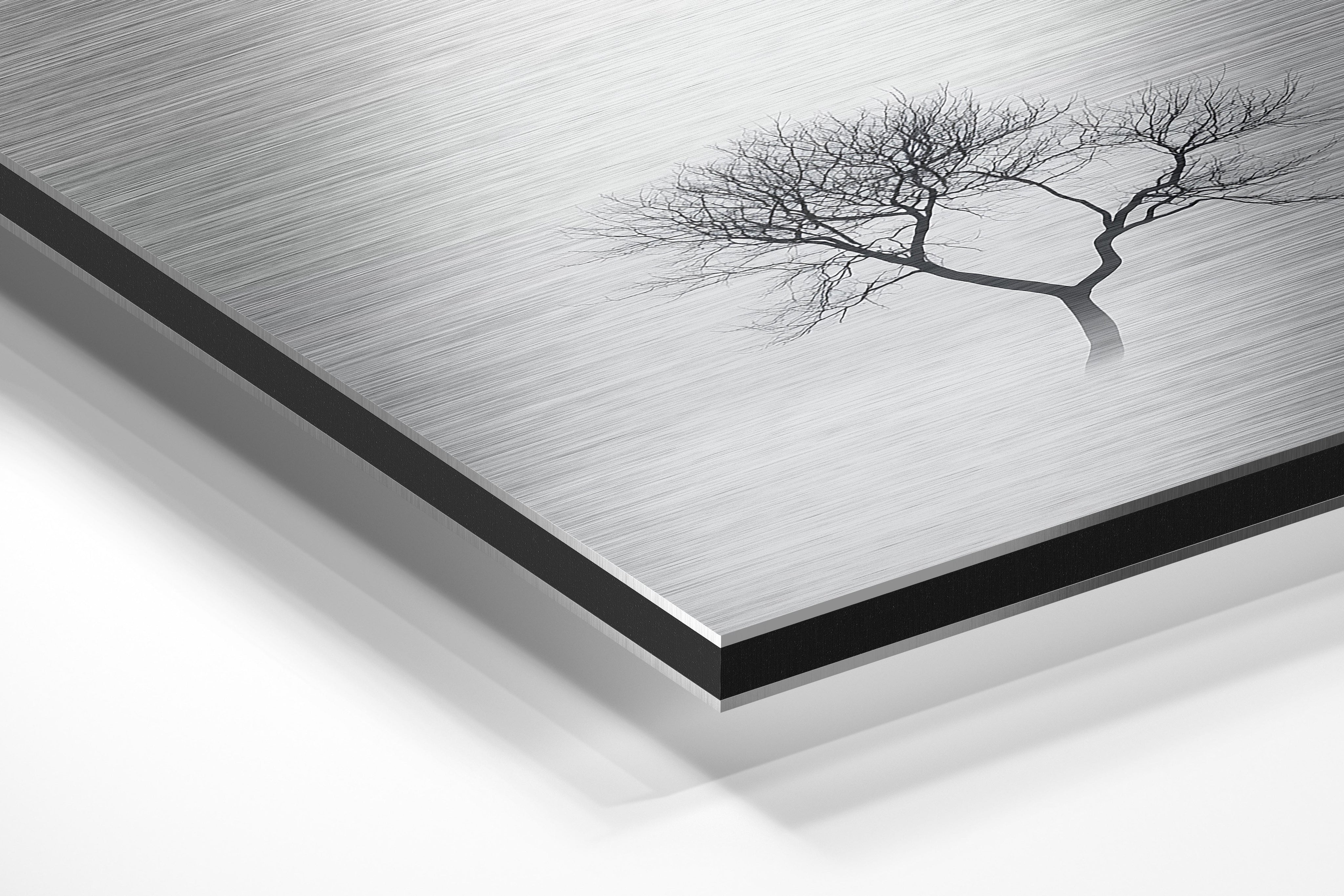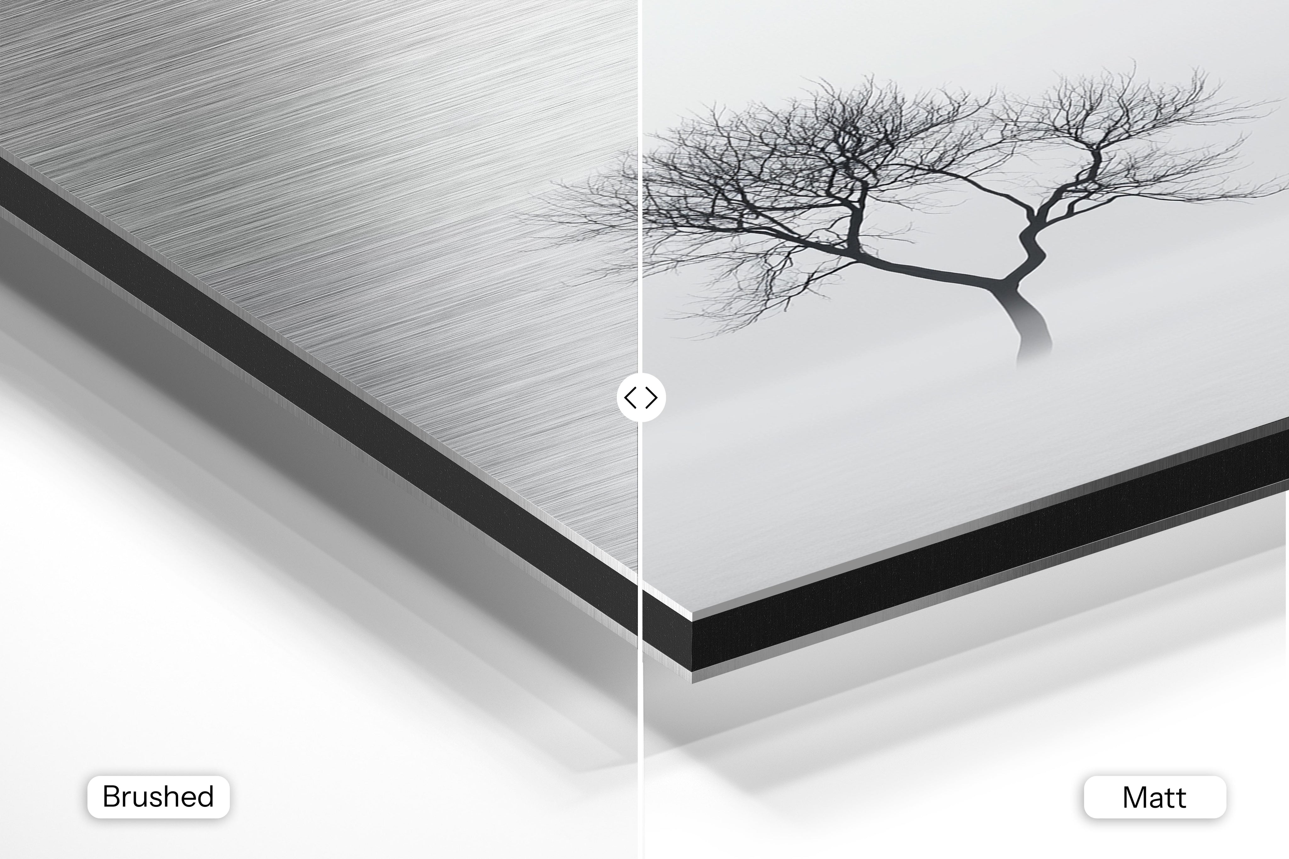 - Brushed Aluminum, on the other hand, features a raw metallic texture with visible brush strokes. Whites and highlights in your image let the silver surface show through, adding a dramatic, shimmering effect. Ideal for black-and-white images, minimalist designs, or abstract art, it creates a bold, industrial vibe with a modern edge.