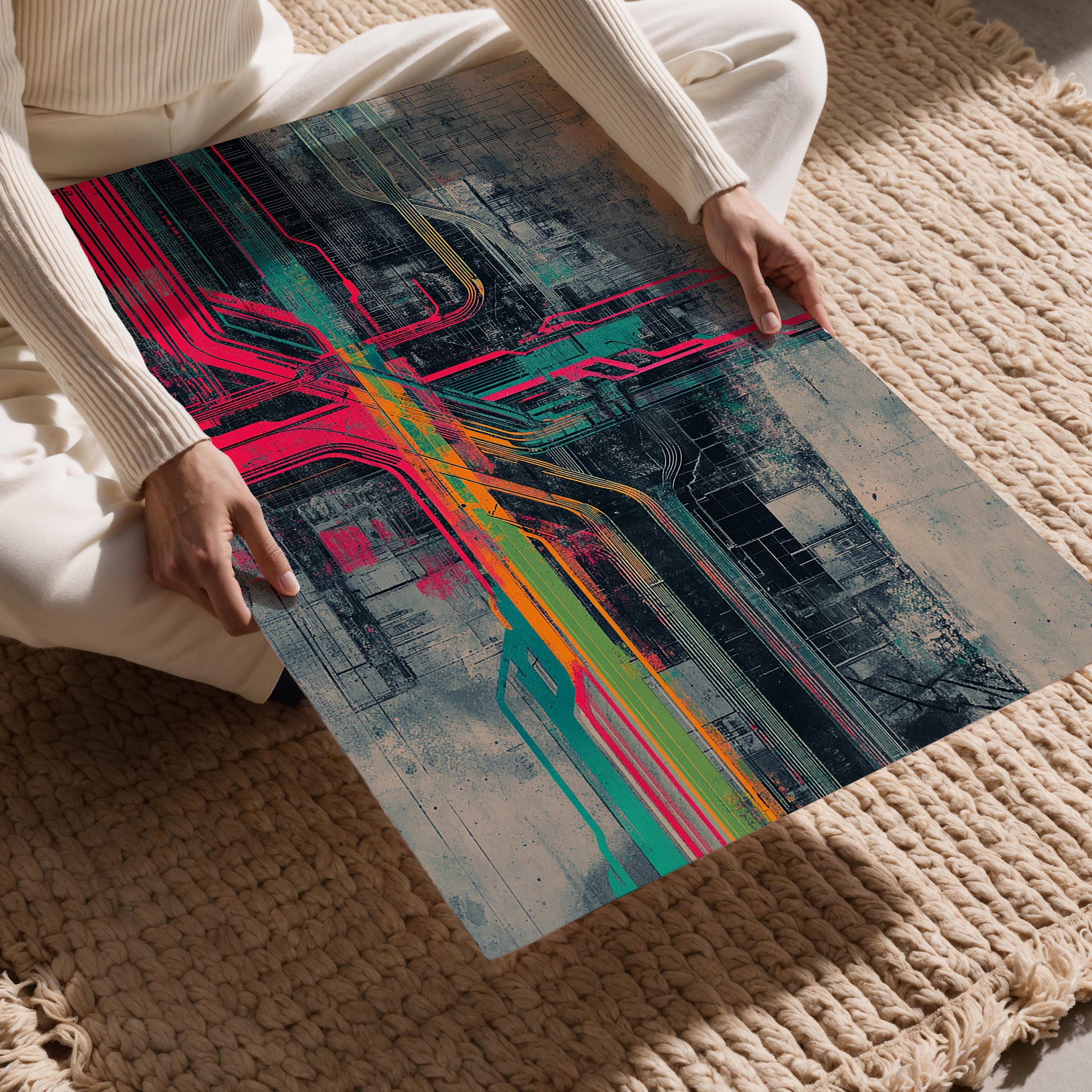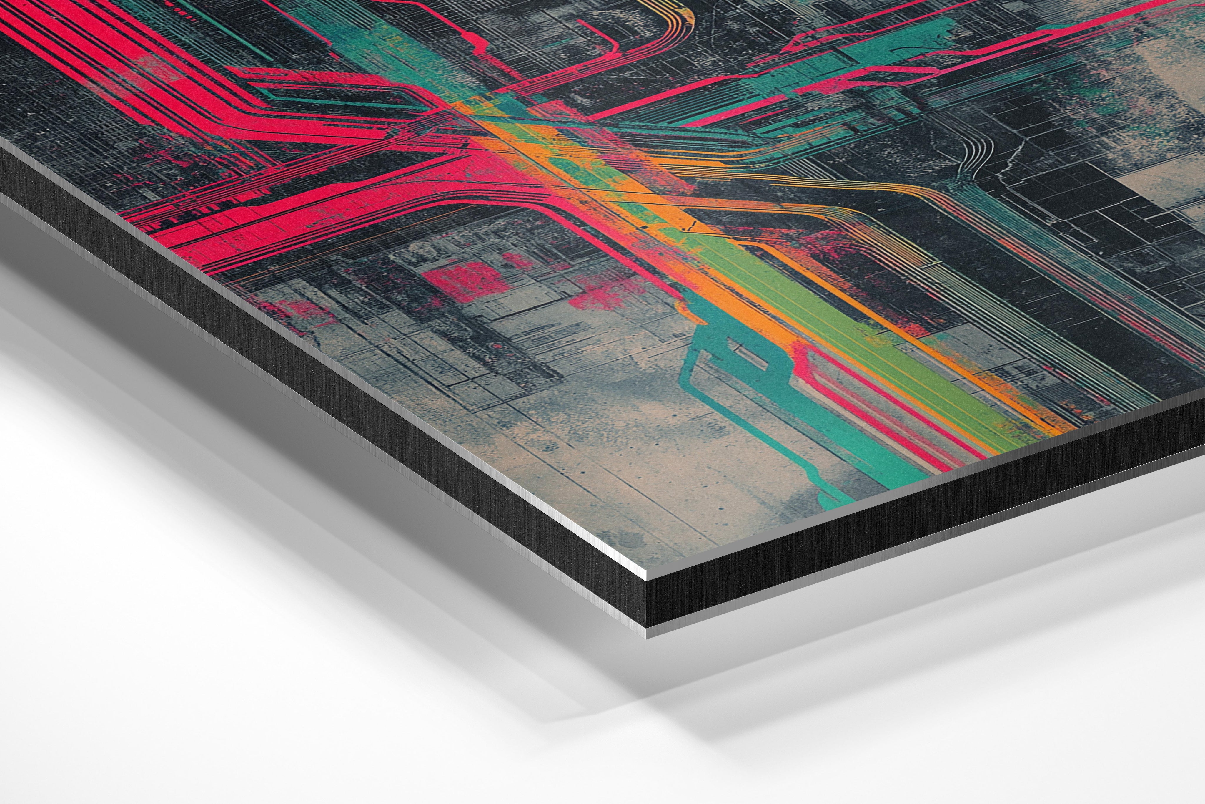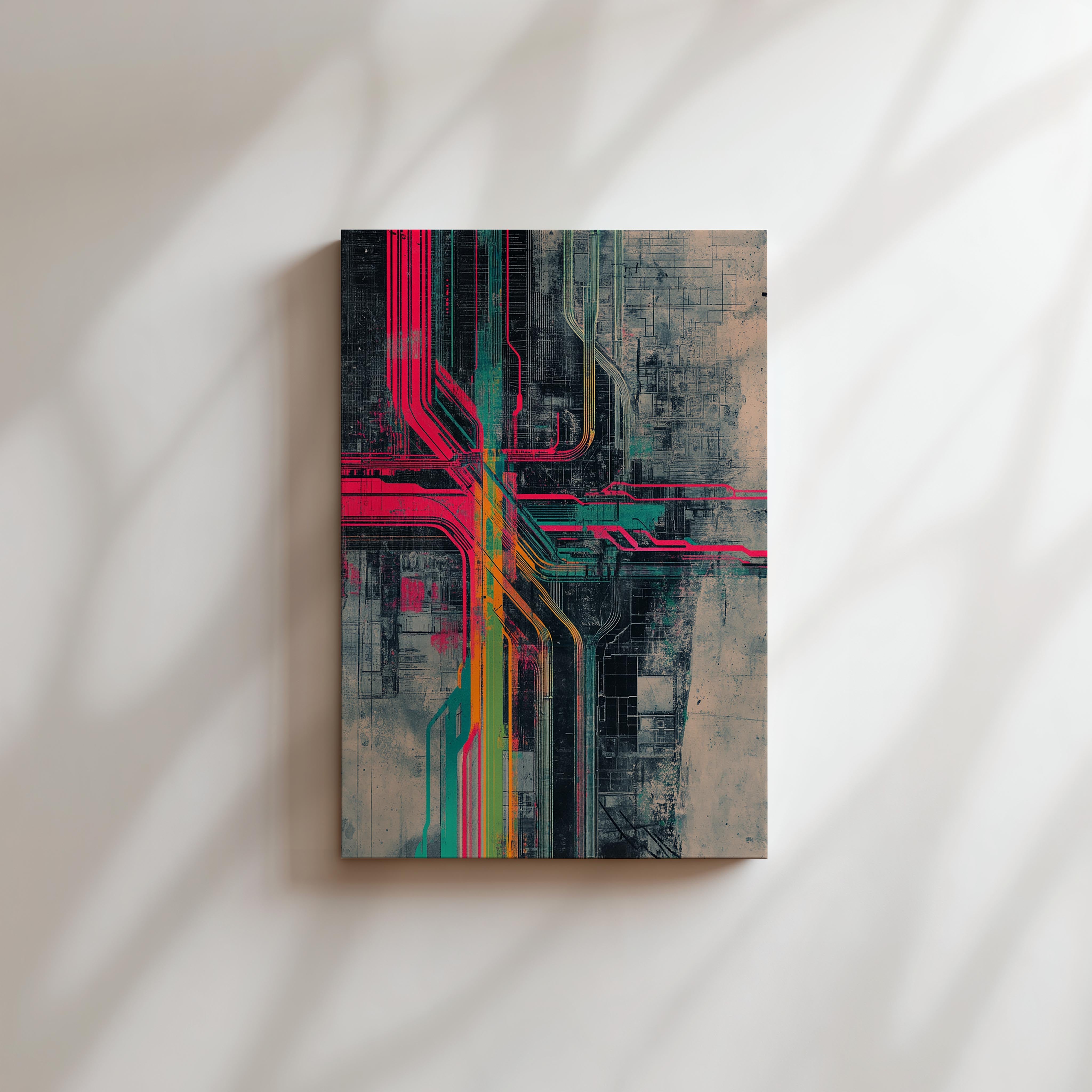 This futuristic image depicts a cityscape with neon-colored circuits intersecting across a grid-like structure. The industrial and technological vibe evokes innovation and complexity, making it a striking choice for tech startups, innovation hubs, or urban-themed wall decor. The artwork’s sharp contrasts and vibrant hues symbolize the interconnectedness of modern cities, bringing a sense of energy and forward-thinking to any space. Ideal for urban enthusiasts or lovers of tech-inspired aesthetics.