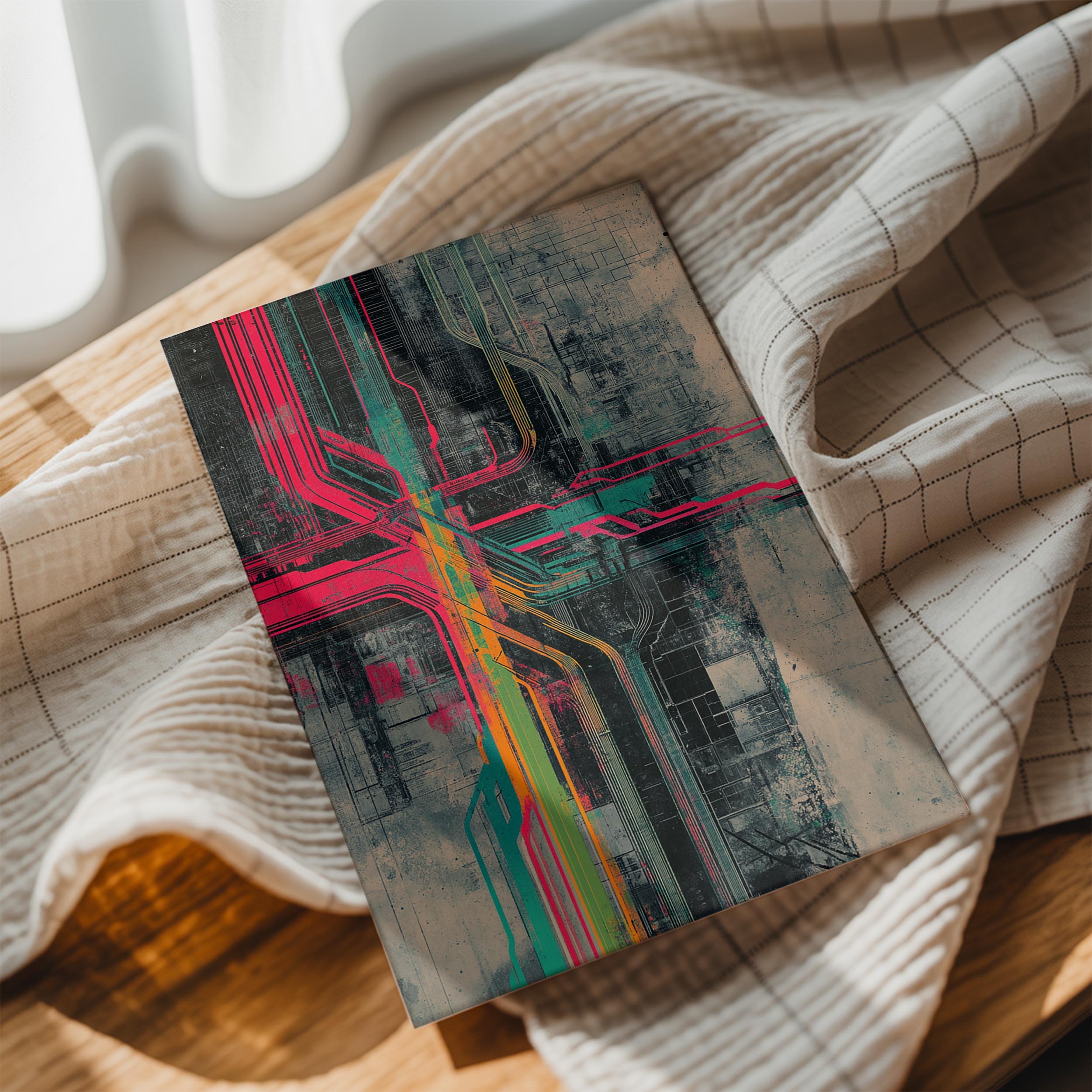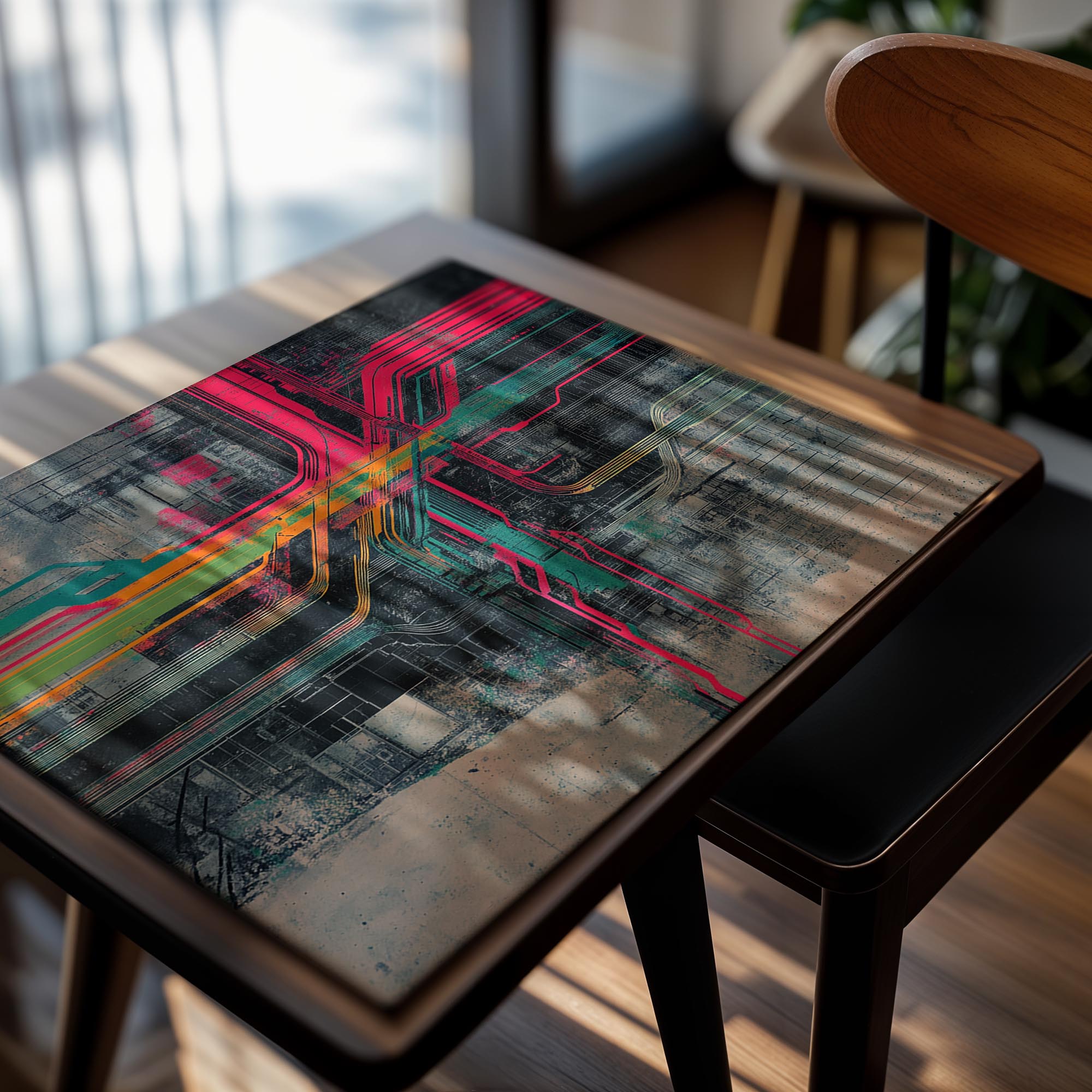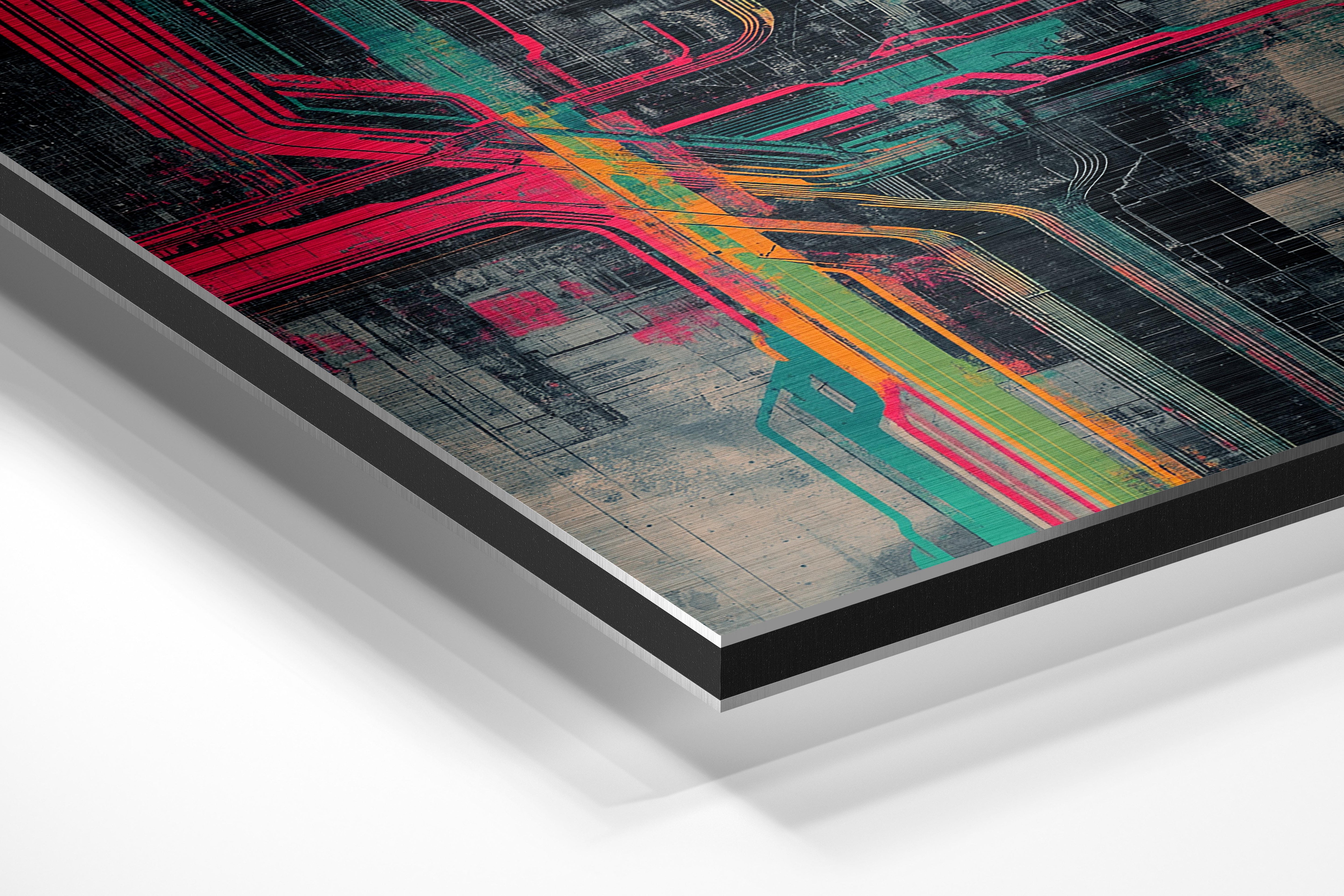 This futuristic image depicts a cityscape with neon-colored circuits intersecting across a grid-like structure. The industrial and technological vibe evokes innovation and complexity, making it a striking choice for tech startups, innovation hubs, or urban-themed wall decor. The artwork’s sharp contrasts and vibrant hues symbolize the interconnectedness of modern cities, bringing a sense of energy and forward-thinking to any space. Ideal for urban enthusiasts or lovers of tech-inspired aesthetics.