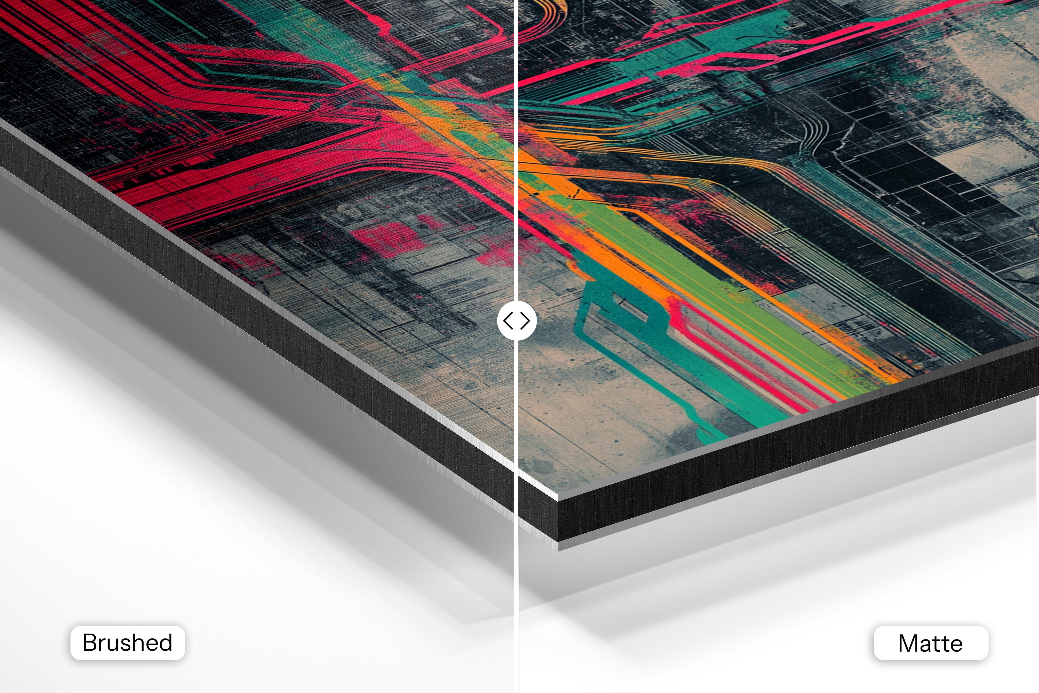 - Brushed Aluminum, on the other hand, features a raw metallic texture with visible brush strokes. Whites and highlights in your image let the silver surface show through, adding a dramatic, shimmering effect. Ideal for black-and-white images, minimalist designs, or abstract art, it creates a bold, industrial vibe with a modern edge.