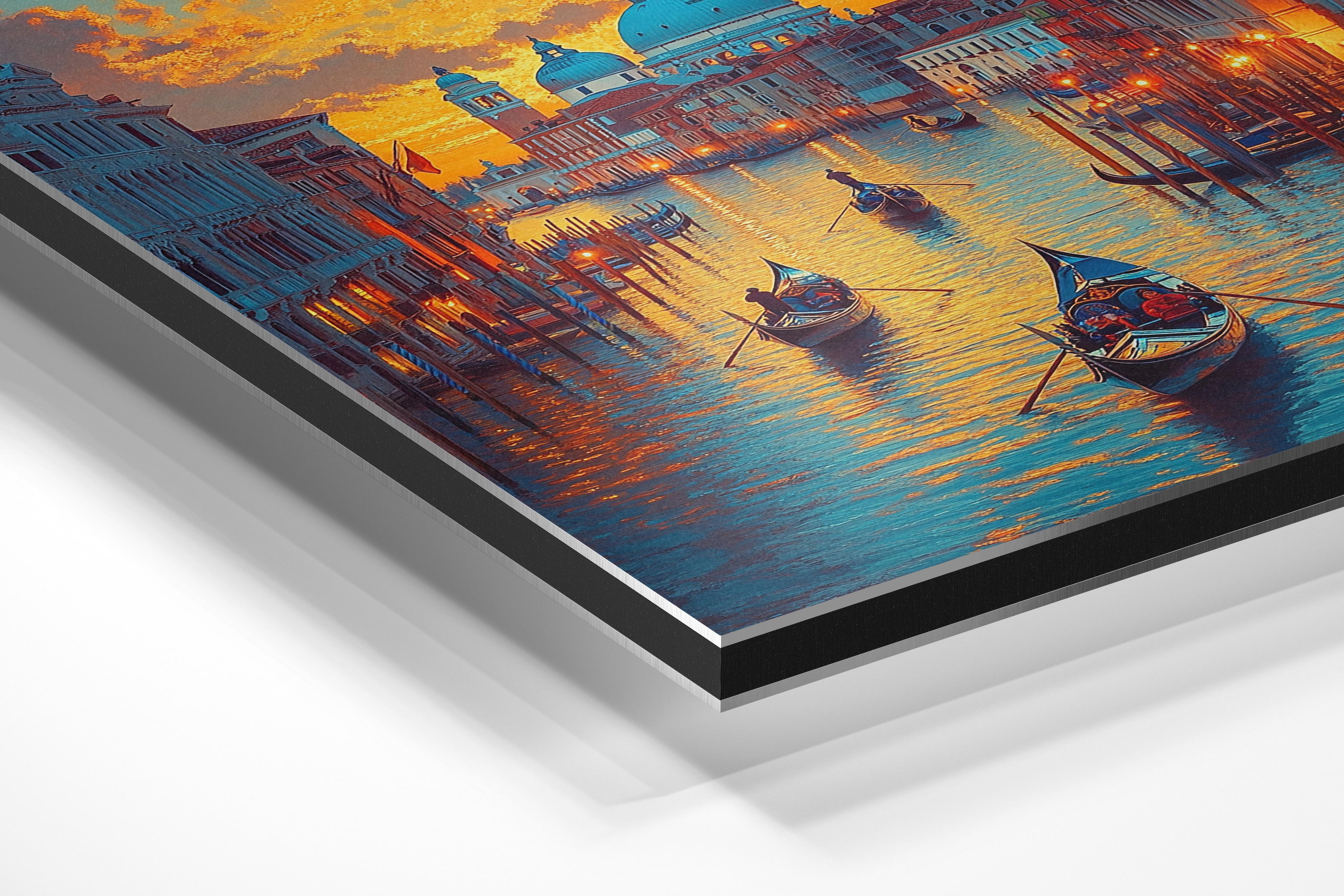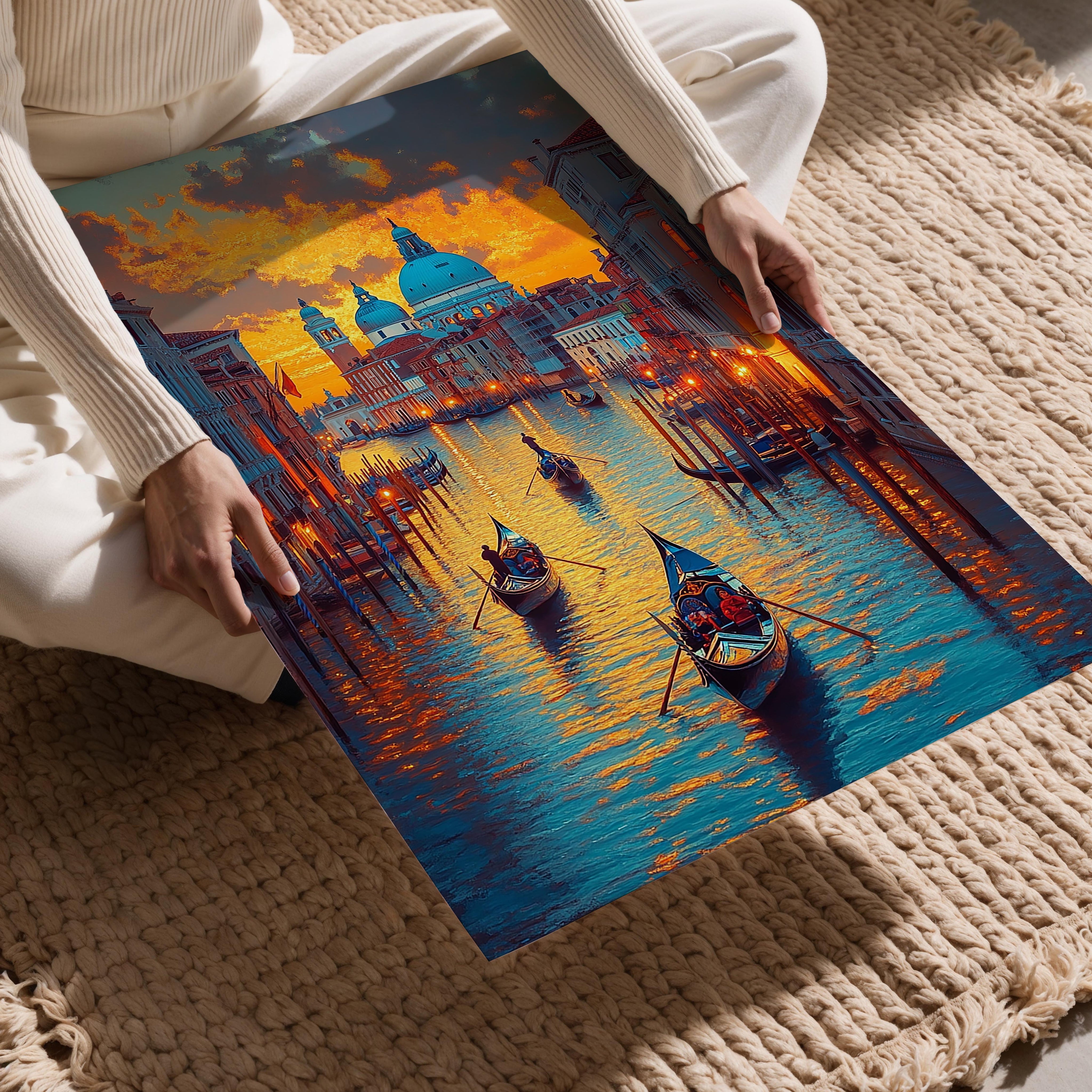 This stunning image captures Venice’s Grand Canal bathed in the warm hues of sunset. Gondolas gently glide through the glowing waters, while historic buildings reflect the vibrant sky. The radiant colors create a romantic, dreamlike atmosphere. Ideal for spaces seeking warmth and elegance, this artwork highlights the magical beauty of Venice during twilight, perfect for bedrooms, offices, or lounges.