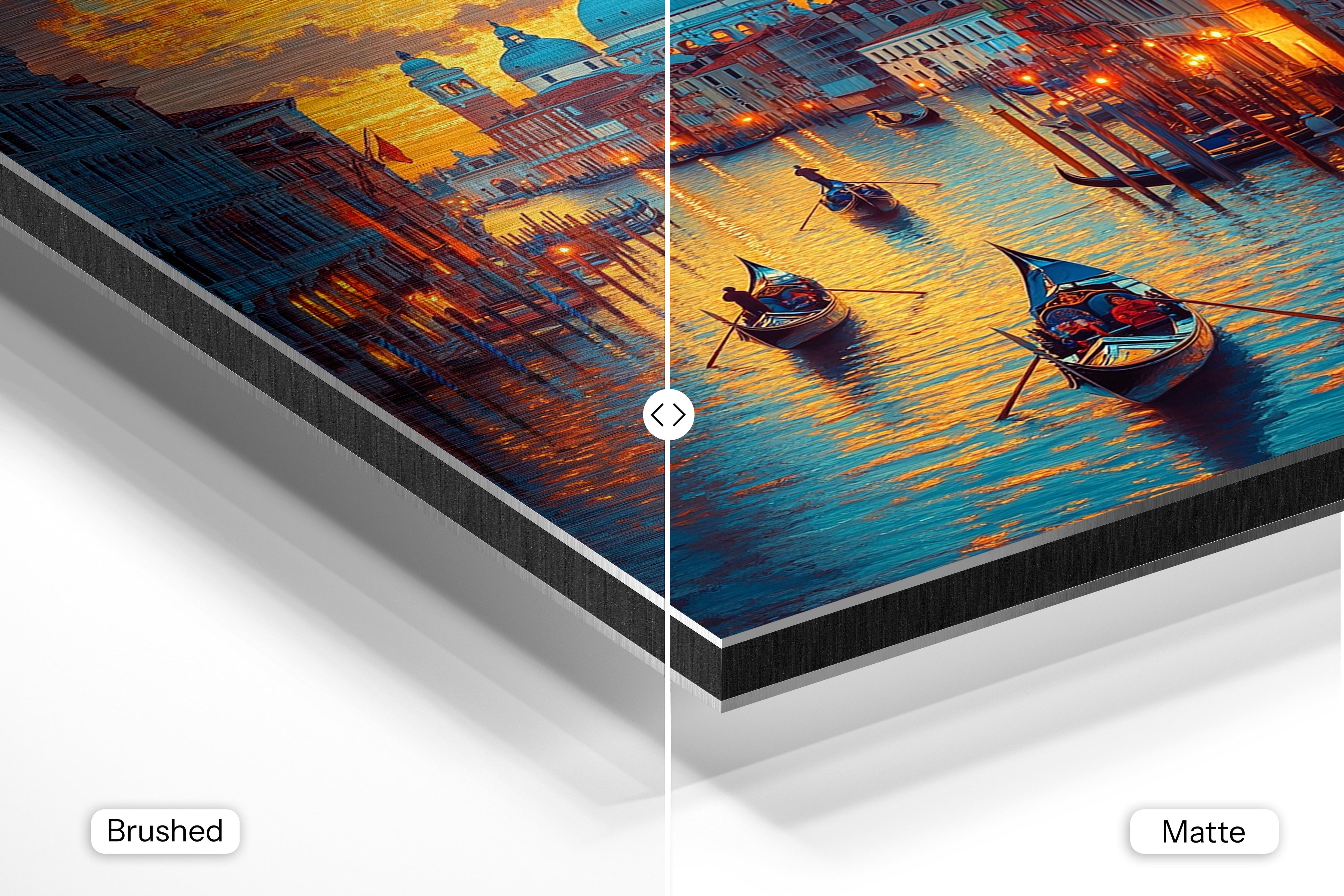 - Brushed Aluminum, on the other hand, features a raw metallic texture with visible brush strokes. Whites and highlights in your image let the silver surface show through, adding a dramatic, shimmering effect. Ideal for black-and-white images, minimalist designs, or abstract art, it creates a bold, industrial vibe with a modern edge.
