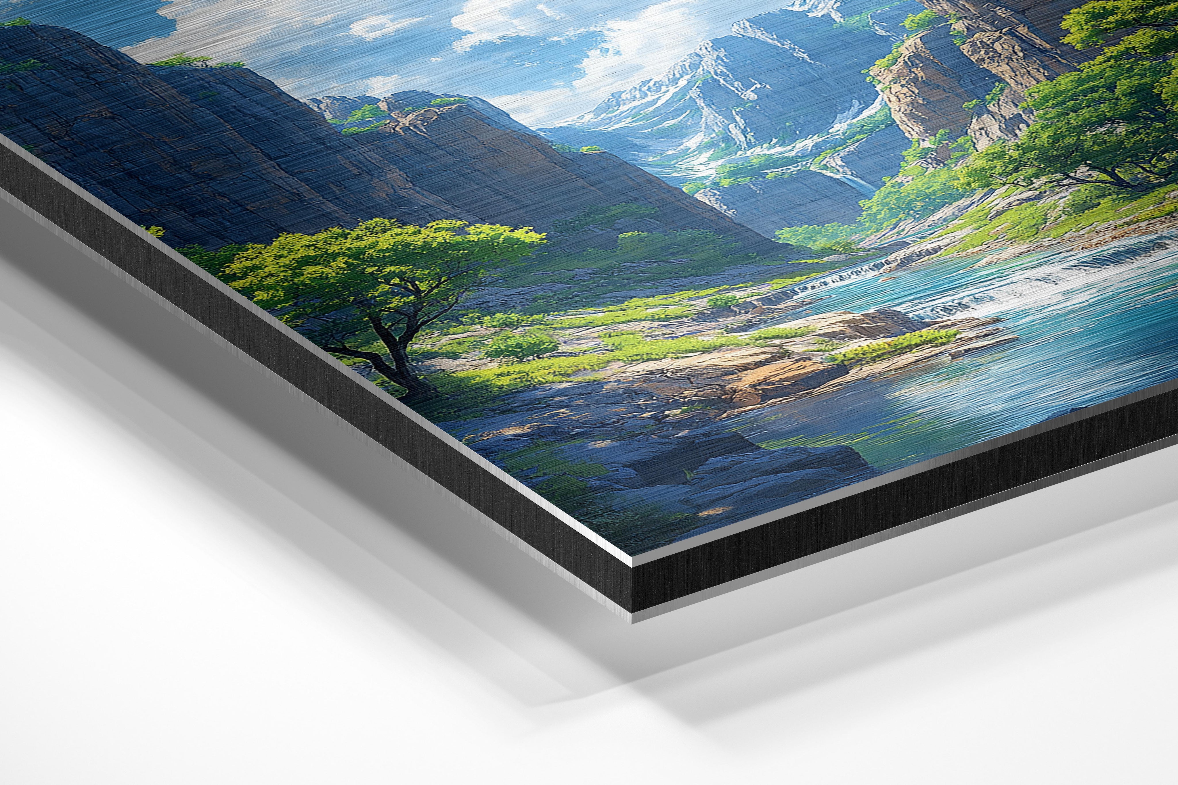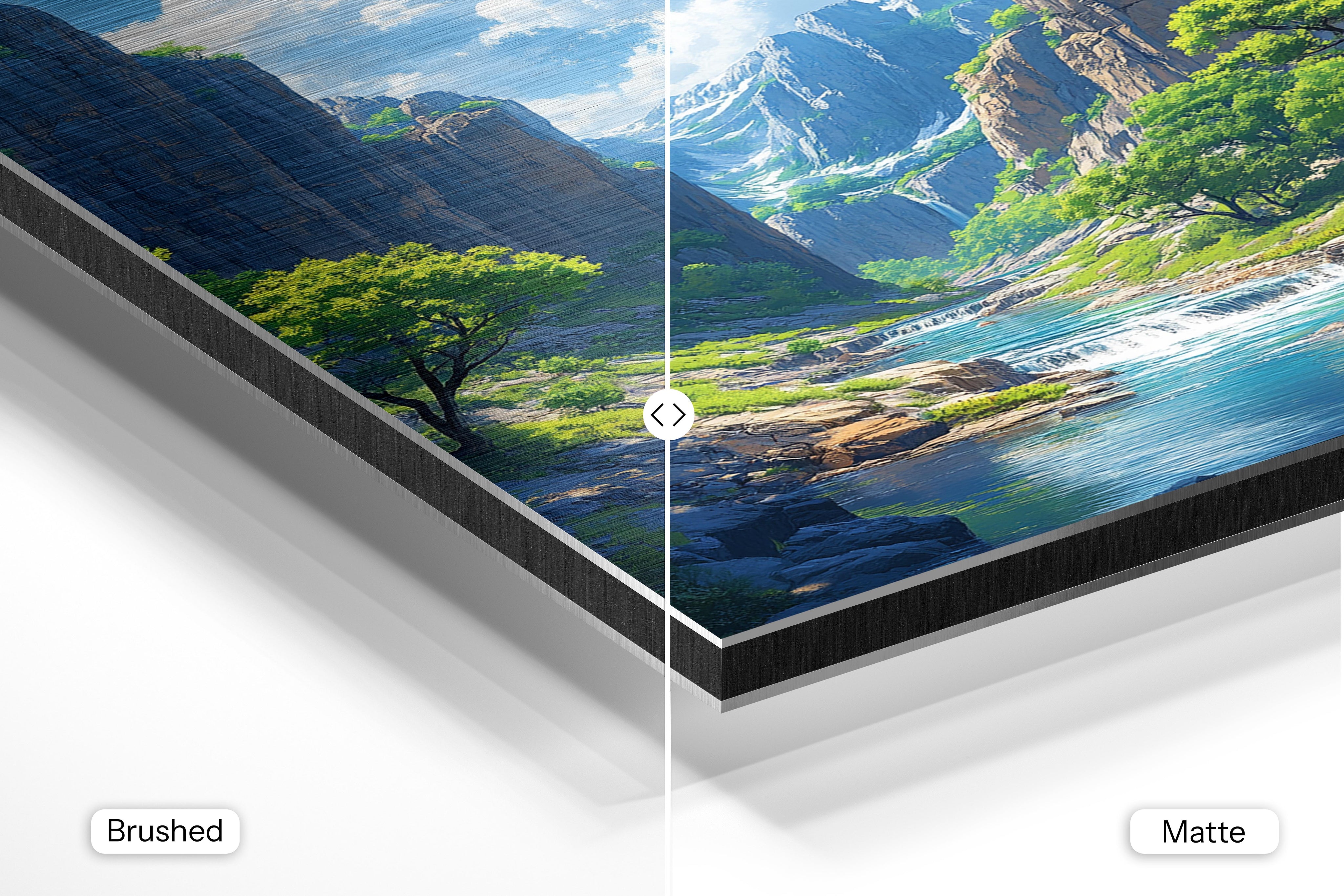 - Brushed Aluminum, on the other hand, features a raw metallic texture with visible brush strokes. Whites and highlights in your image let the silver surface show through, adding a dramatic, shimmering effect. Ideal for black-and-white images, minimalist designs, or abstract art, it creates a bold, industrial vibe with a modern edge.