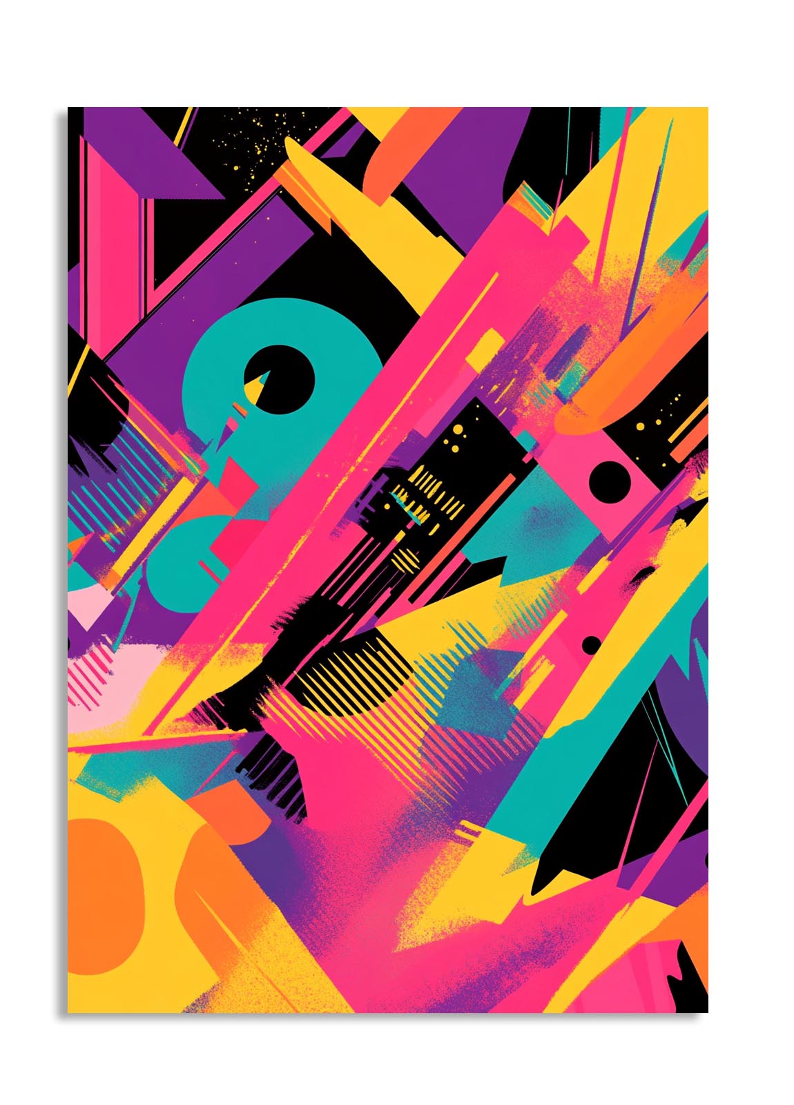 This image showcases a dynamic composition of vibrant colors and bold geometric shapes. The interplay of pinks, yellows, and teals creates an energetic and modern aesthetic, making it ideal for creative spaces like design studios or living rooms. The image evokes movement and artistic expression, inspiring creativity and boldness in any setting. Its abstract nature ensures versatility, allowing it to complement minimalist or eclectic decor styles seamlessly.