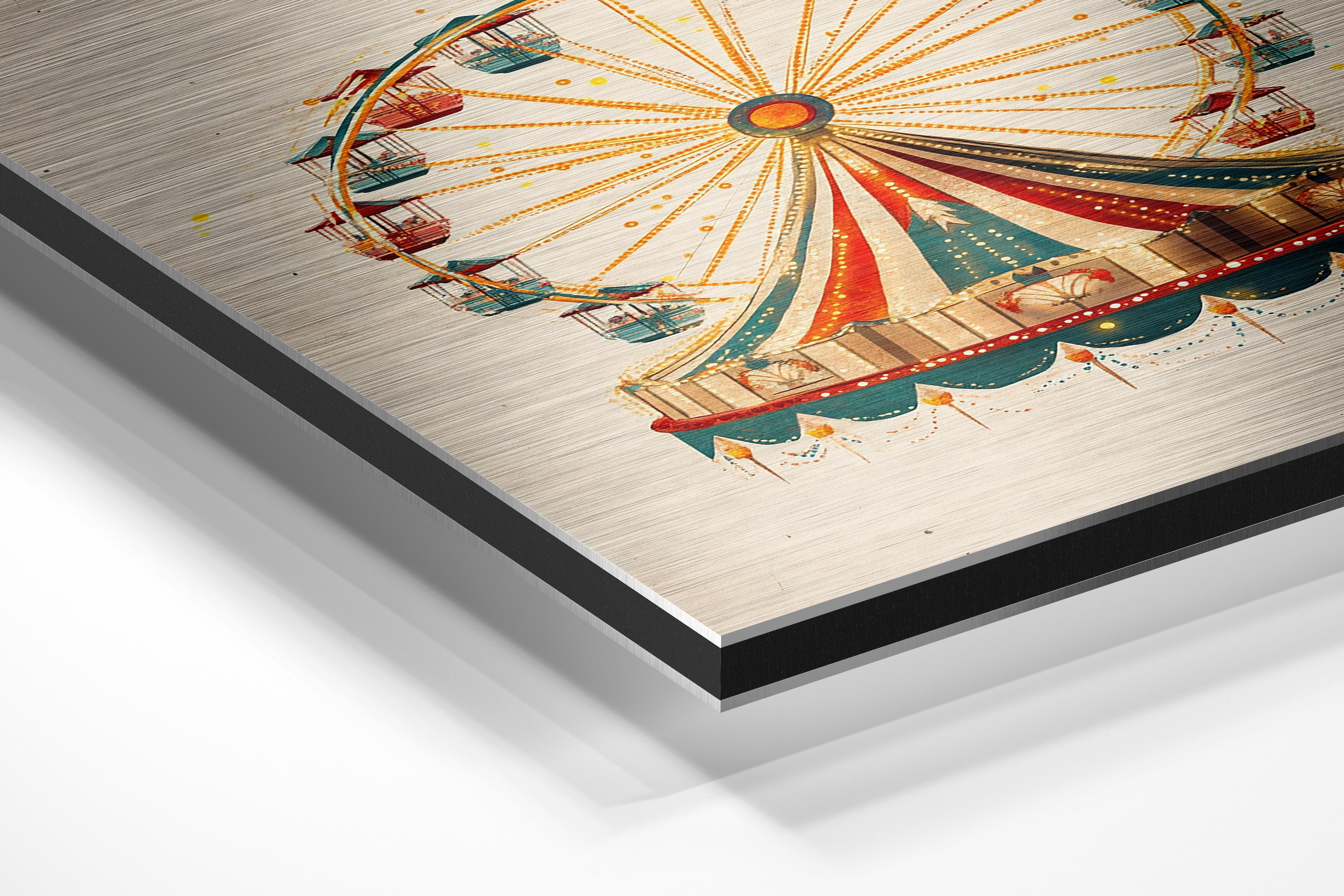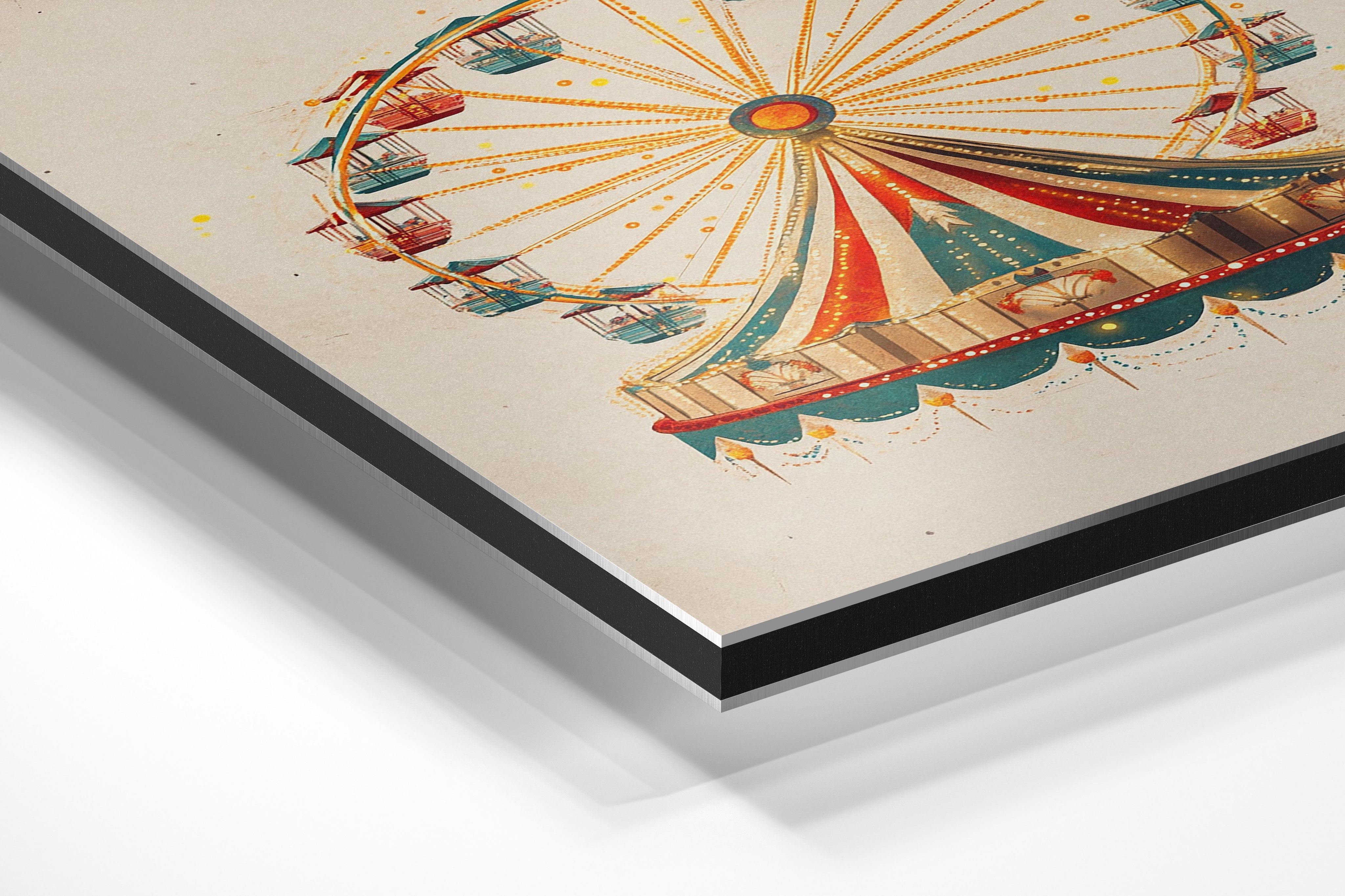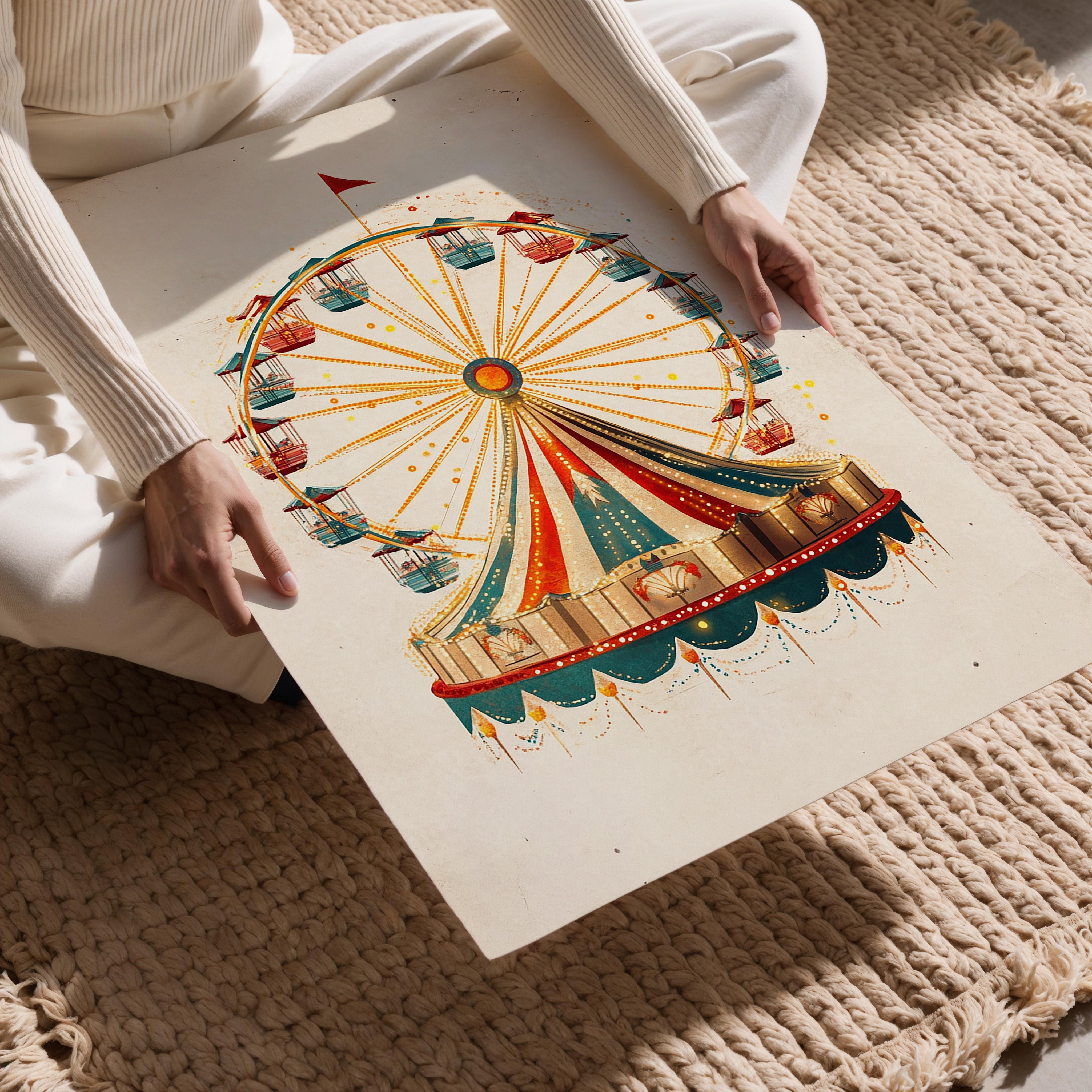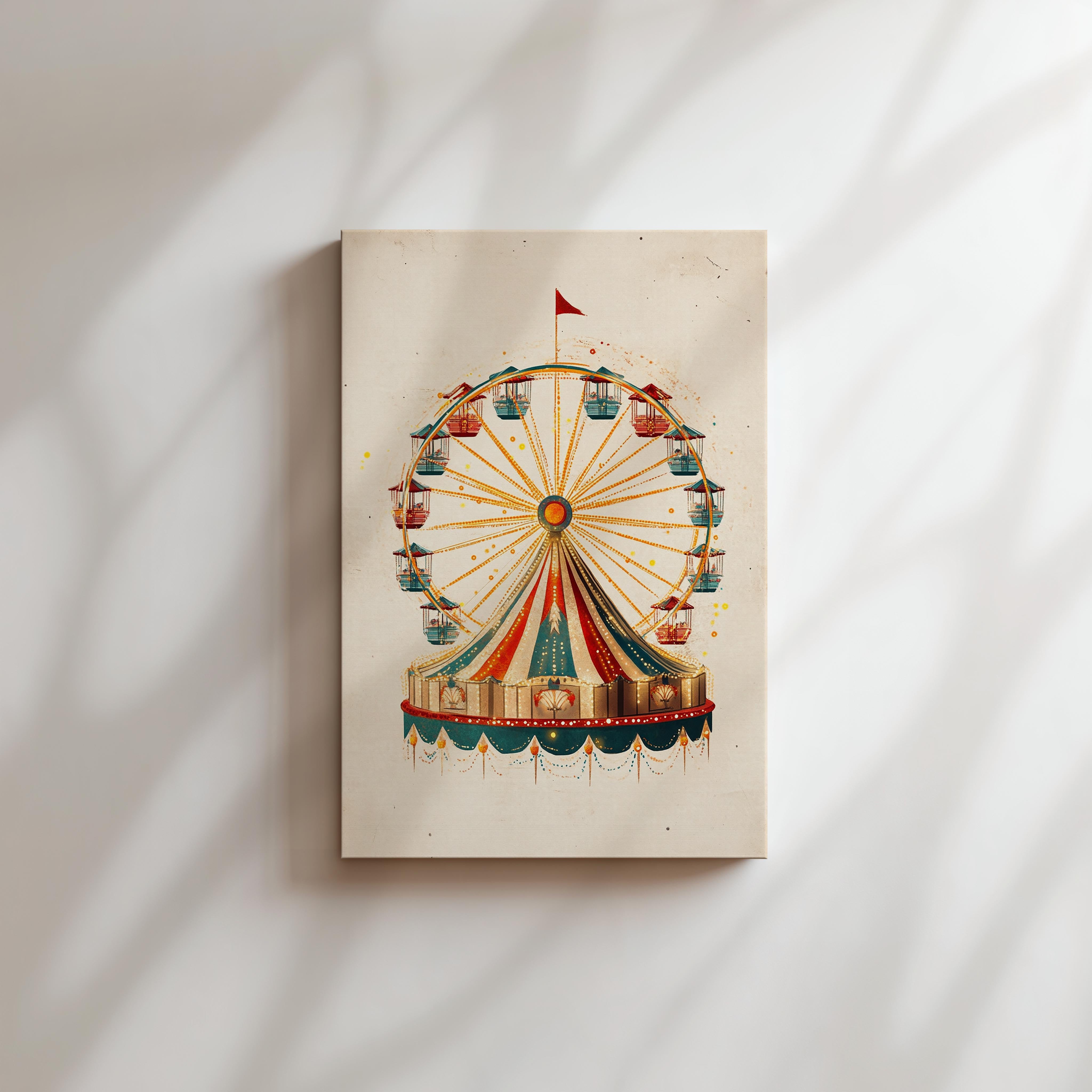 This vintage-inspired Ferris wheel illustration captures the timeless charm of old-fashioned fairs. Its muted yet cheerful color palette, combined with a retro aesthetic, creates a nostalgic mood. The carefully detailed structure and soft background make it an excellent addition to spaces with a rustic or vintage theme. Ideal for cafes, cozy living rooms, or recreational areas, this piece radiates the joy and simplicity of a bygone era of entertainment.