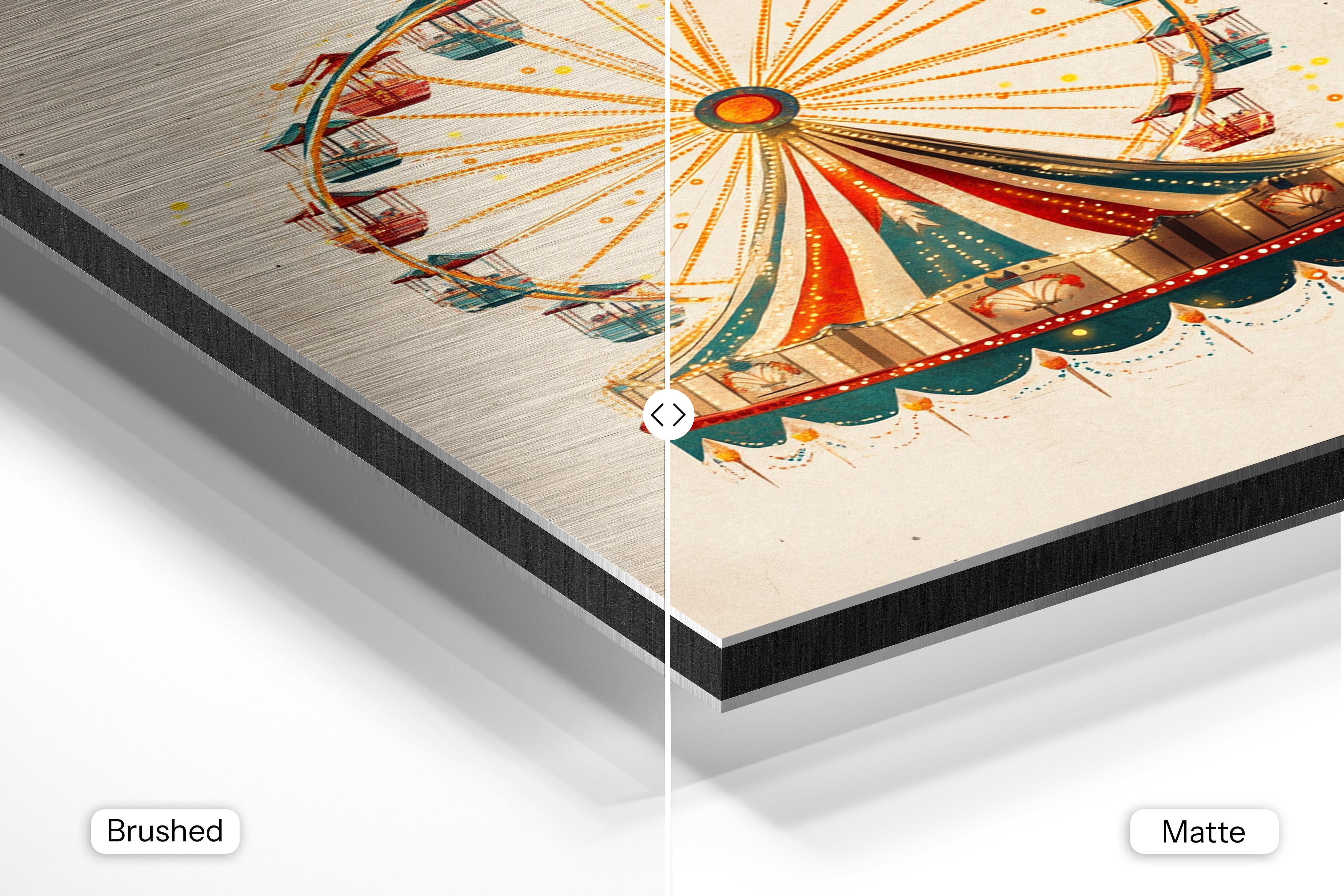 - Brushed Aluminum, on the other hand, features a raw metallic texture with visible brush strokes. Whites and highlights in your image let the silver surface show through, adding a dramatic, shimmering effect. Ideal for black-and-white images, minimalist designs, or abstract art, it creates a bold, industrial vibe with a modern edge.