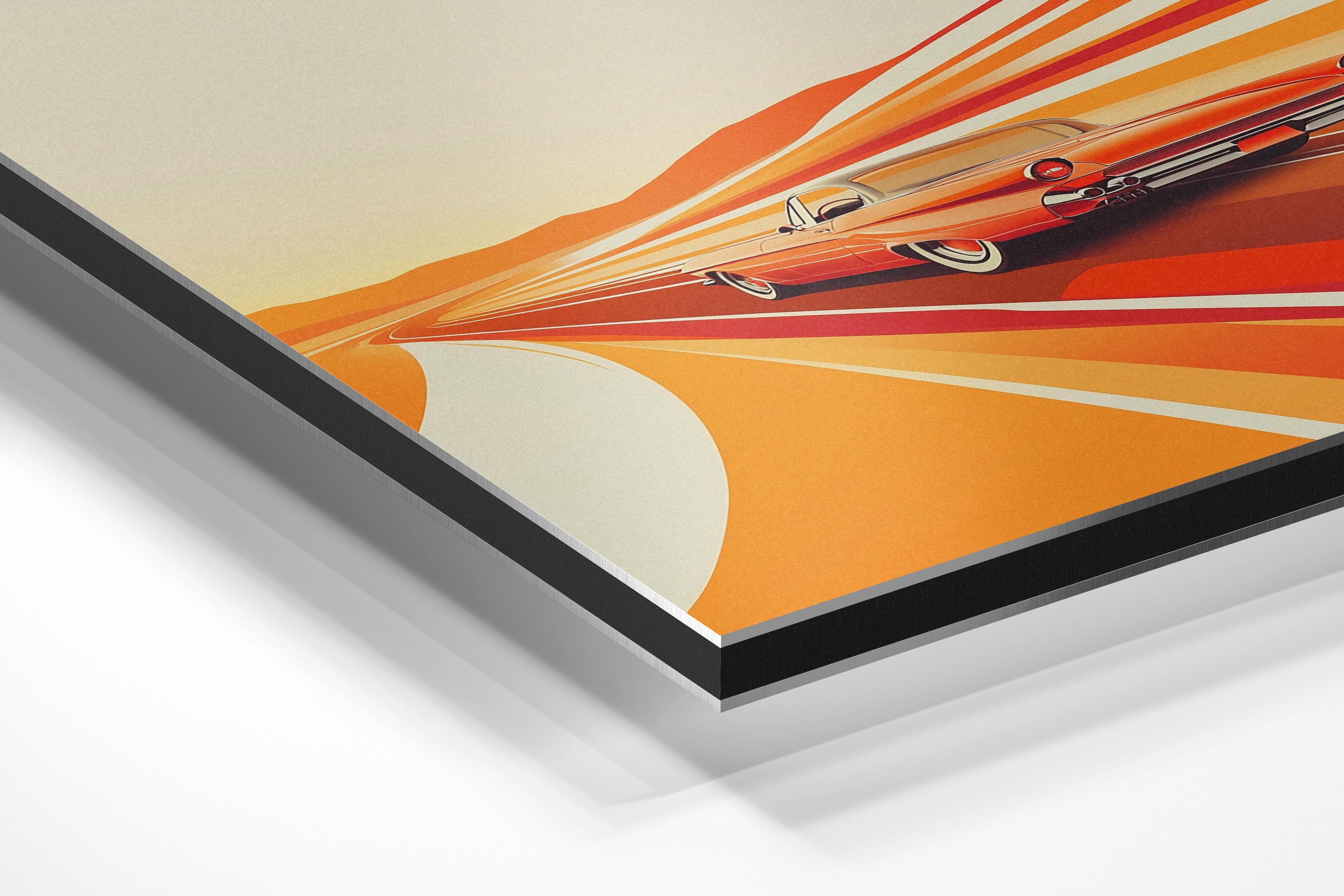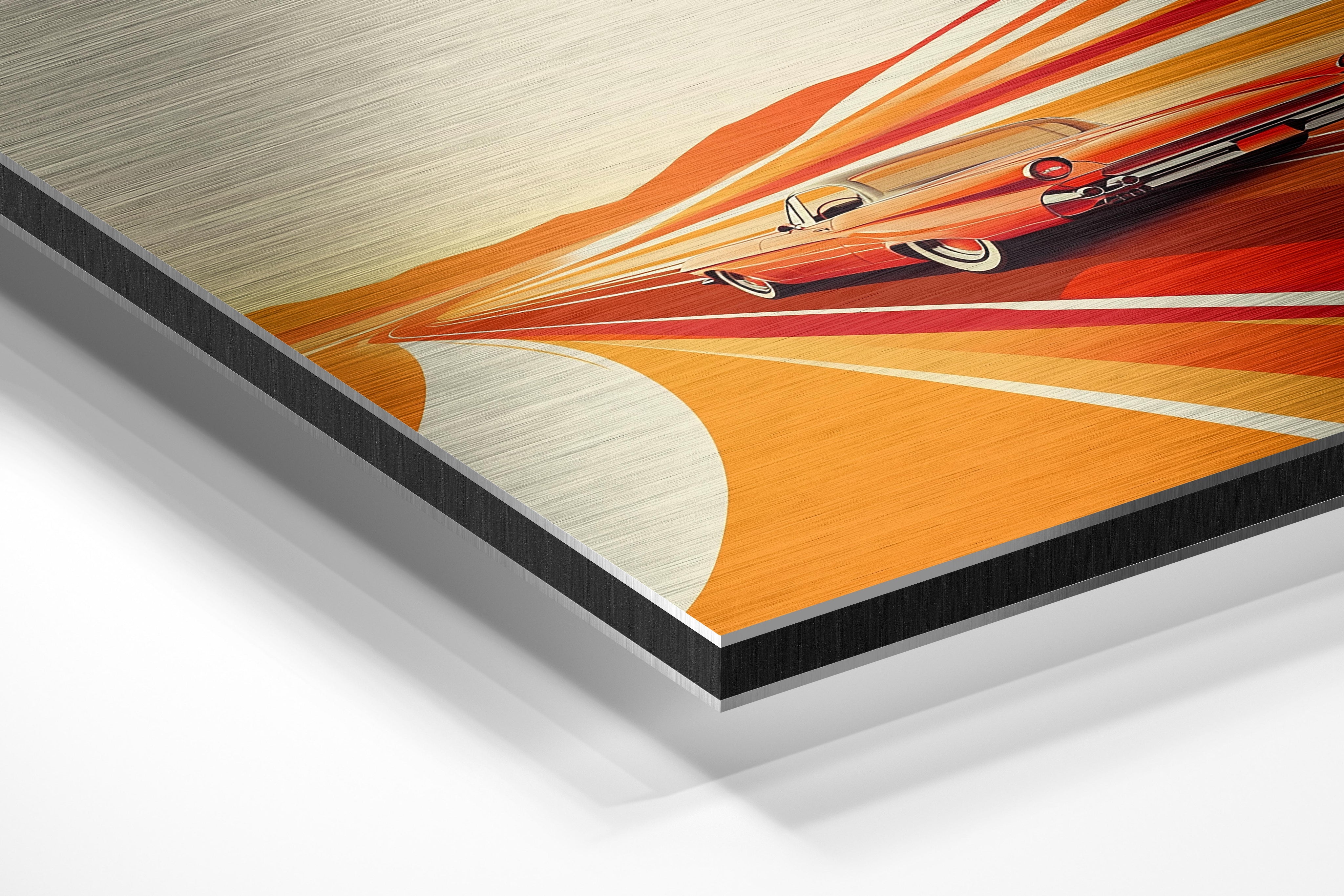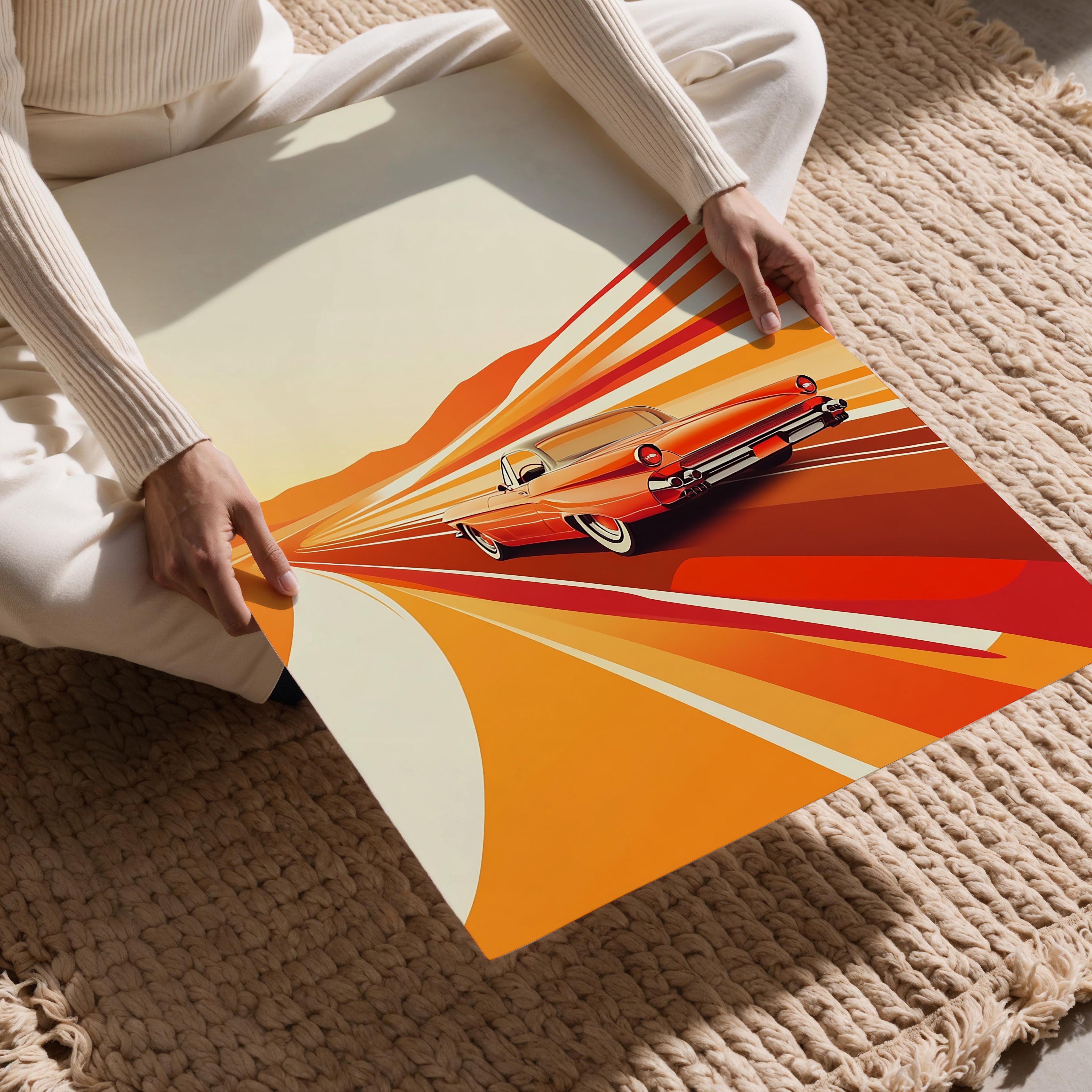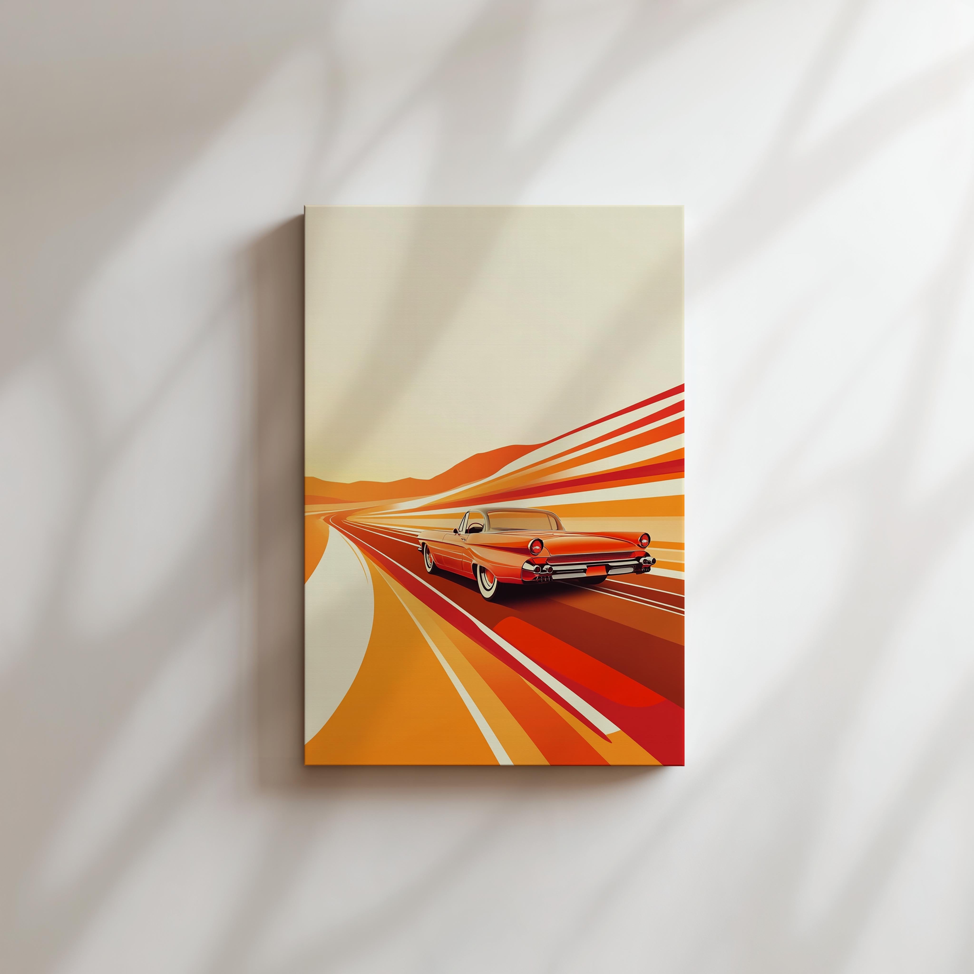 A nostalgic portrayal of a classic car driving down a colorful, abstract road. The playful patterns and retro color palette convey the joy and excitement of a vintage road trip. This artwork is perfect for creating a cheerful and lively atmosphere in living spaces or for car enthusiasts seeking a whimsical touch to their decor.
