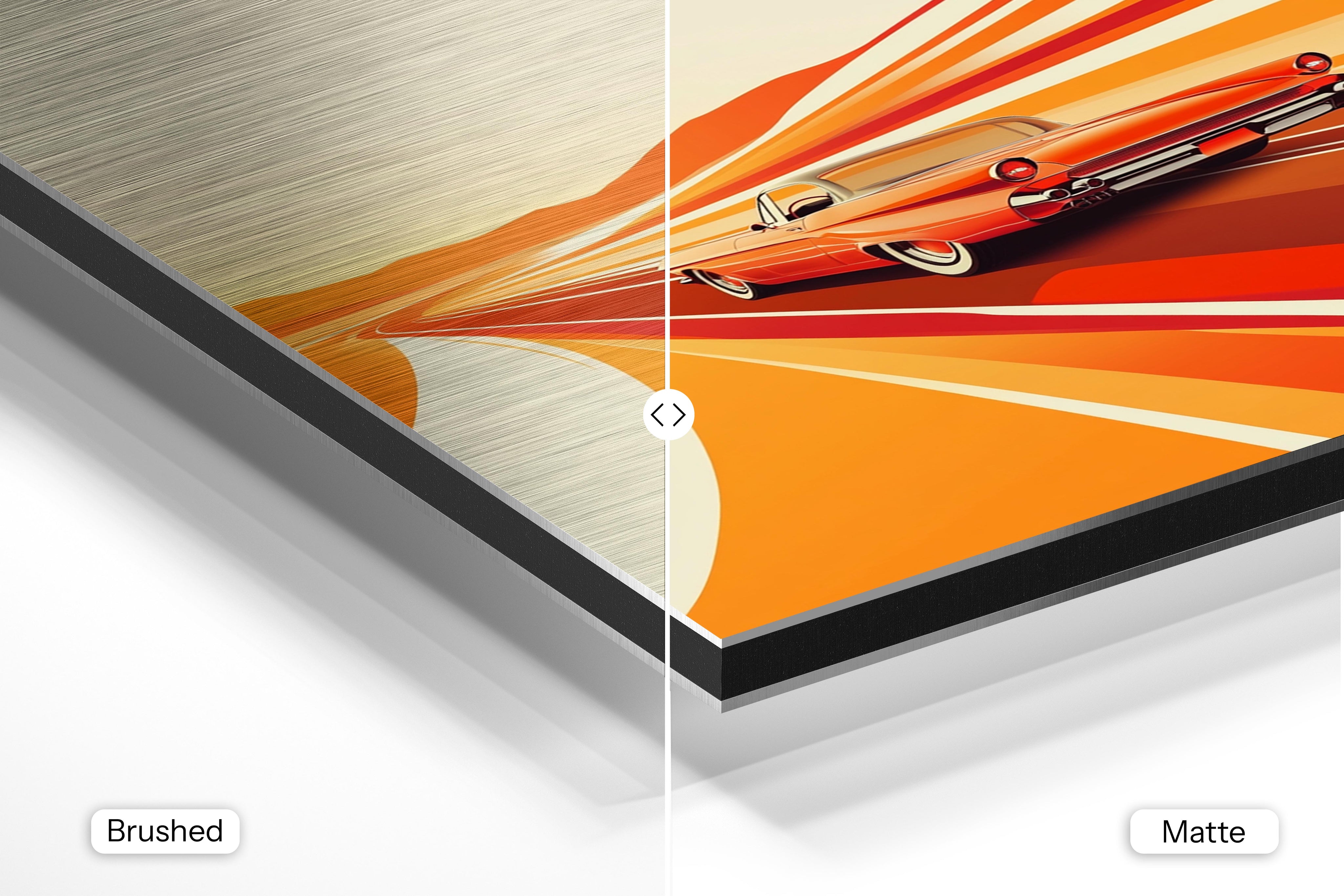 - Brushed Aluminum, on the other hand, features a raw metallic texture with visible brush strokes. Whites and highlights in your image let the silver surface show through, adding a dramatic, shimmering effect. Ideal for black-and-white images, minimalist designs, or abstract art, it creates a bold, industrial vibe with a modern edge.