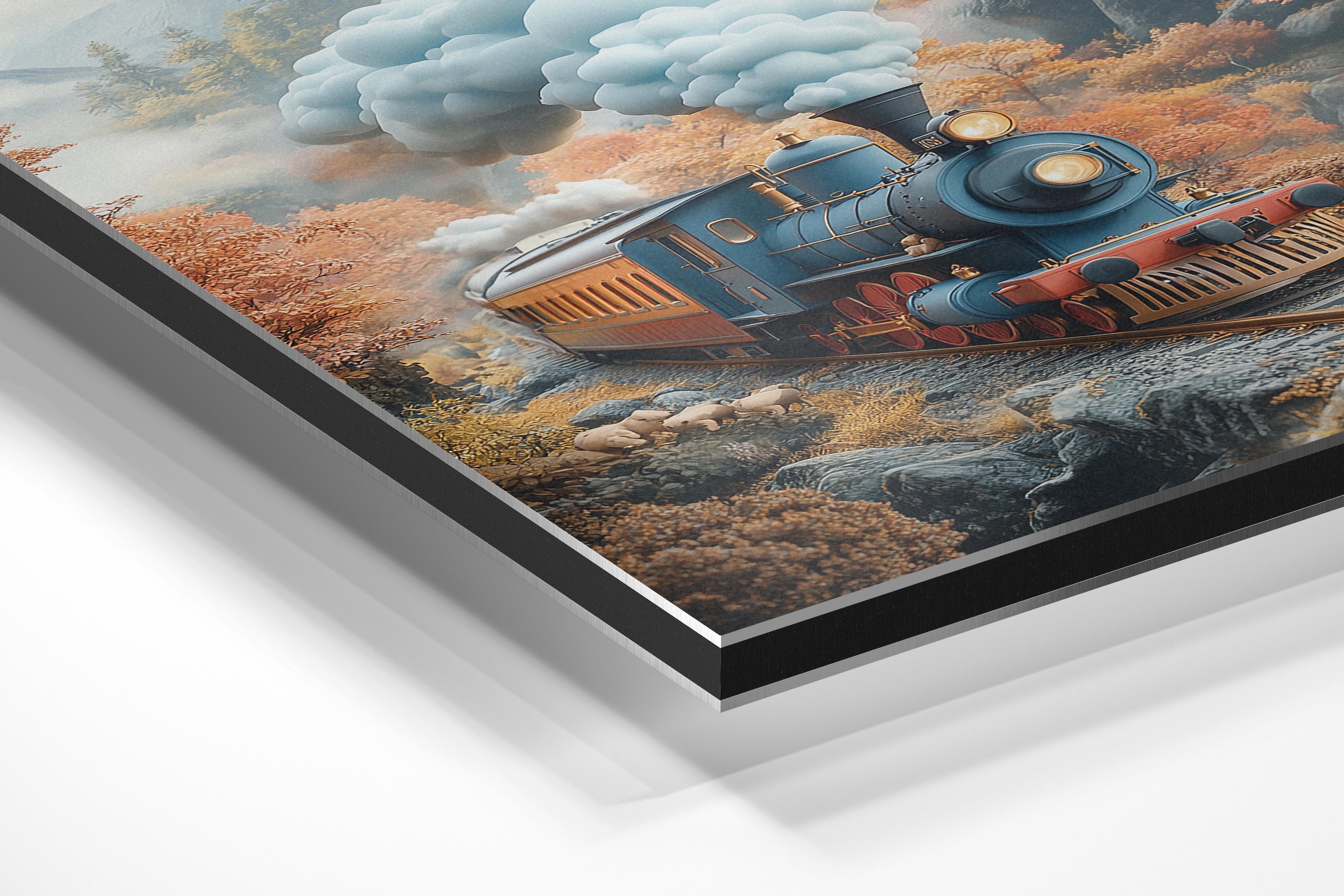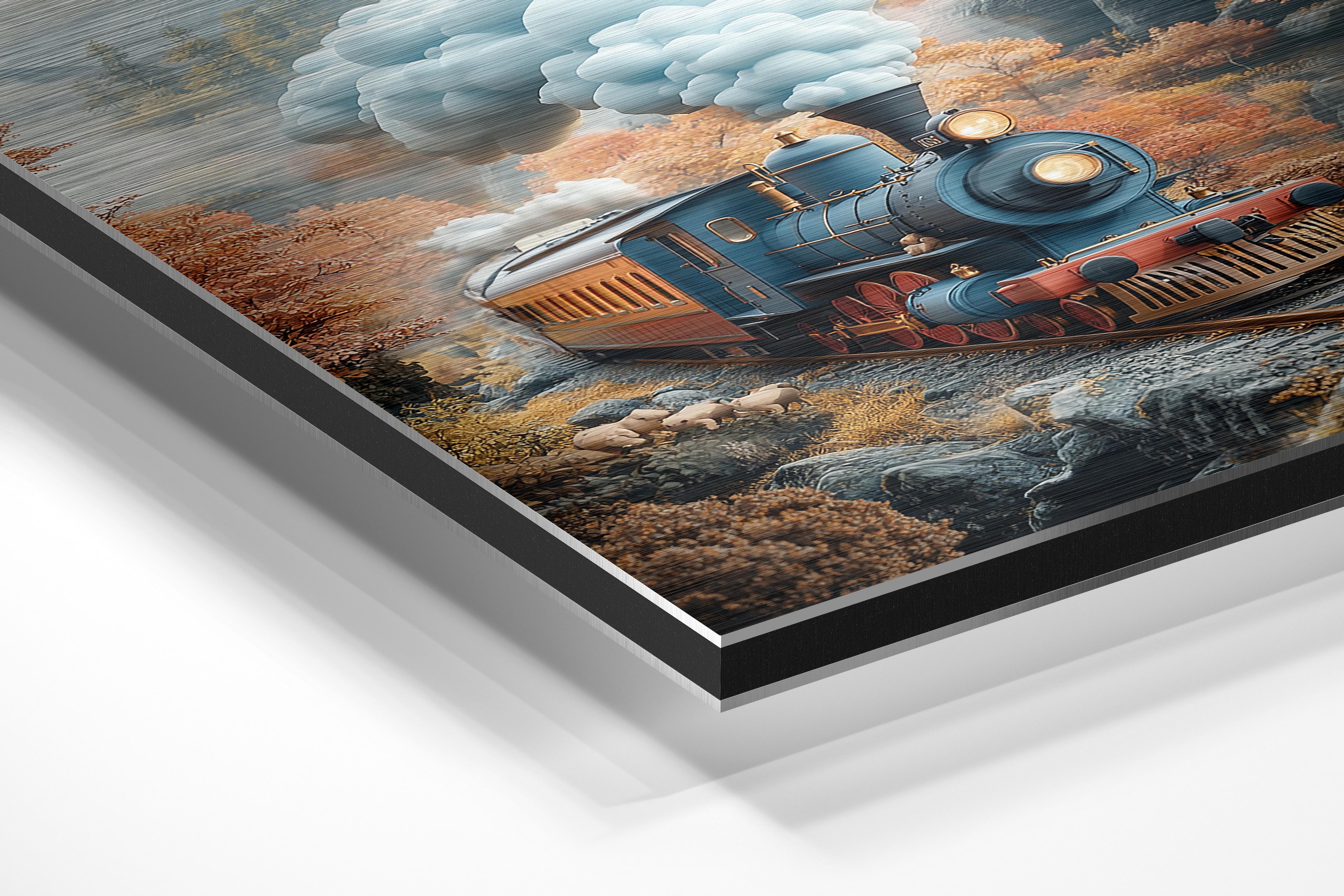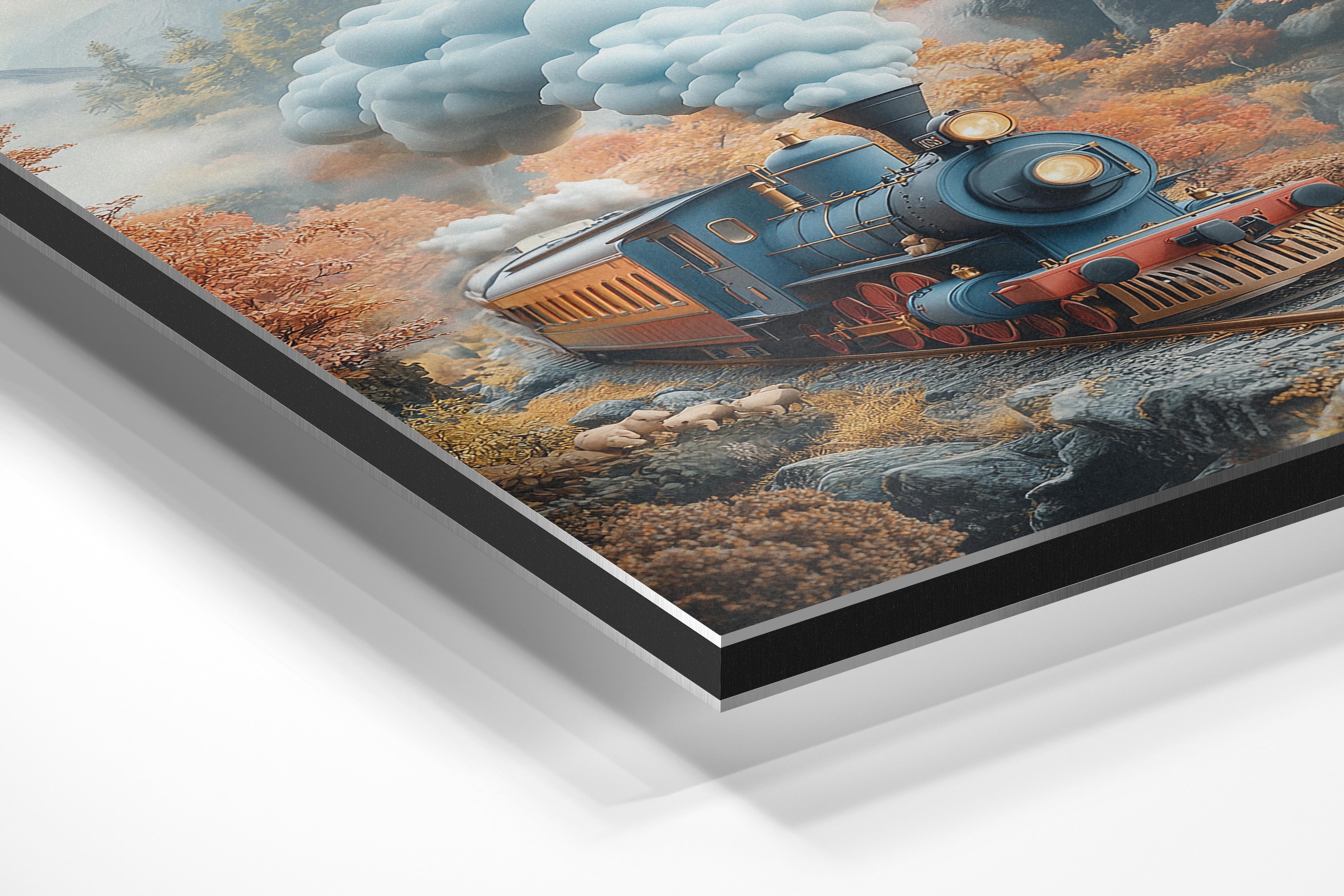 A nostalgic depiction of a vintage train steaming through a picturesque autumn landscape. The warm tones of the fall foliage and the detailed design of the train evoke a sense of adventure and romance. The composition captures movement and nostalgia, making it perfect for a living room, office, or hallway. This piece appeals to travel enthusiasts and those with a love for classic aesthetics.