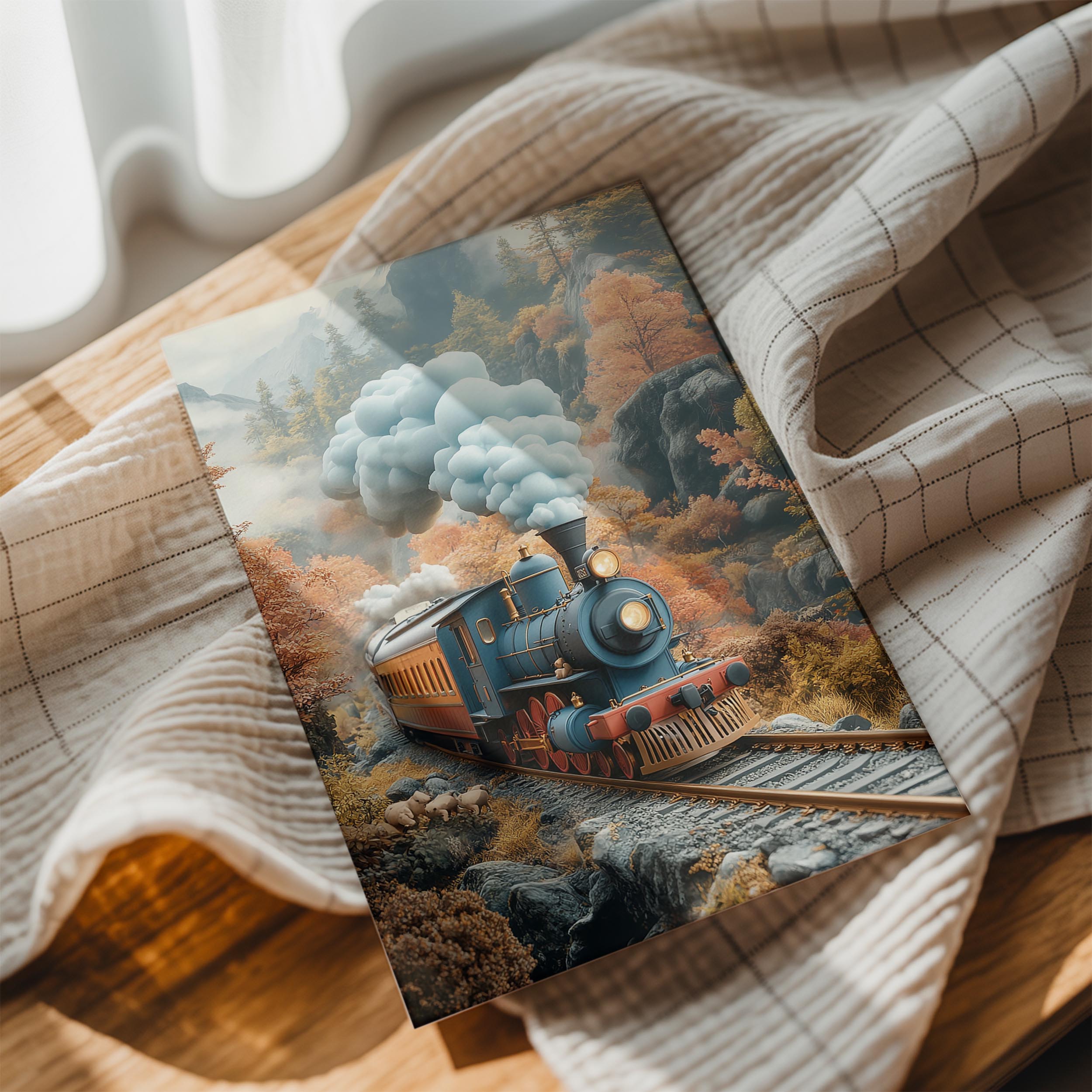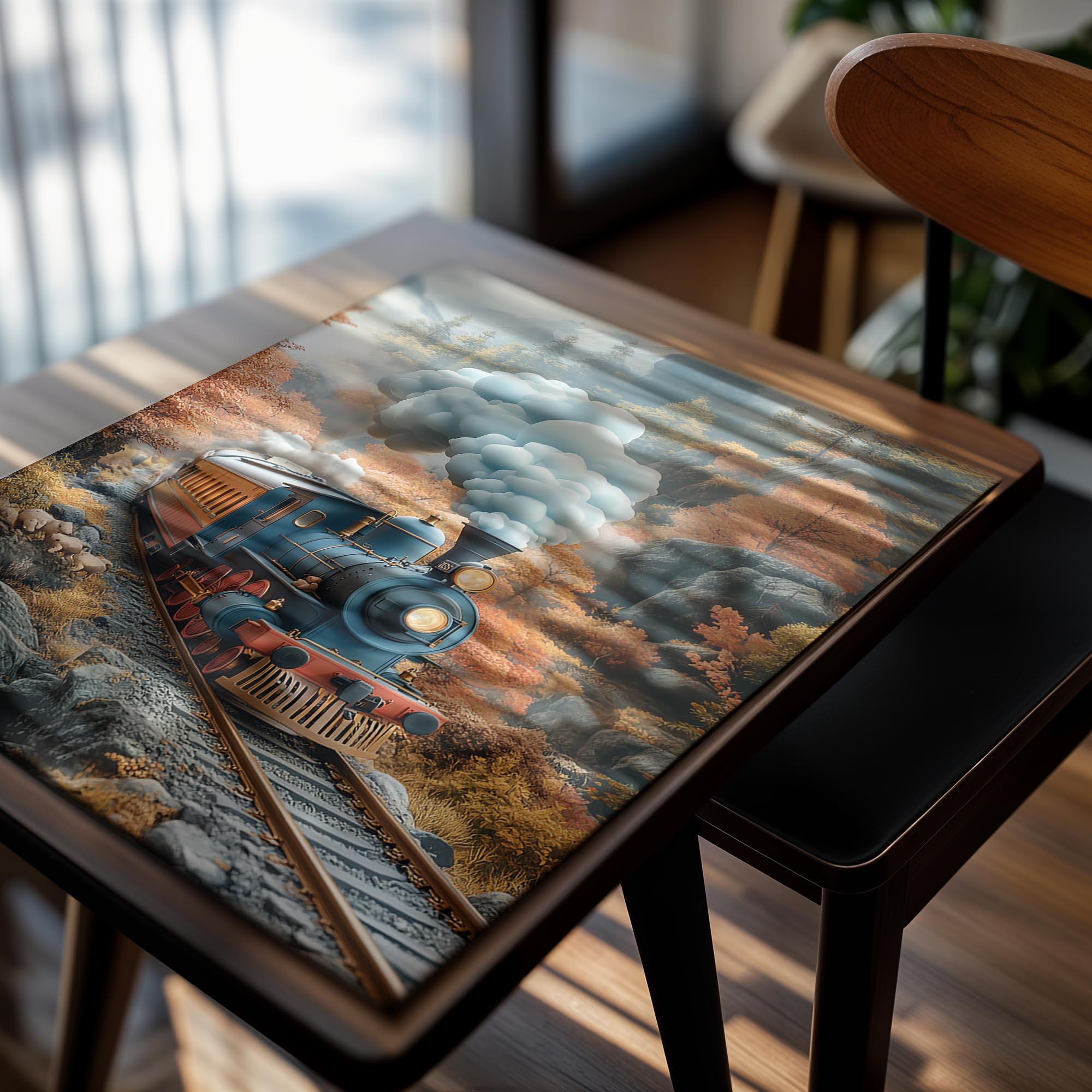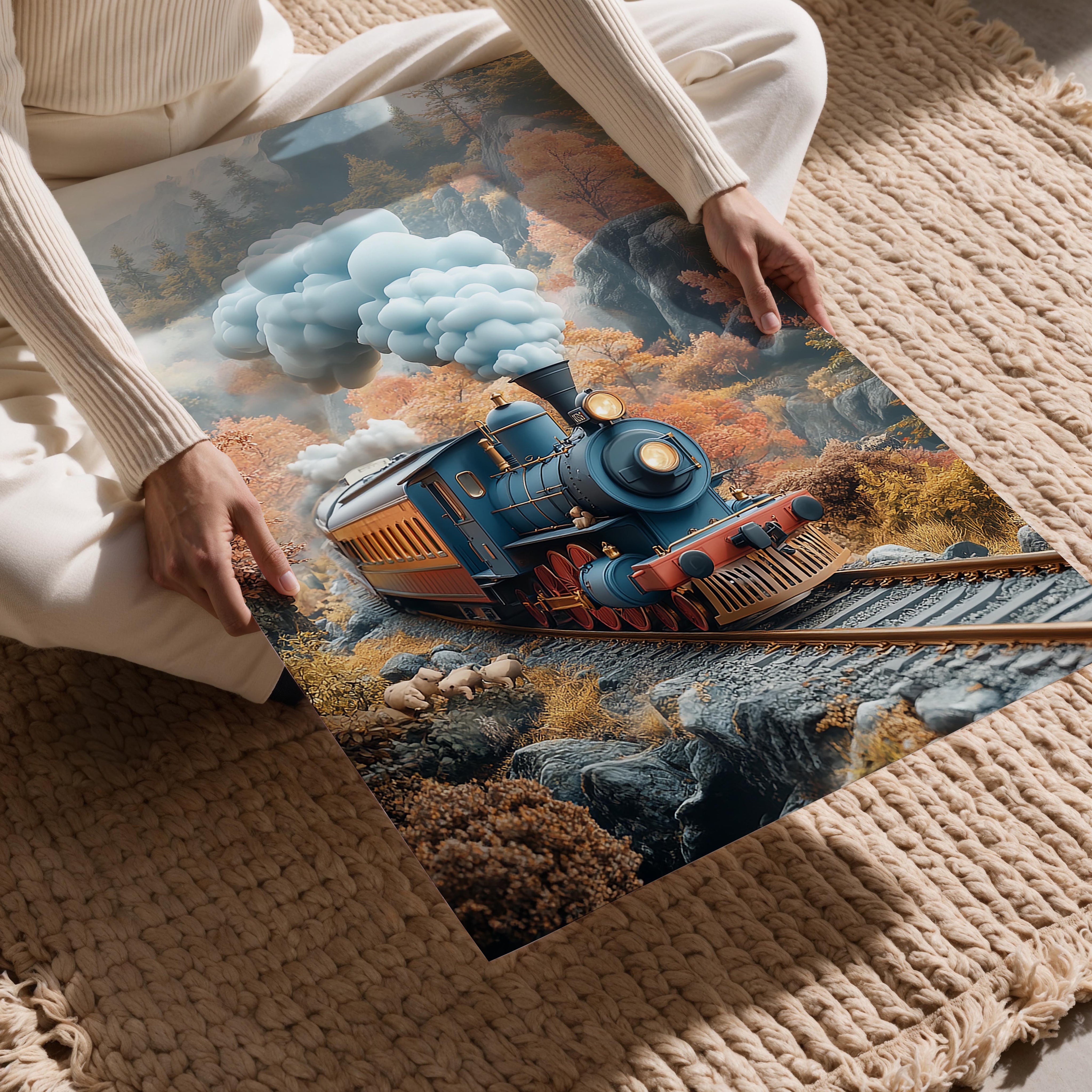 A nostalgic depiction of a vintage train steaming through a picturesque autumn landscape. The warm tones of the fall foliage and the detailed design of the train evoke a sense of adventure and romance. The composition captures movement and nostalgia, making it perfect for a living room, office, or hallway. This piece appeals to travel enthusiasts and those with a love for classic aesthetics.