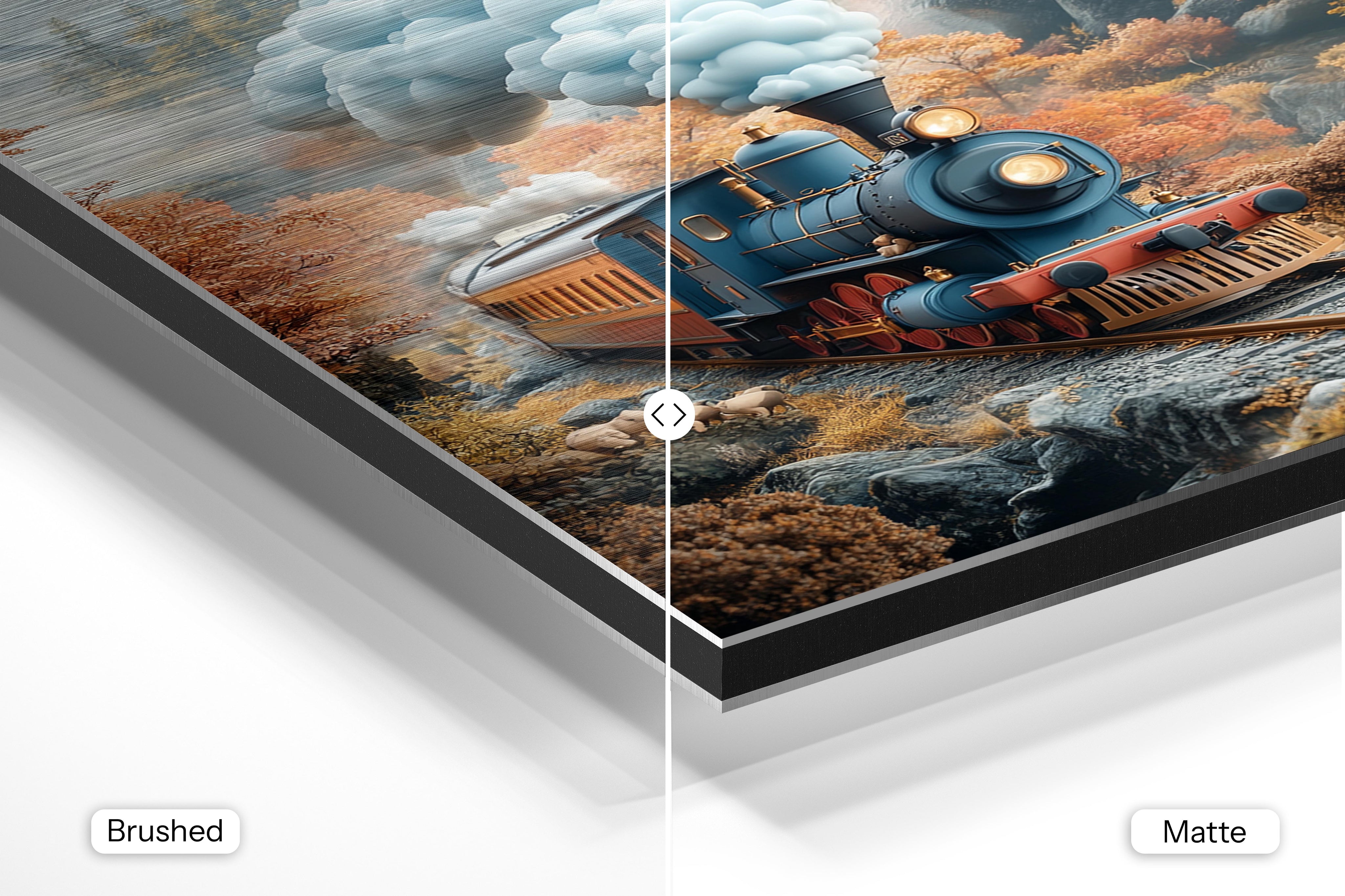 - Brushed Aluminum, on the other hand, features a raw metallic texture with visible brush strokes. Whites and highlights in your image let the silver surface show through, adding a dramatic, shimmering effect. Ideal for black-and-white images, minimalist designs, or abstract art, it creates a bold, industrial vibe with a modern edge.