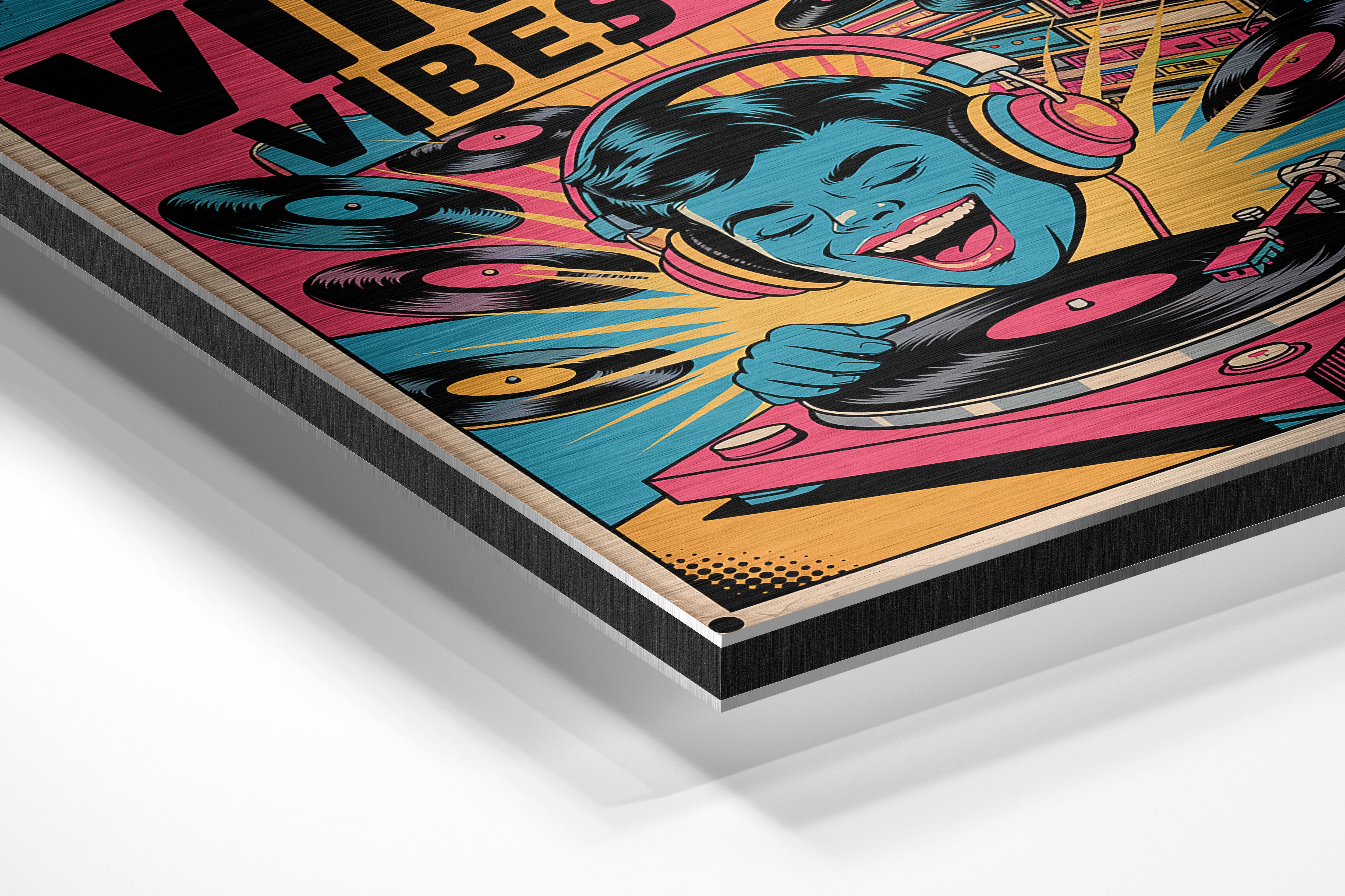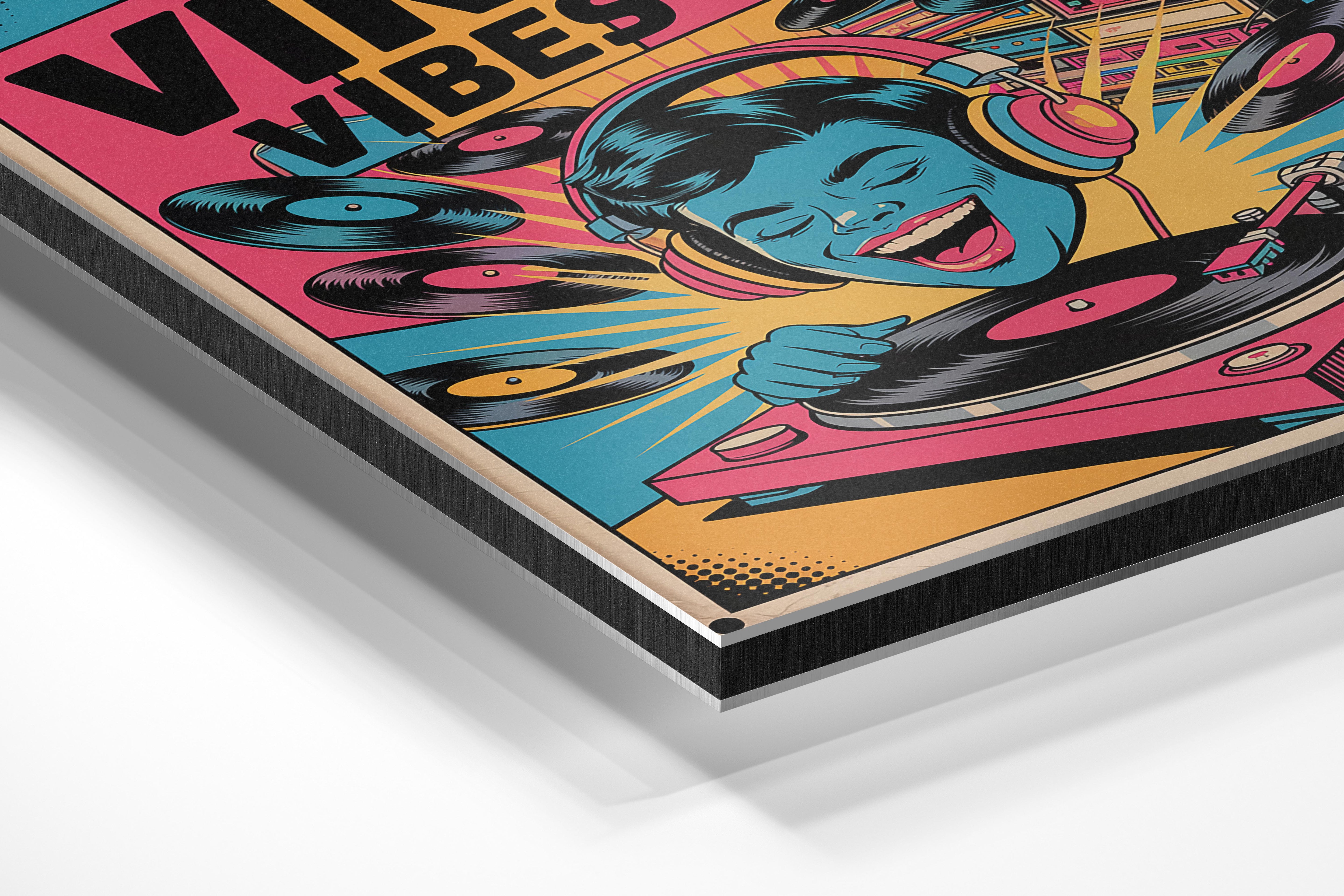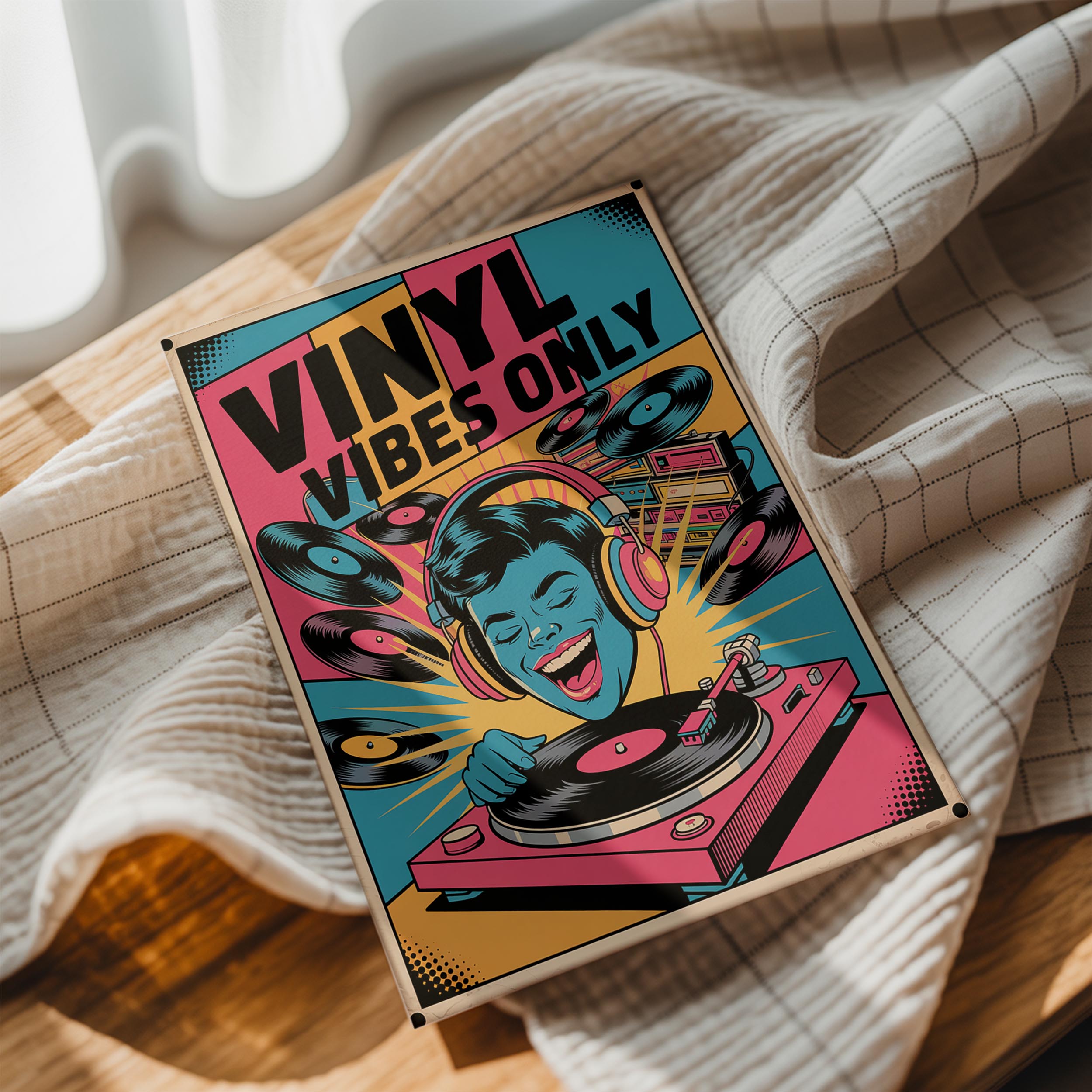 This electrifying illustration centers around a vibrant DJ spinning records with visible joy as vinyl discs fly through the air. The bold text “VINYL VIBES ONLY” dominates the upper part, emphasizing the artwork’s musical focus. With a retro color scheme of teal, pink, and yellow, and a dynamic layout filled with motion lines and speakers, the piece brings auditory excitement to visual life. Ideal for music rooms, lounges, or record shops, it celebrates the analog era and radiates party energy. This artwork is perfect for those who appreciate the timeless charm of vinyl and the culture that surrounds it.