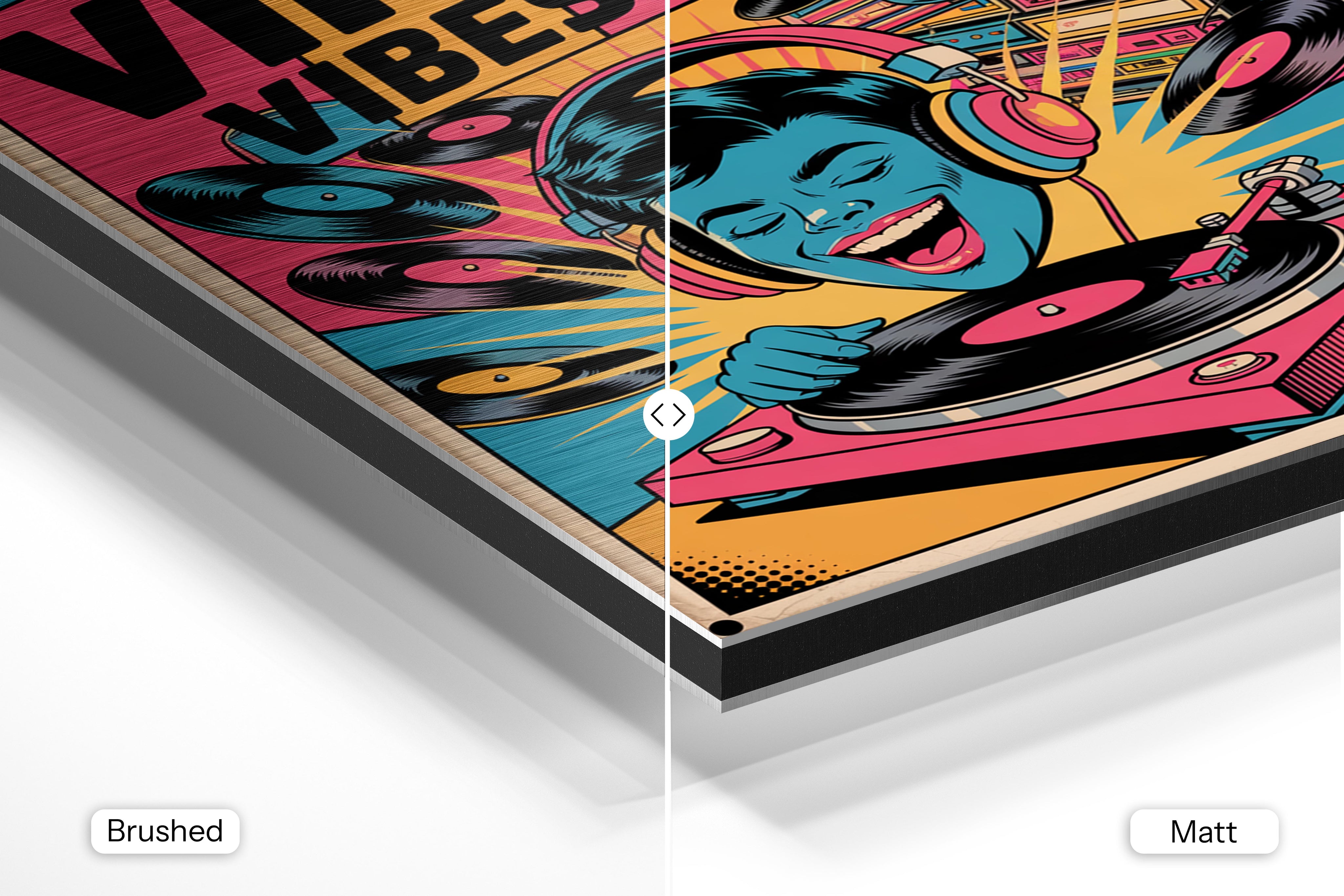 - Matte Aluminum offers a smooth, bright white surface that delivers crisp details and vibrant, true-to-life colors. With its non-reflective finish and subtle silky sheen, it’s perfect for photography, portraits, and colorful artwork—bringing a clean, polished look to any interior.