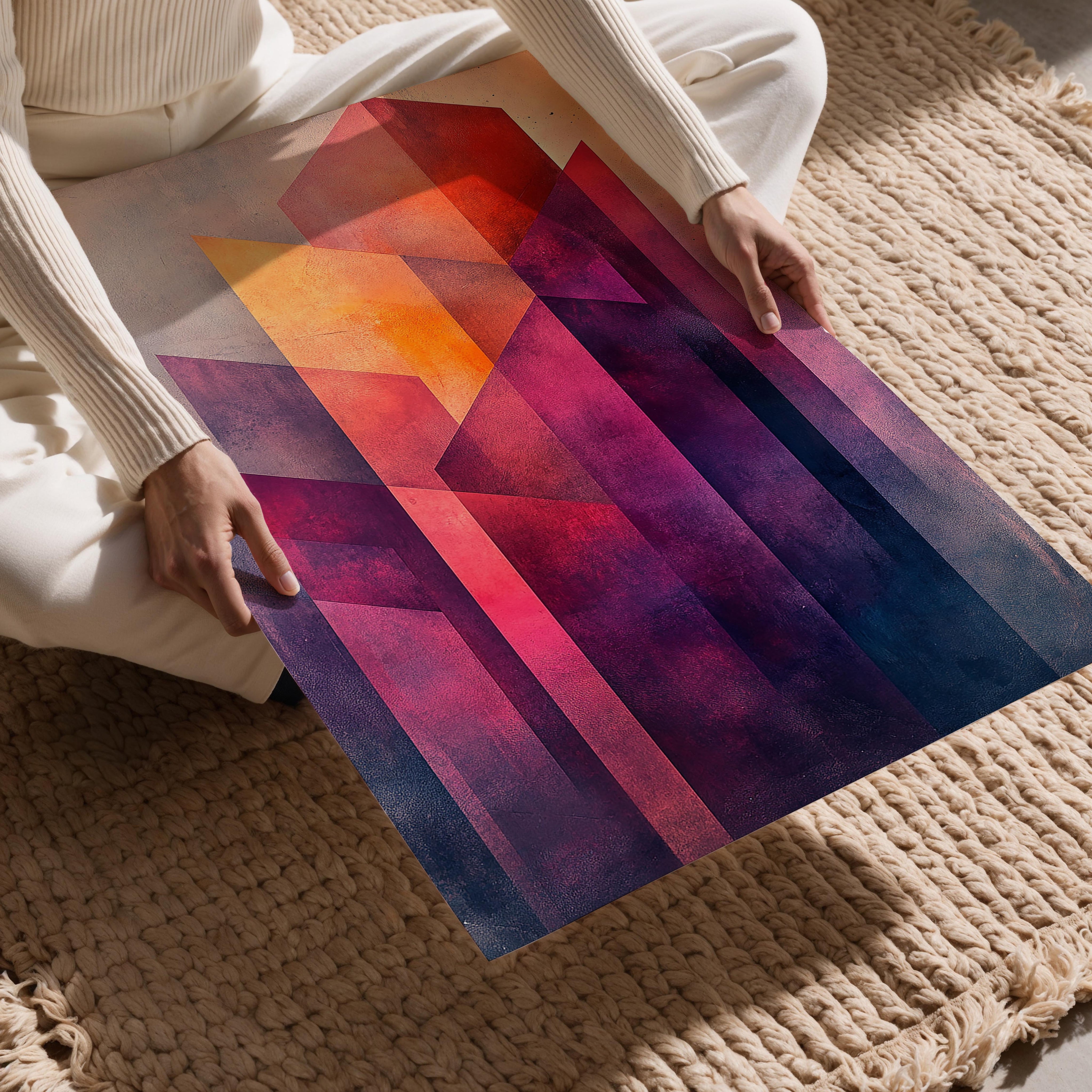 This artwork’s bold geometric shapes evoke a modern skyline, layered with shades of red, orange, and purple. The dramatic interplay of light and shadow creates a dynamic, engaging piece. Perfect for offices or contemporary homes, it makes a bold statement while complementing minimalist spaces. Its urban-inspired aesthetic adds energy and sophistication, appealing to those seeking unique, visually impactful decor. Ideal for spaces that emphasize structure and creativity.