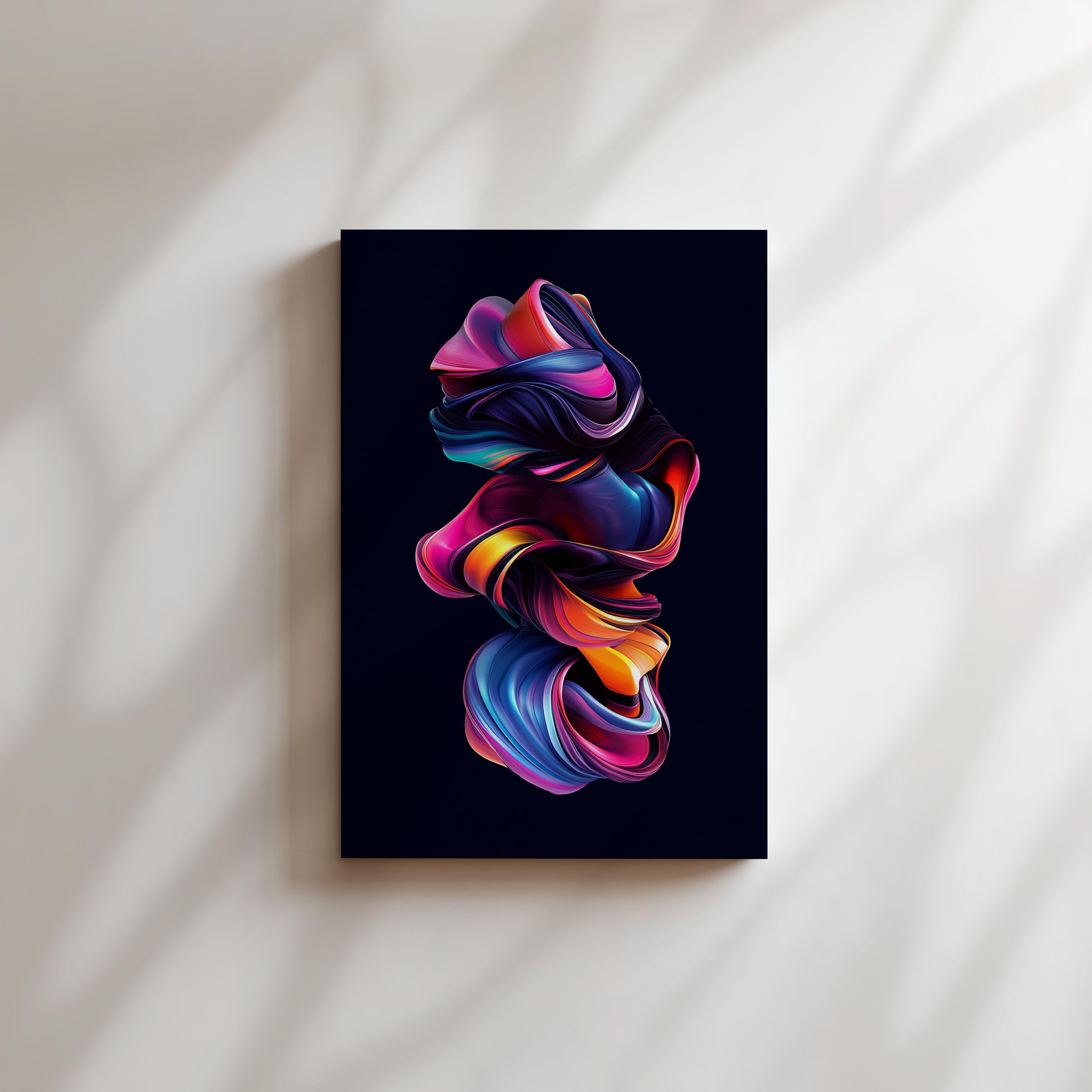 This bold abstract artwork features a swirling, ribbon-like form in vibrant shades of magenta, blue, orange, and purple. The dynamic composition evokes movement and energy, making it an ideal centerpiece for spaces that value bold expressions of creativity. Its modern appeal makes it a great fit for galleries, chic living spaces, or offices where innovation is a theme. This artwork will surely command attention wherever it is displayed.