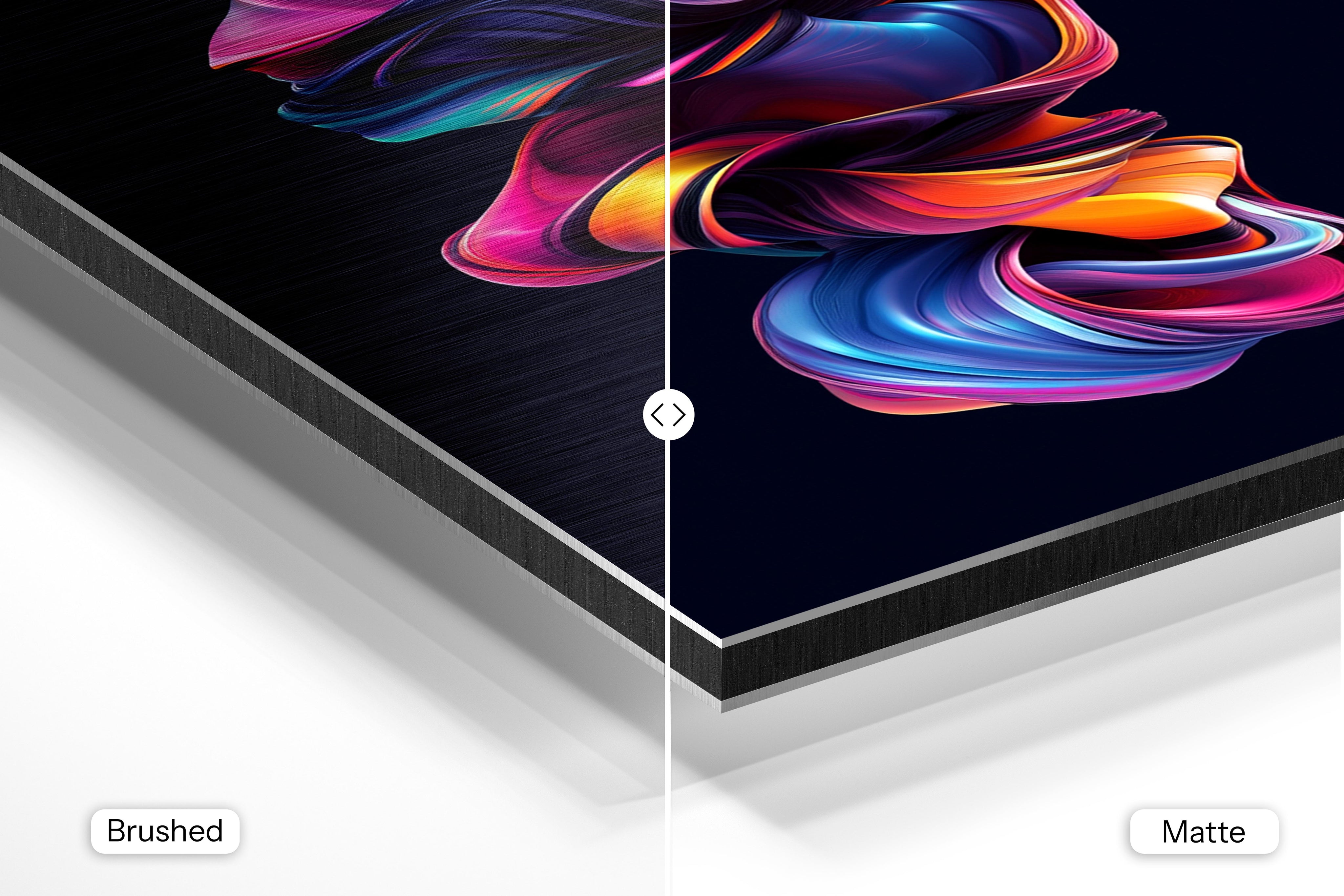 - Brushed Aluminum, on the other hand, features a raw metallic texture with visible brush strokes. Whites and highlights in your image let the silver surface show through, adding a dramatic, shimmering effect. Ideal for black-and-white images, minimalist designs, or abstract art, it creates a bold, industrial vibe with a modern edge.