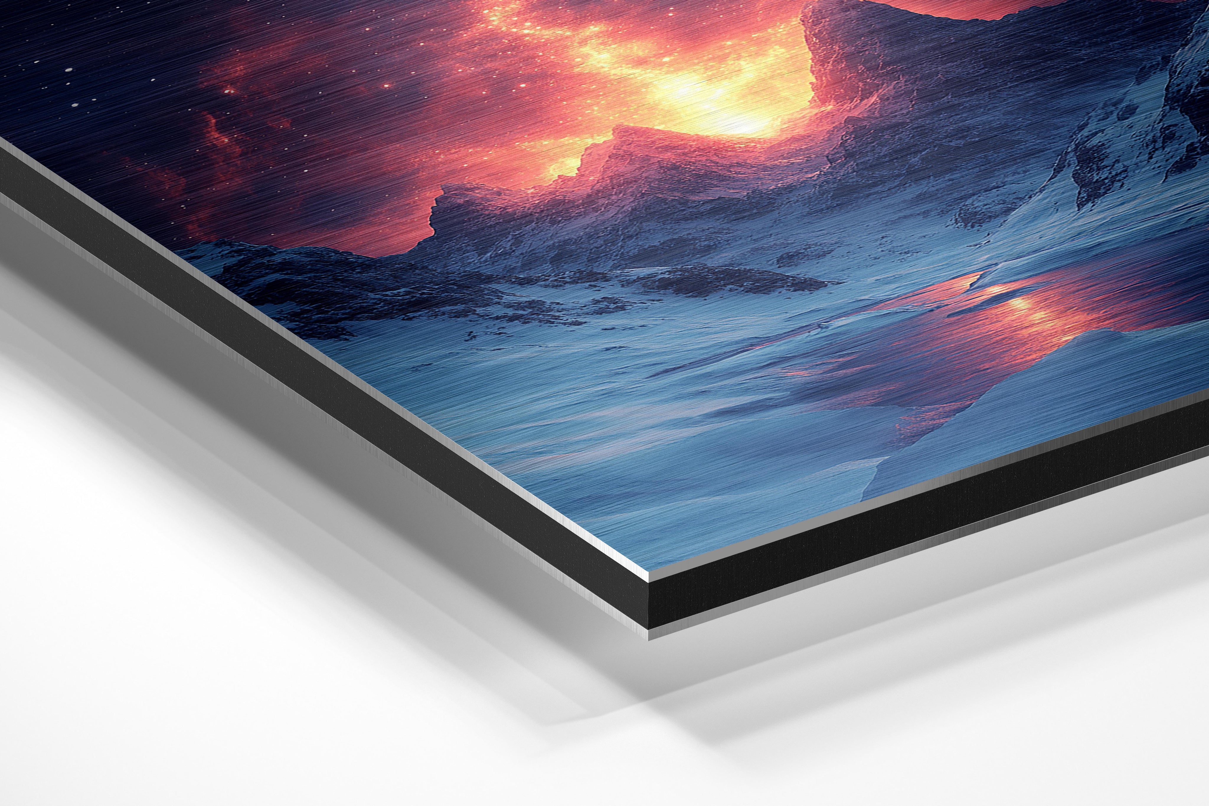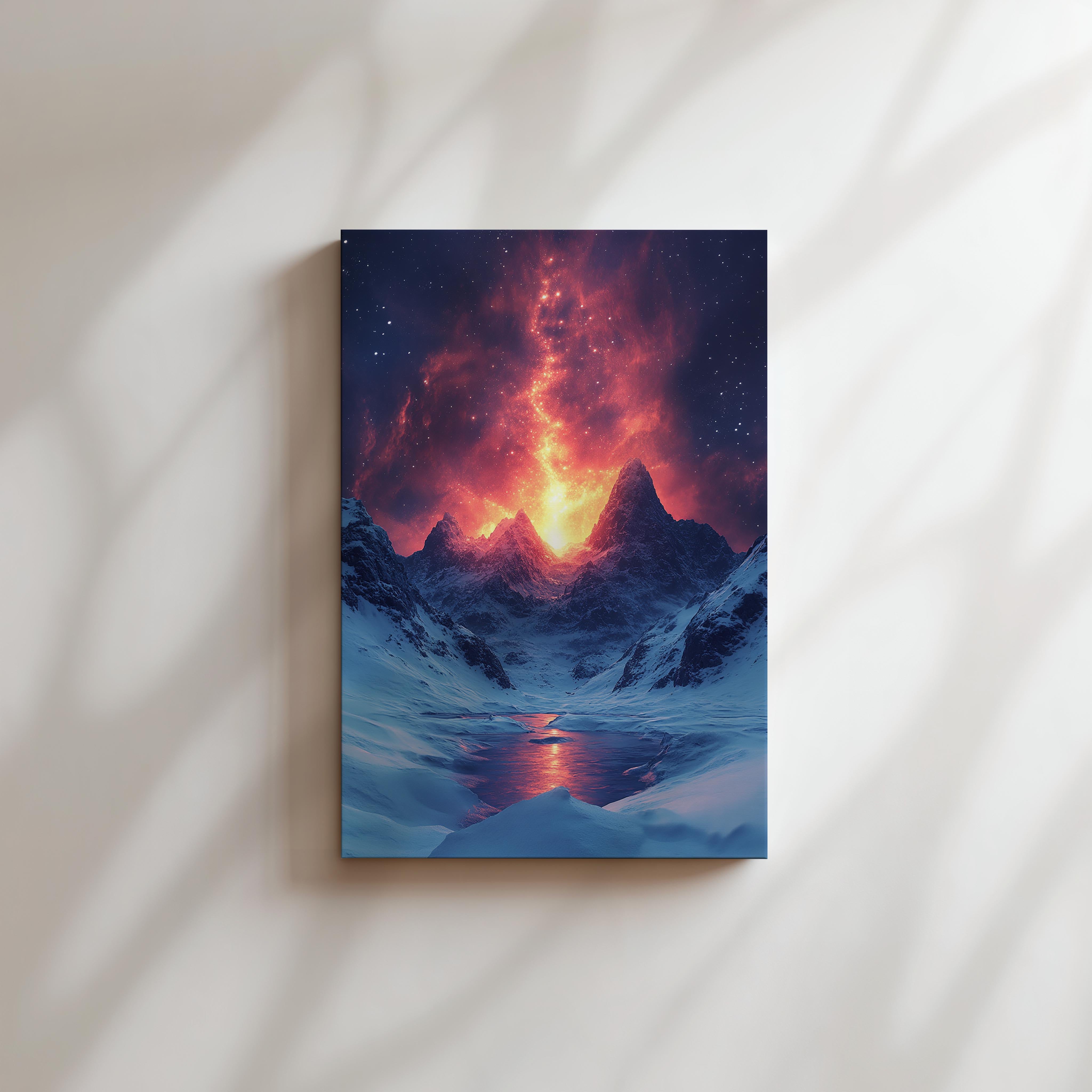 A breathtaking digital artwork capturing a frozen landscape with an erupting celestial firestorm in the distance. Towering, jagged mountains frame the glowing explosion, with embers and fiery particles drifting into the star-studded sky. The icy terrain reflects the blazing glow of the eruption, creating a surreal contrast between fire and ice. This piece is ideal for those drawn to fantasy landscapes, evoking themes of nature’s raw power and cosmic wonder. The artwork would be a perfect centerpiece for modern interiors, sci-fi enthusiasts, or anyone who appreciates dramatic, high-contrast imagery. The fusion of night sky and volcanic fire makes this scene feel otherworldly, a place where nature bends the laws of reality.