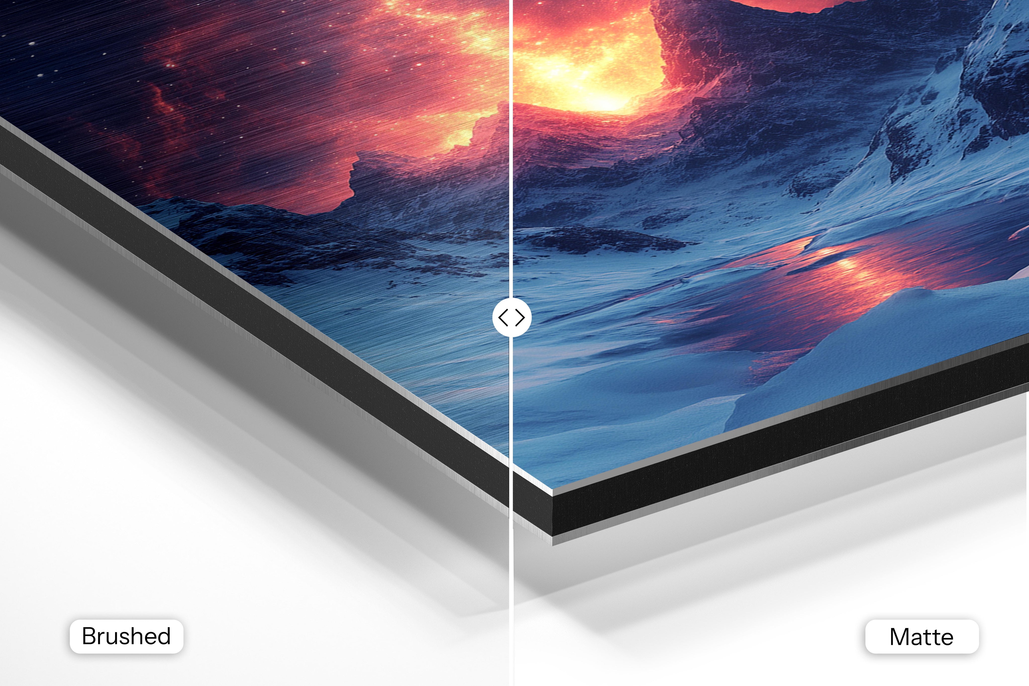 - Brushed Aluminum, on the other hand, features a raw metallic texture with visible brush strokes. Whites and highlights in your image let the silver surface show through, adding a dramatic, shimmering effect. Ideal for black-and-white images, minimalist designs, or abstract art, it creates a bold, industrial vibe with a modern edge.