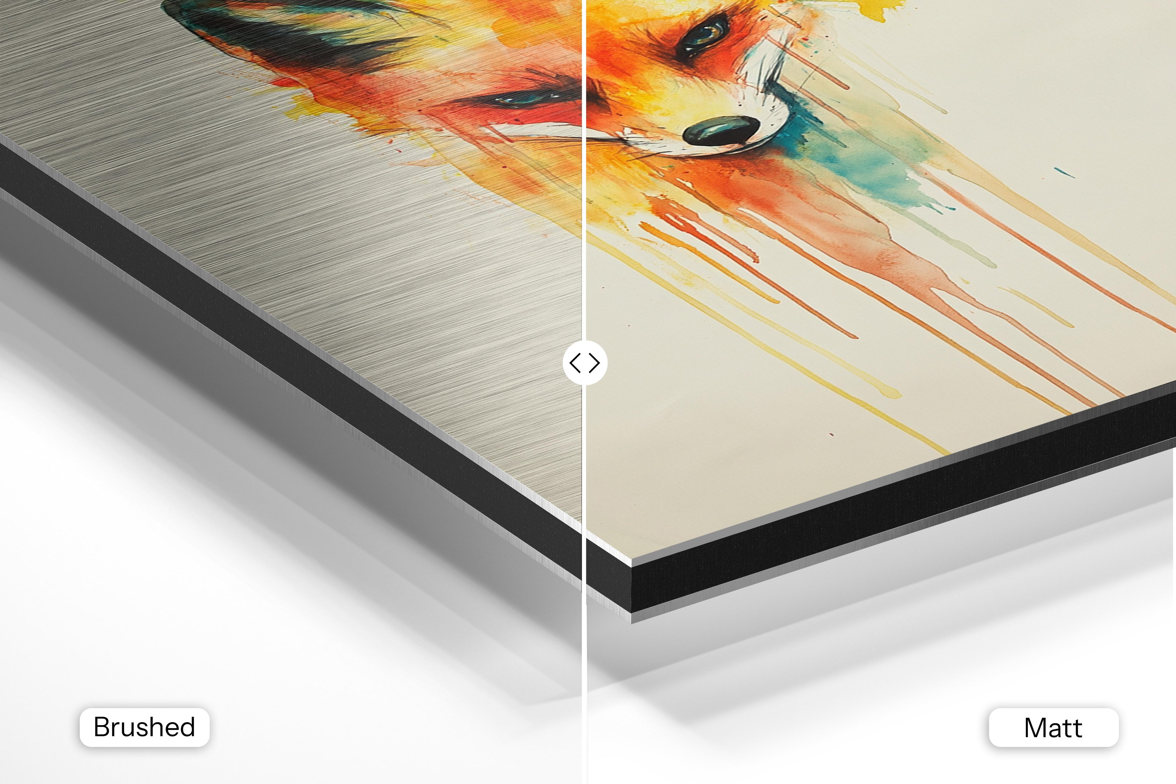 - Brushed Aluminum, on the other hand, features a raw metallic texture with visible brush strokes. Whites and highlights in your image let the silver surface show through, adding a dramatic, shimmering effect. Ideal for black-and-white images, minimalist designs, or abstract art, it creates a bold, industrial vibe with a modern edge.