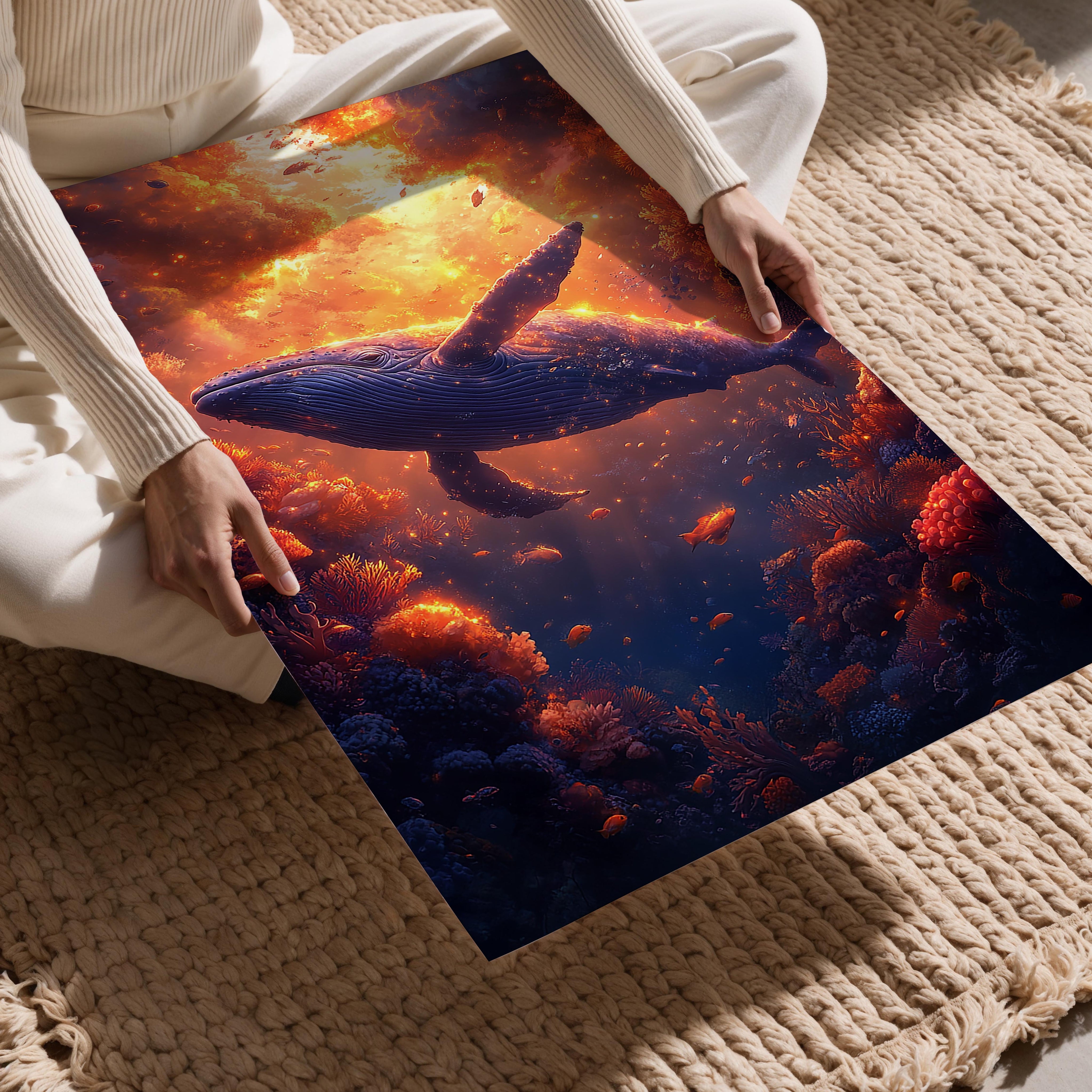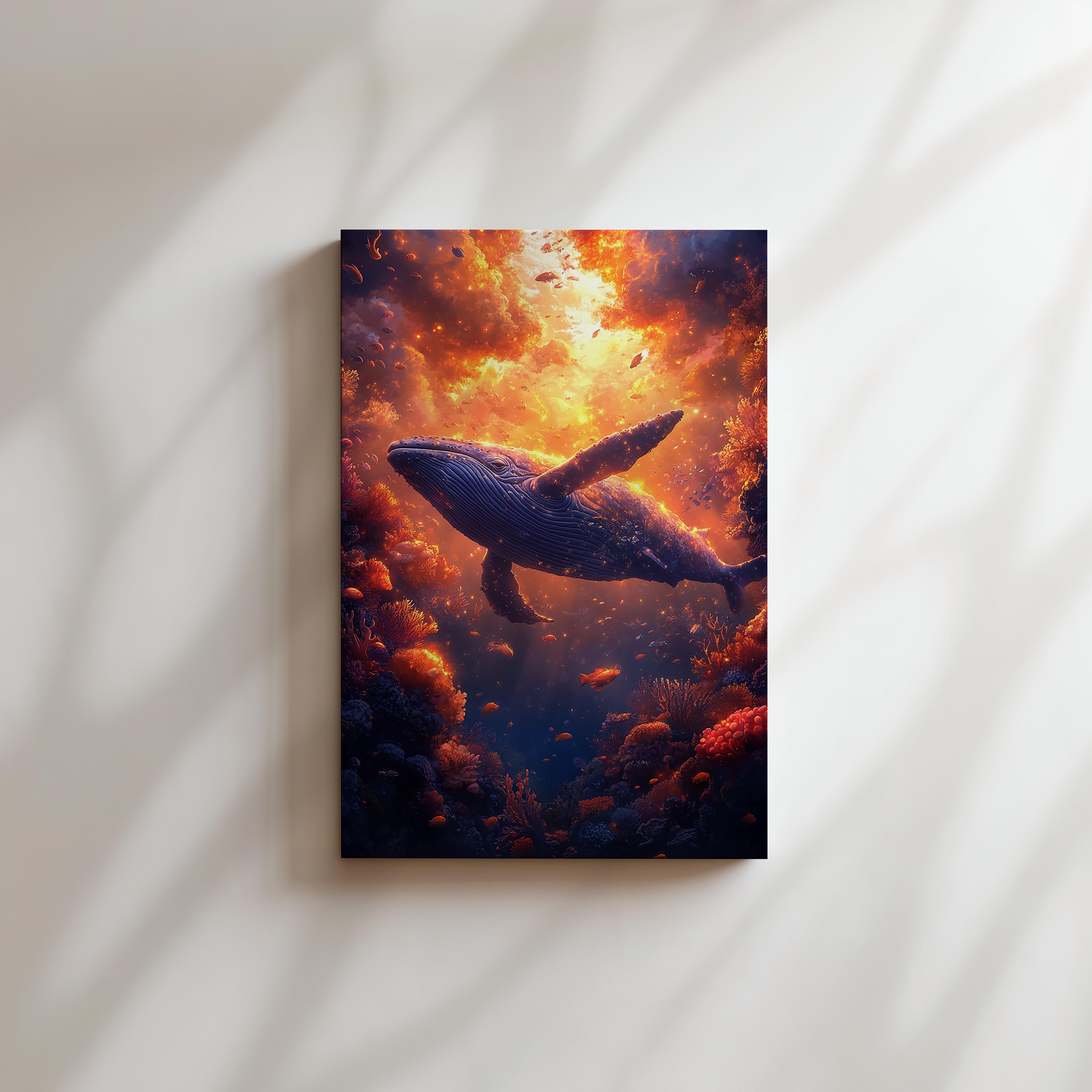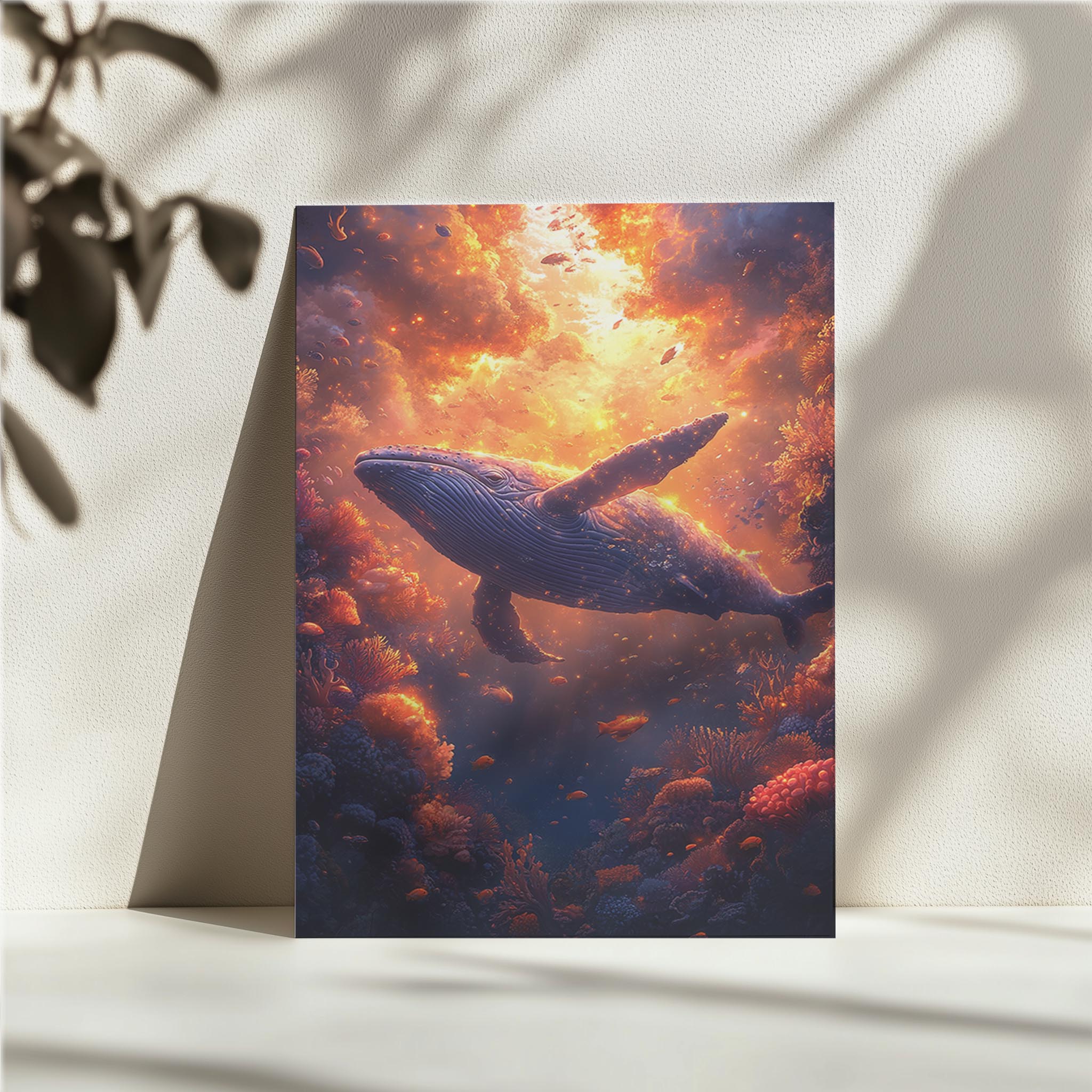 A majestic whale swims gracefully through sunlit waters, surrounded by vivid coral reefs. The golden rays shining through create a breathtaking visual that is perfect for ocean enthusiasts. This artwork suits serene spaces like living rooms, offices, or nature-themed areas, evoking a sense of calm and grandeur.