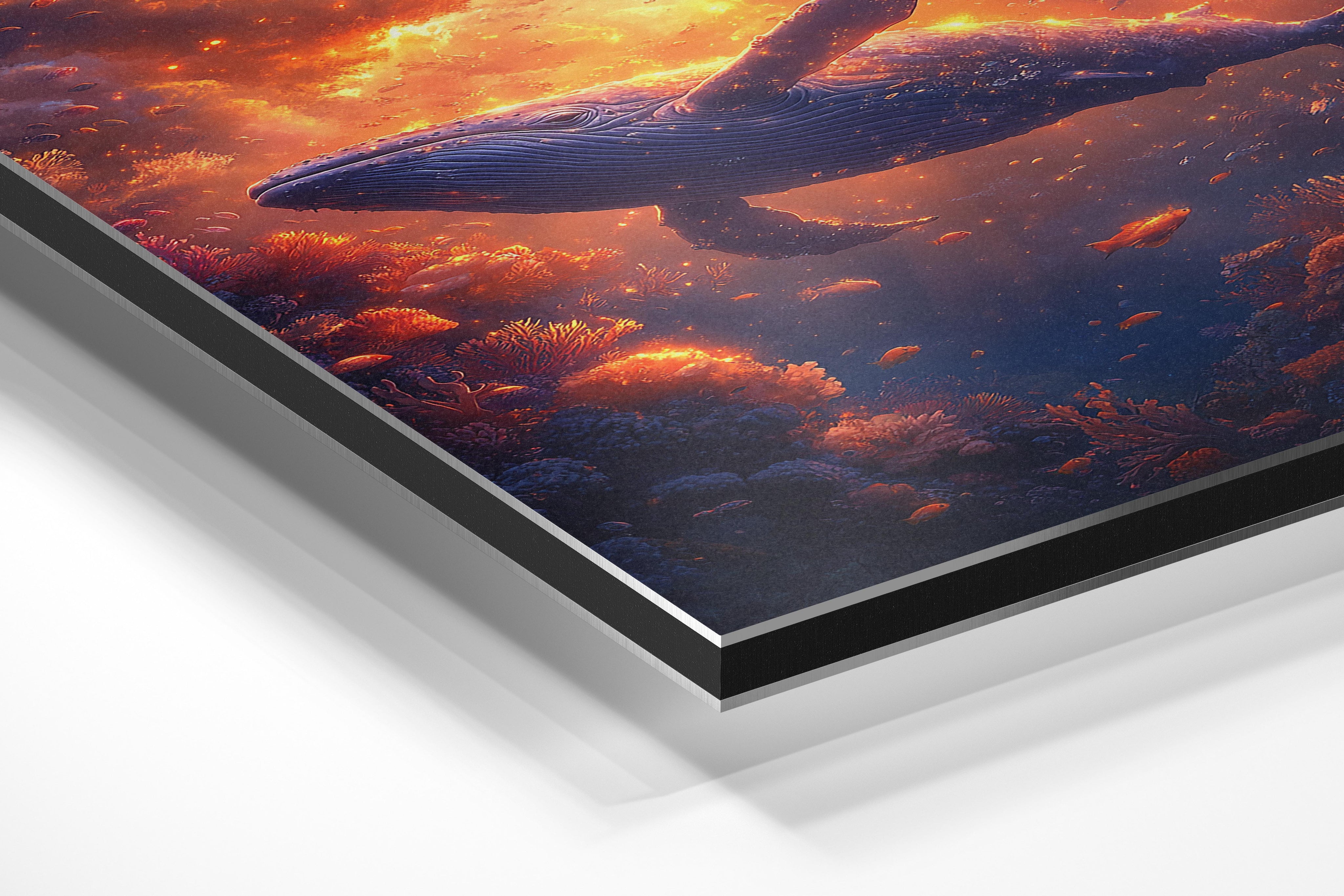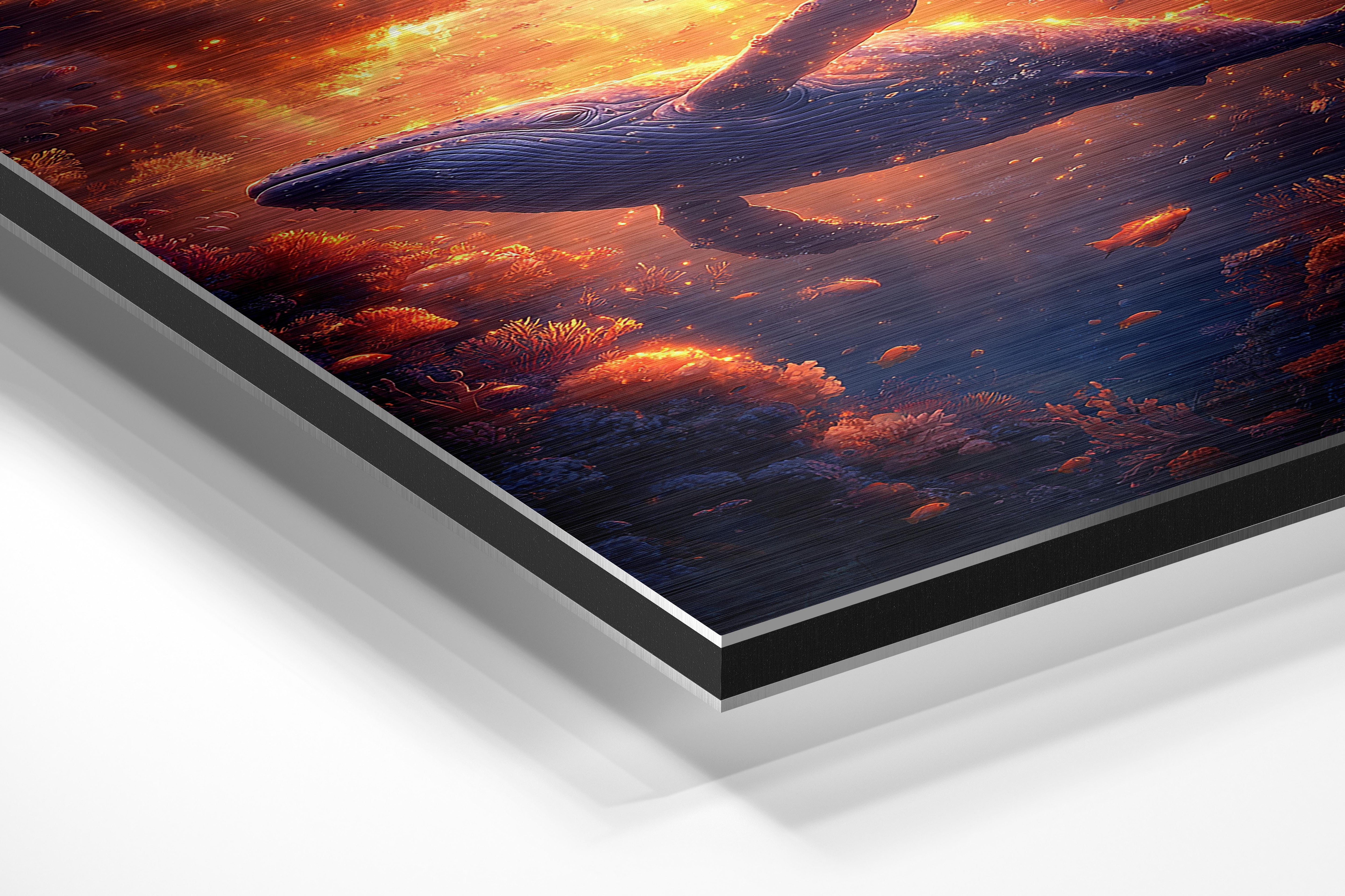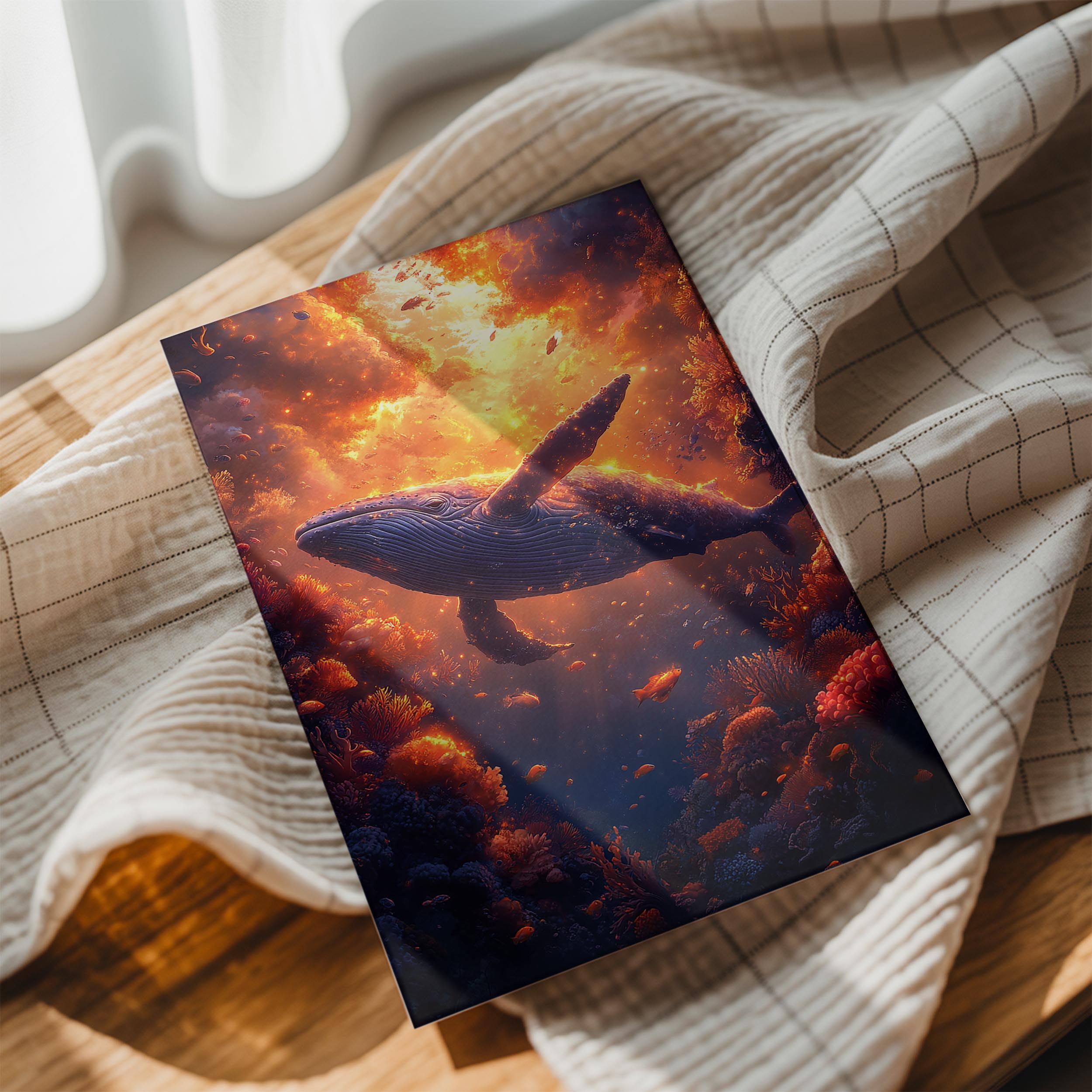 A majestic whale swims gracefully through sunlit waters, surrounded by vivid coral reefs. The golden rays shining through create a breathtaking visual that is perfect for ocean enthusiasts. This artwork suits serene spaces like living rooms, offices, or nature-themed areas, evoking a sense of calm and grandeur.