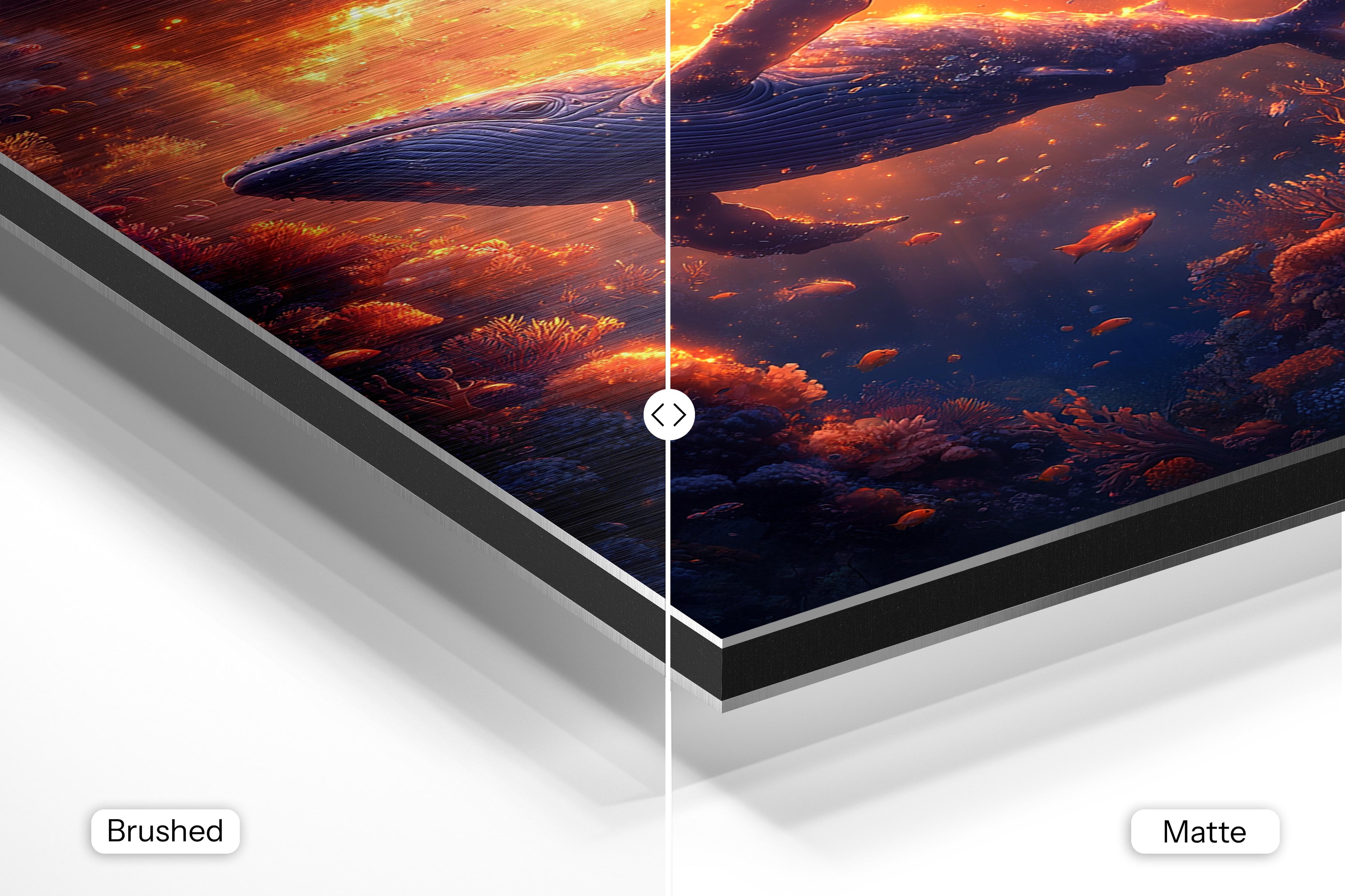 - Brushed Aluminum, on the other hand, features a raw metallic texture with visible brush strokes. Whites and highlights in your image let the silver surface show through, adding a dramatic, shimmering effect. Ideal for black-and-white images, minimalist designs, or abstract art, it creates a bold, industrial vibe with a modern edge.
