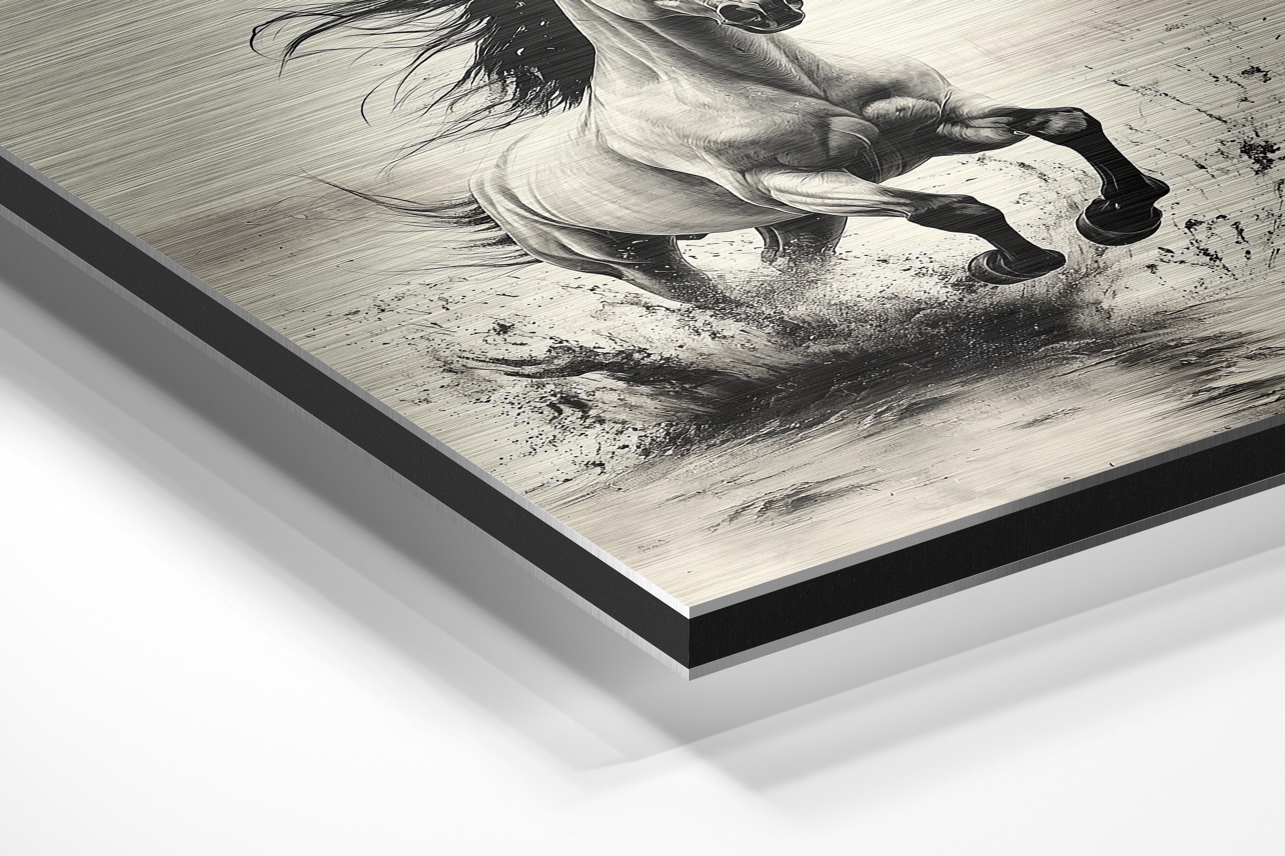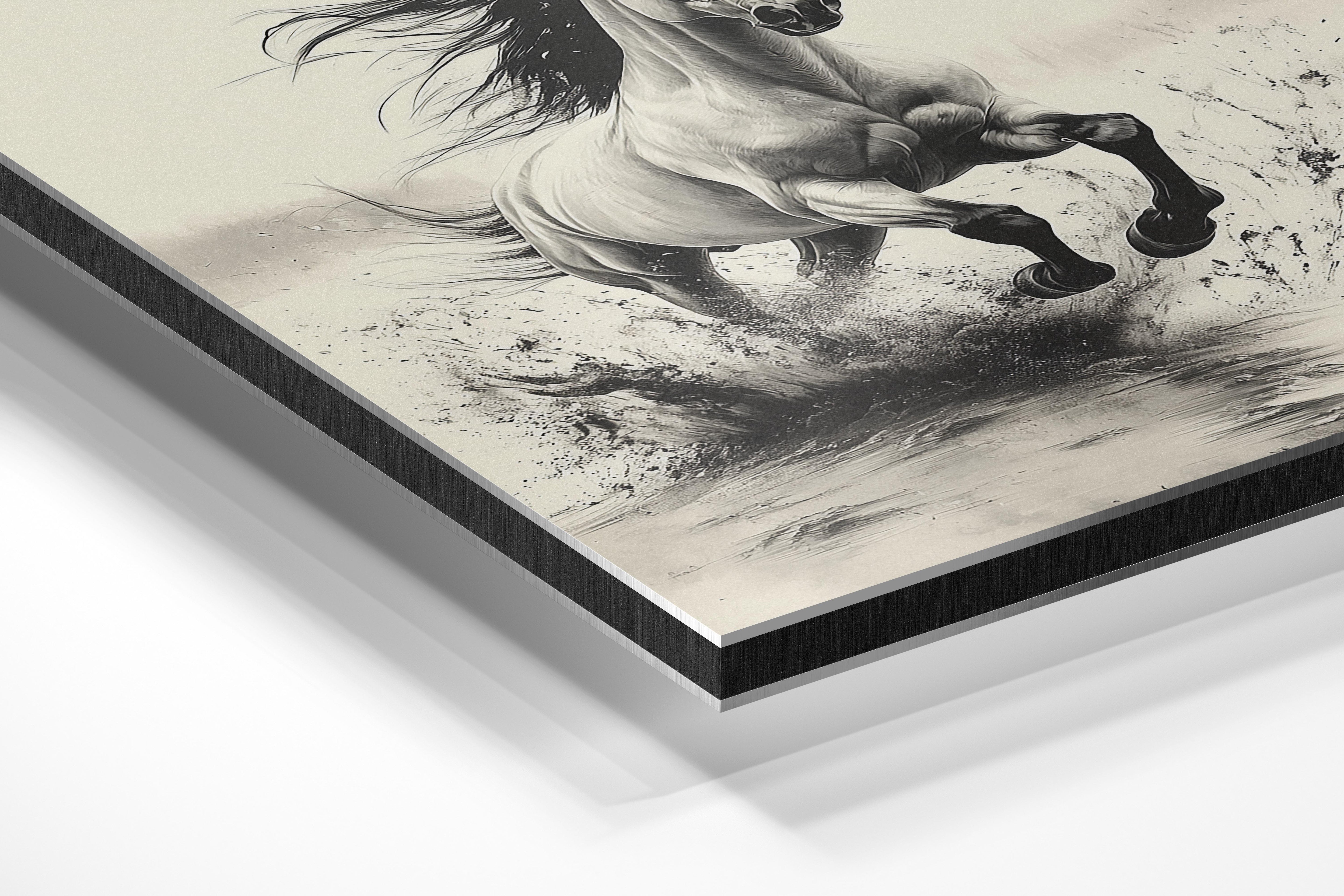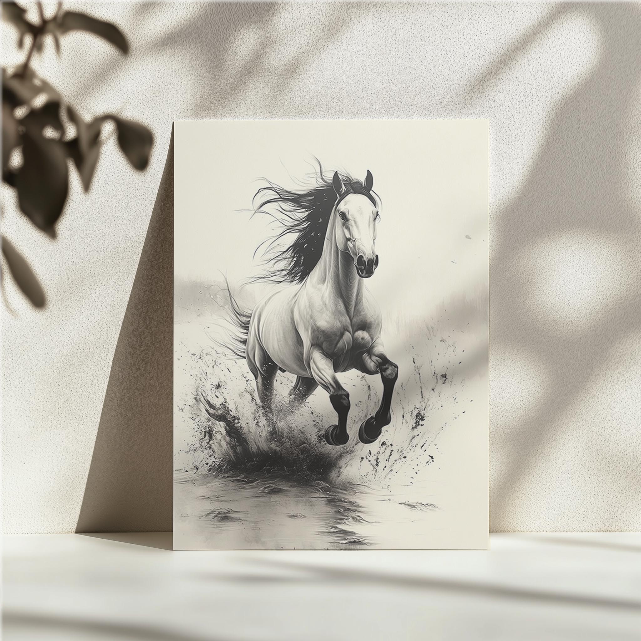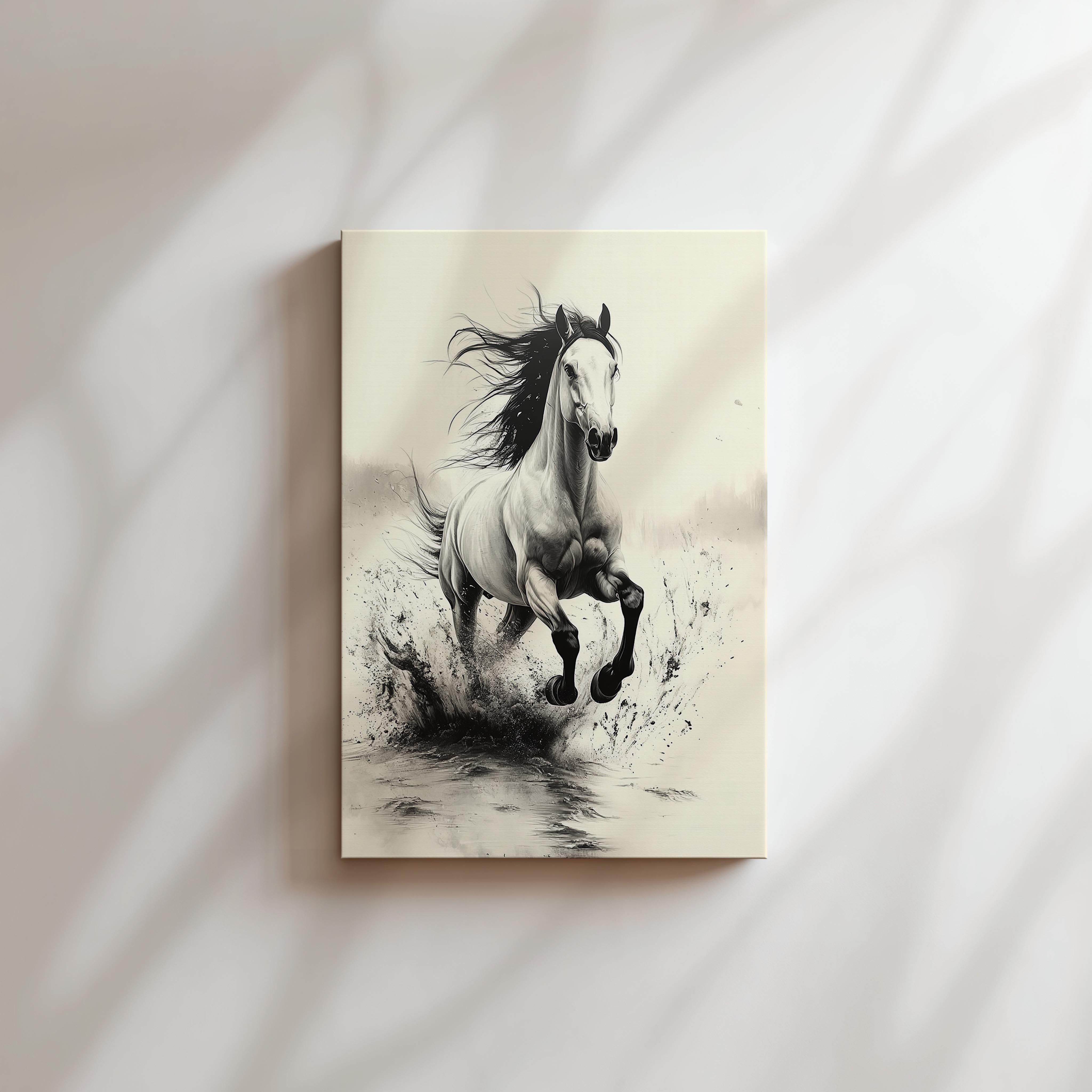 This stunning monochrome painting features a powerful white horse galloping through a shallow stream, water splashing around its strong legs. The high contrast of black and white highlights the details of the horse’s muscular form and wild mane, creating a striking composition. The energy of the piece makes it ideal for spaces that demand a sense of motion and freedom, such as an equestrian lover’s home, a rustic farmhouse setting, or a modern office looking for bold, artistic inspiration.