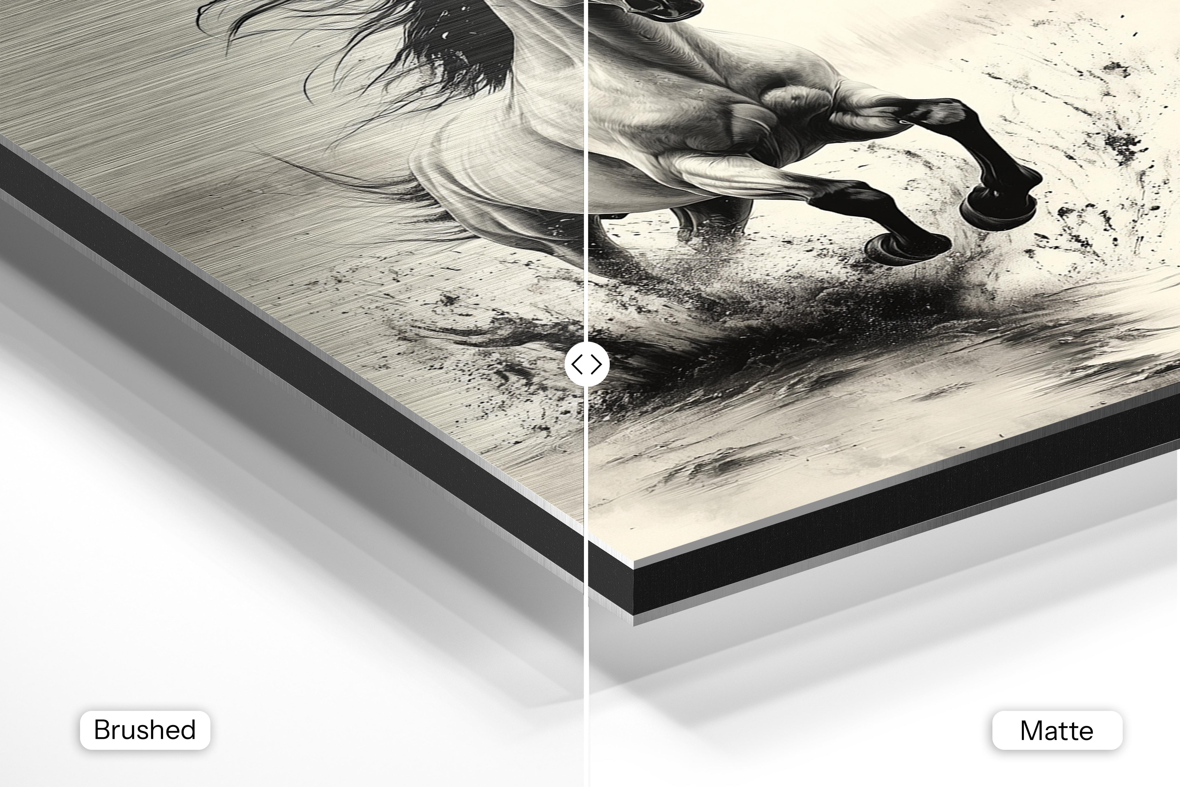 - Brushed Aluminum, on the other hand, features a raw metallic texture with visible brush strokes. Whites and highlights in your image let the silver surface show through, adding a dramatic, shimmering effect. Ideal for black-and-white images, minimalist designs, or abstract art, it creates a bold, industrial vibe with a modern edge.