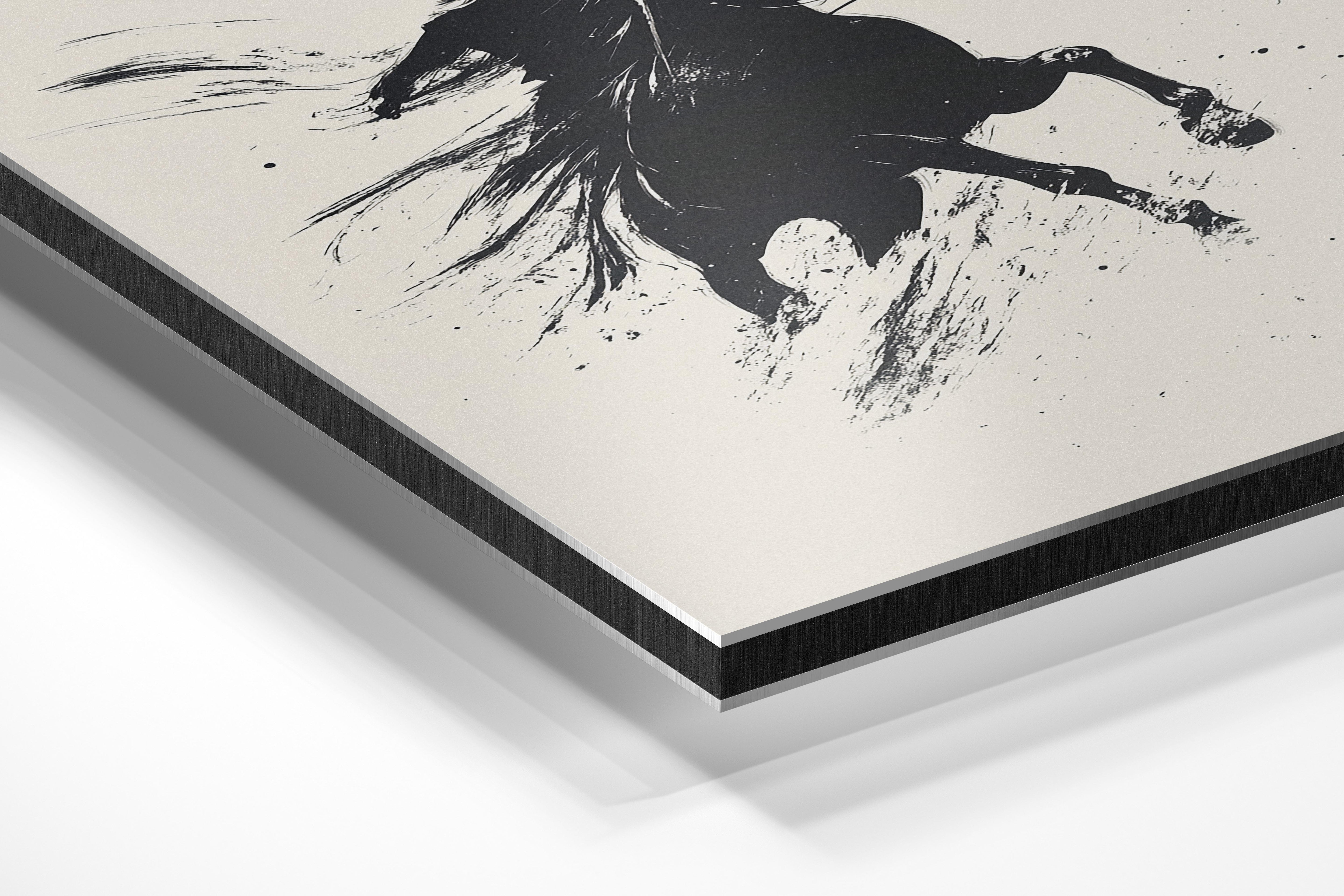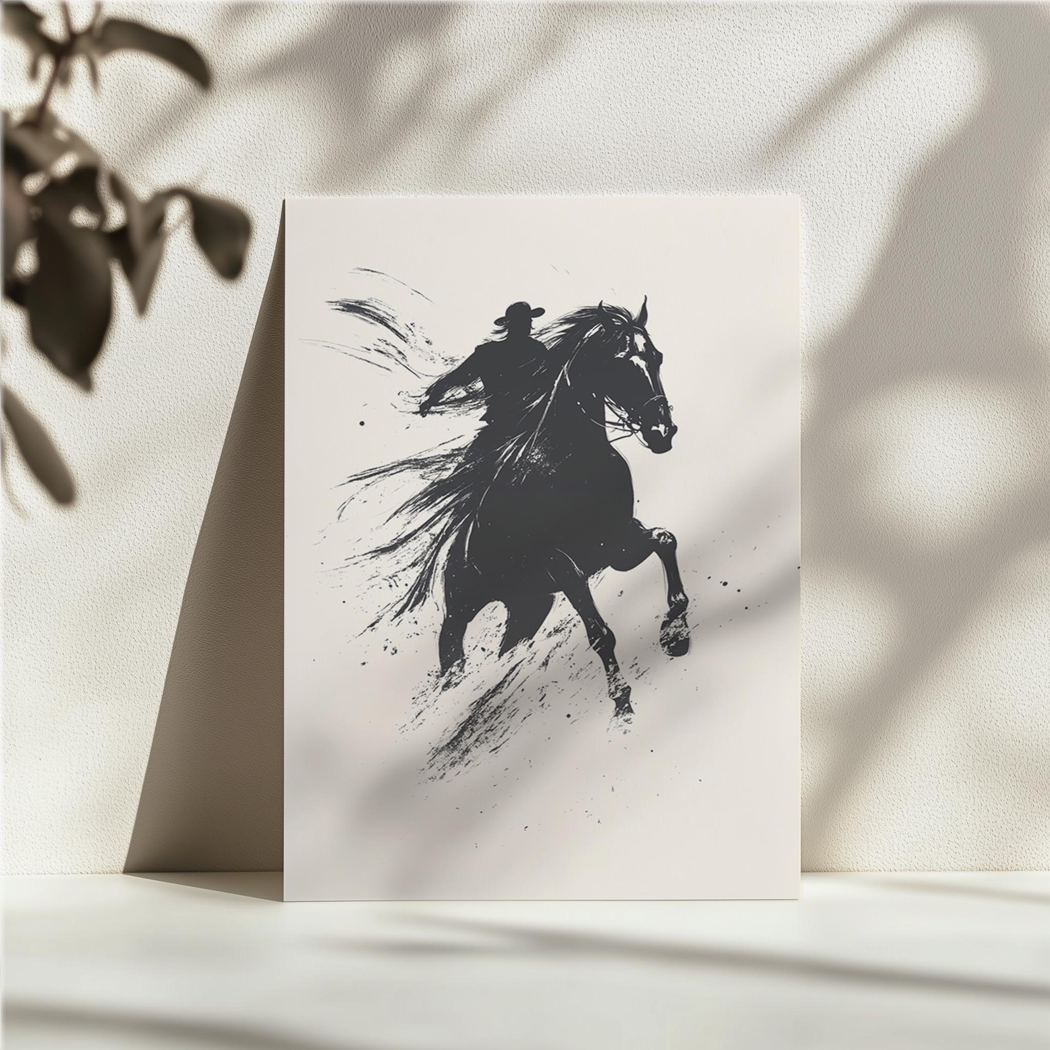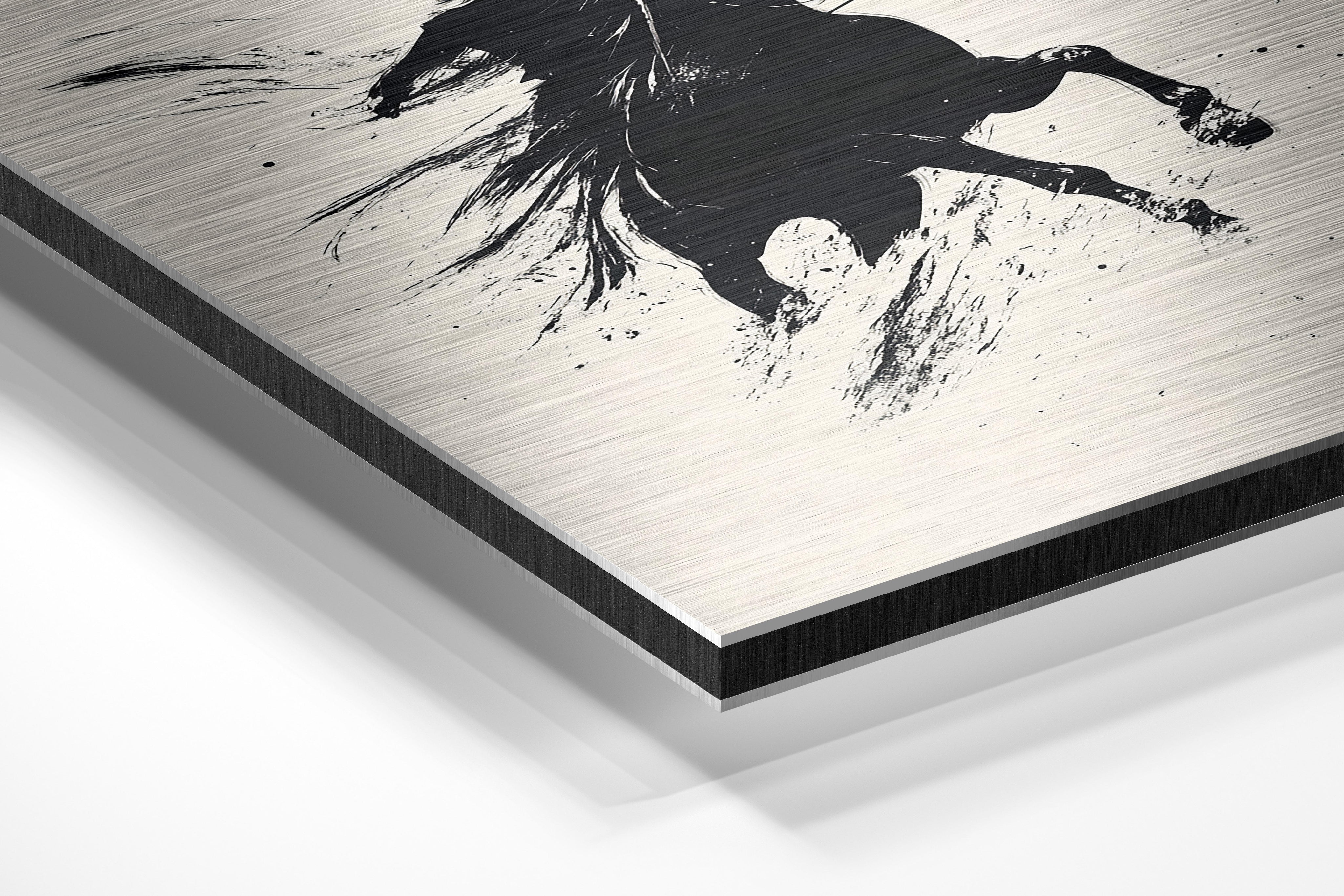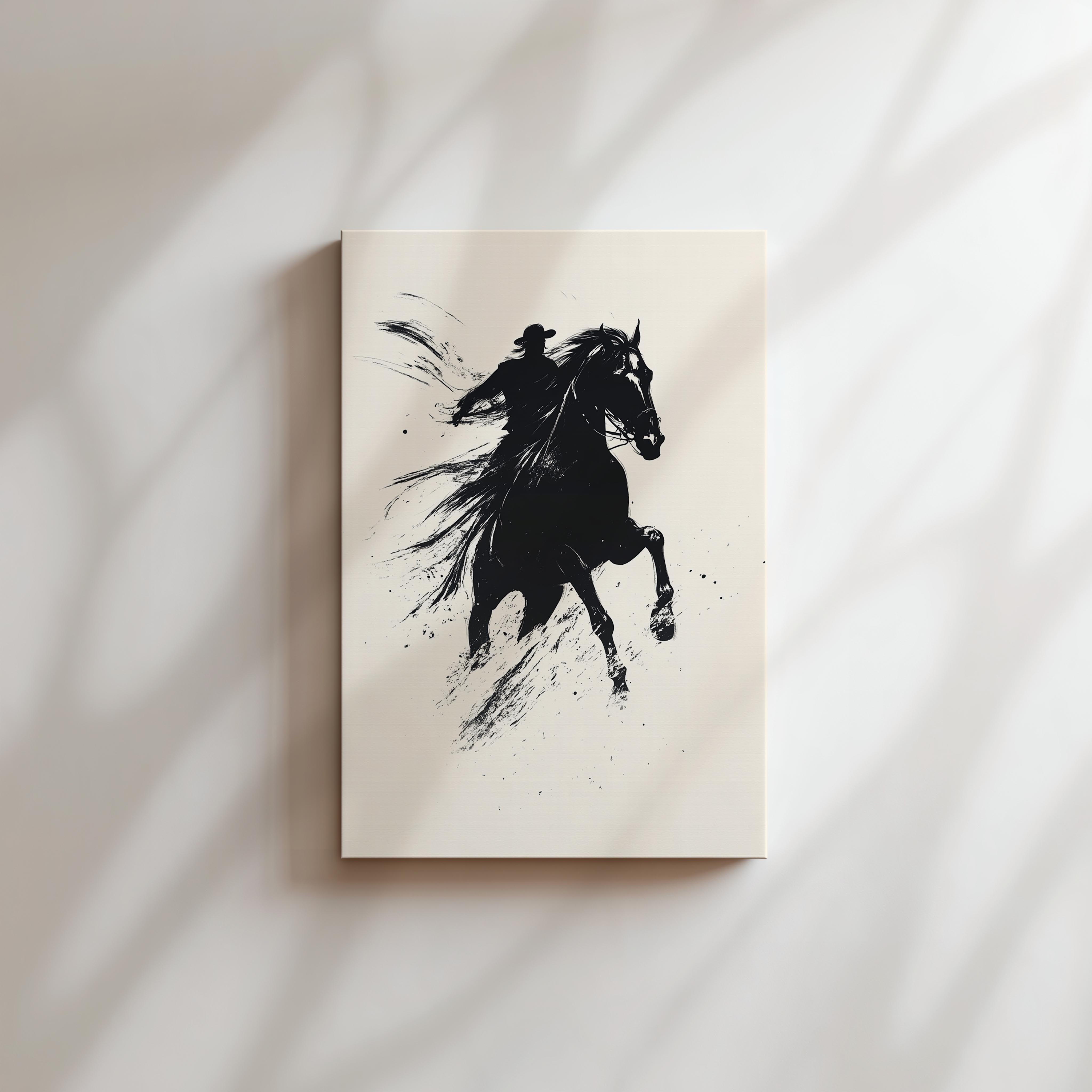 A dramatic and dynamic black-and-white ink-style illustration of a galloping horse with a determined rider. The expressive strokes and splattered ink details create a sense of raw energy and motion, making this an eye-catching piece for lovers of western themes and equestrian art. This artwork would be ideal for those who appreciate freedom, adventure, and the untamed spirit of the wild. Perfect for a modern office, ranch-style home, or art lover’s collection, this piece embodies the raw beauty of movement and power.