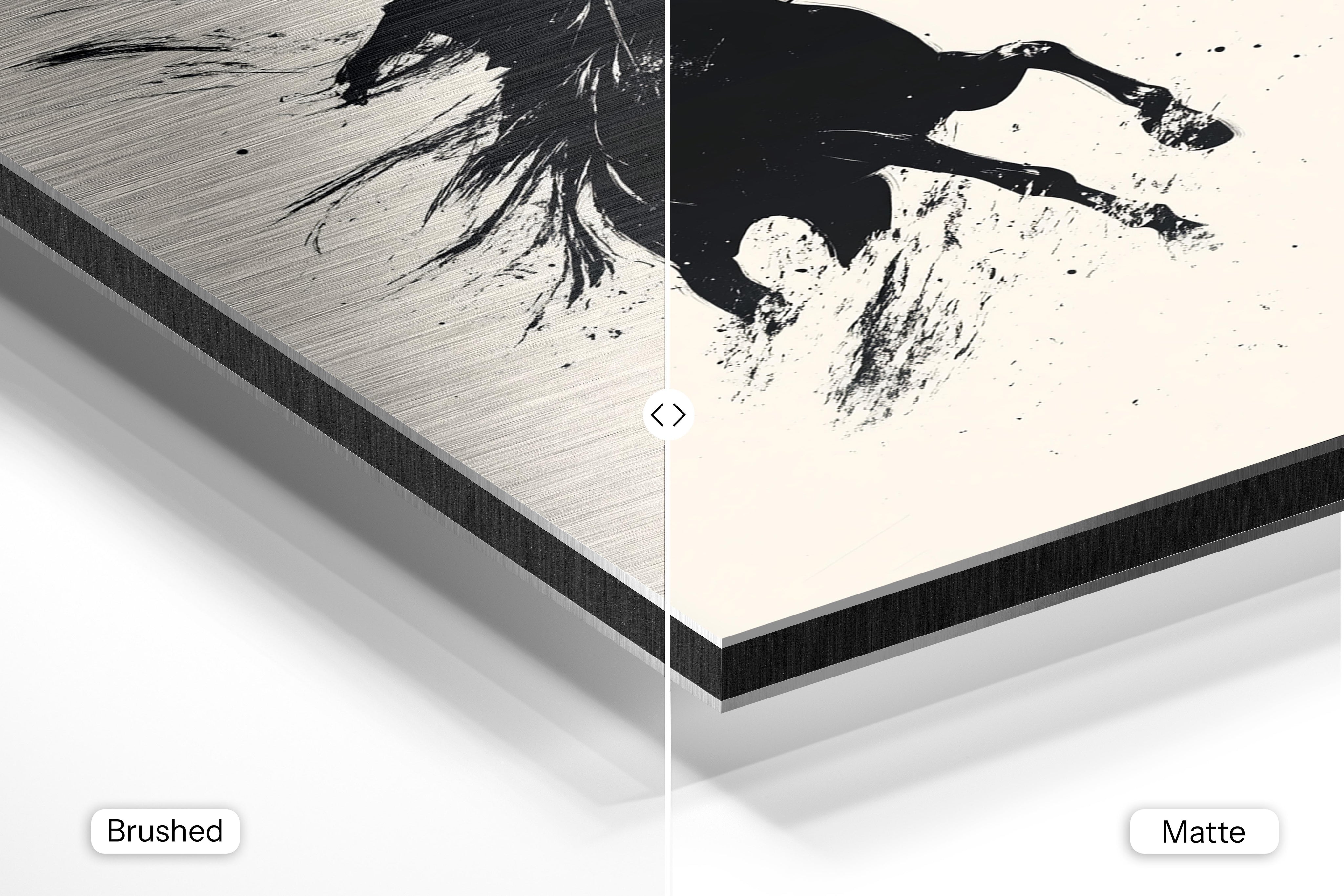 - Brushed Aluminum, on the other hand, features a raw metallic texture with visible brush strokes. Whites and highlights in your image let the silver surface show through, adding a dramatic, shimmering effect. Ideal for black-and-white images, minimalist designs, or abstract art, it creates a bold, industrial vibe with a modern edge.