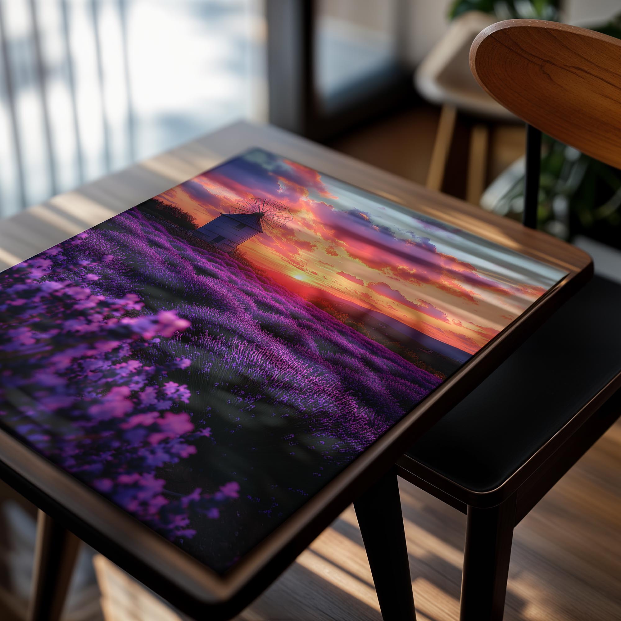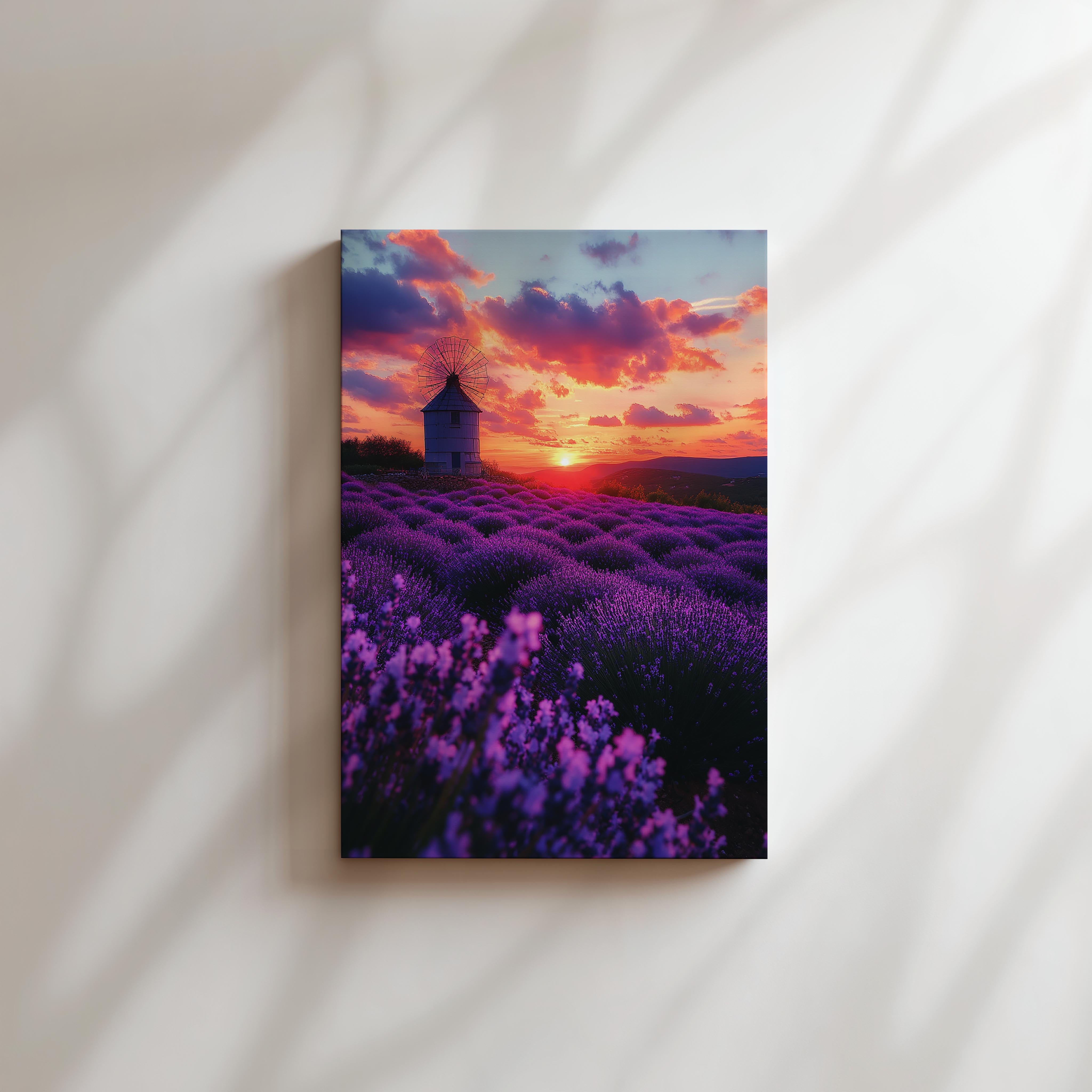 A classic windmill stands tall amidst fields of blooming lavender, illuminated by the soft glow of a setting sun. The scene’s picturesque charm and vibrant colors offer a tranquil escape, celebrating the simple yet profound beauty of countryside life. Perfect for those seeking serenity and inspiration in nature.