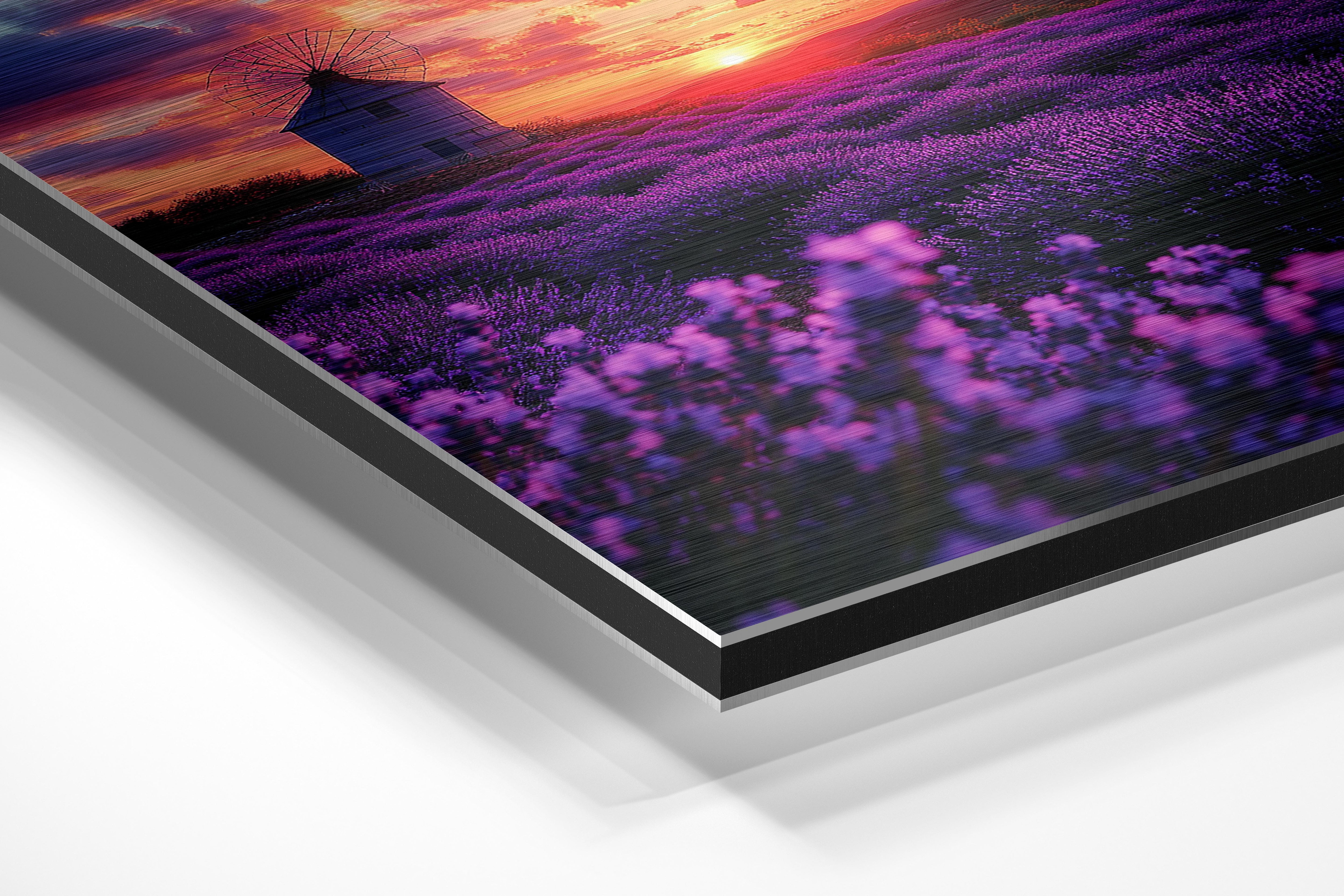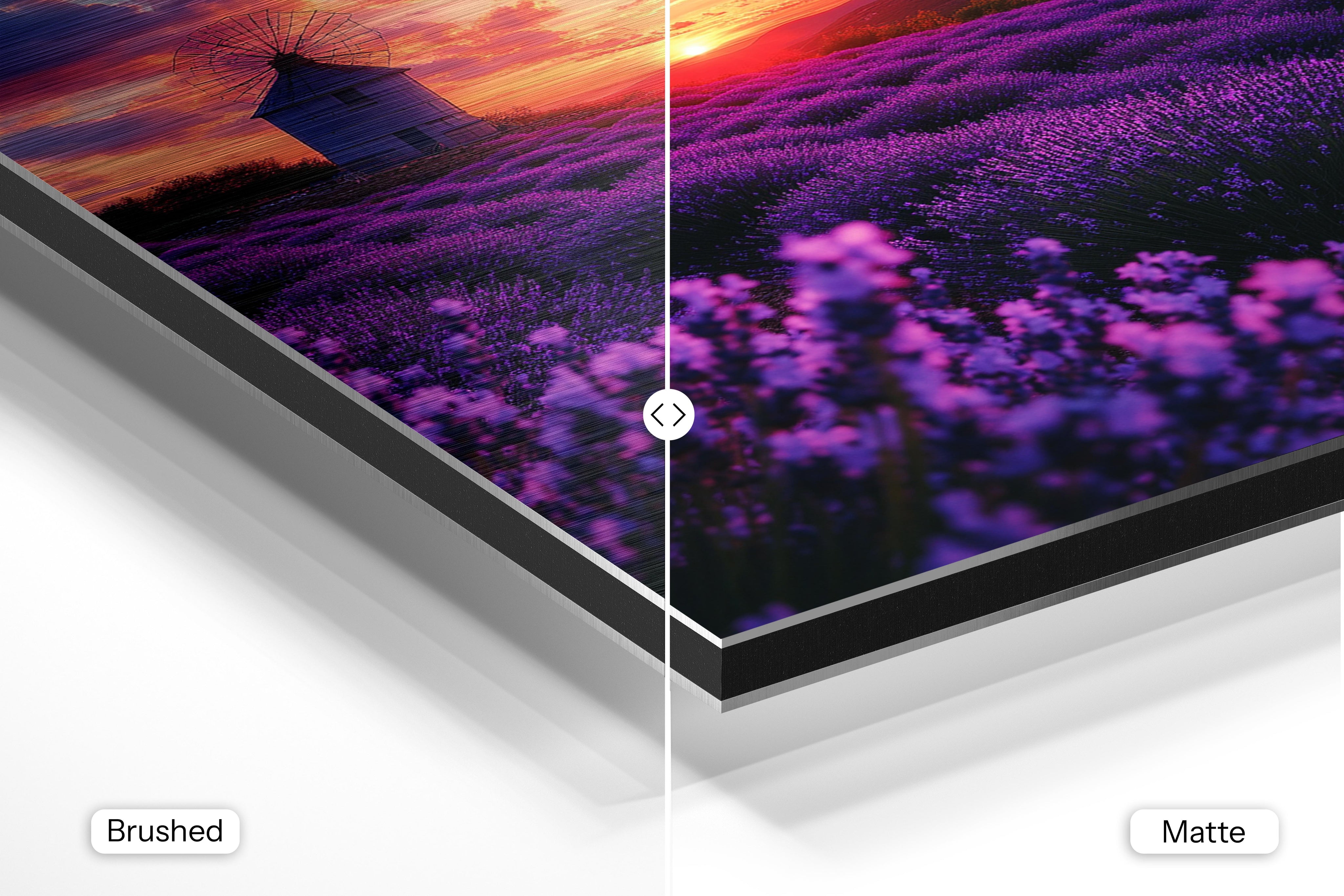 - Brushed Aluminum, on the other hand, features a raw metallic texture with visible brush strokes. Whites and highlights in your image let the silver surface show through, adding a dramatic, shimmering effect. Ideal for black-and-white images, minimalist designs, or abstract art, it creates a bold, industrial vibe with a modern edge.
